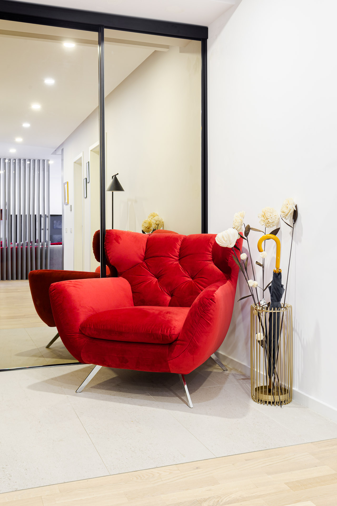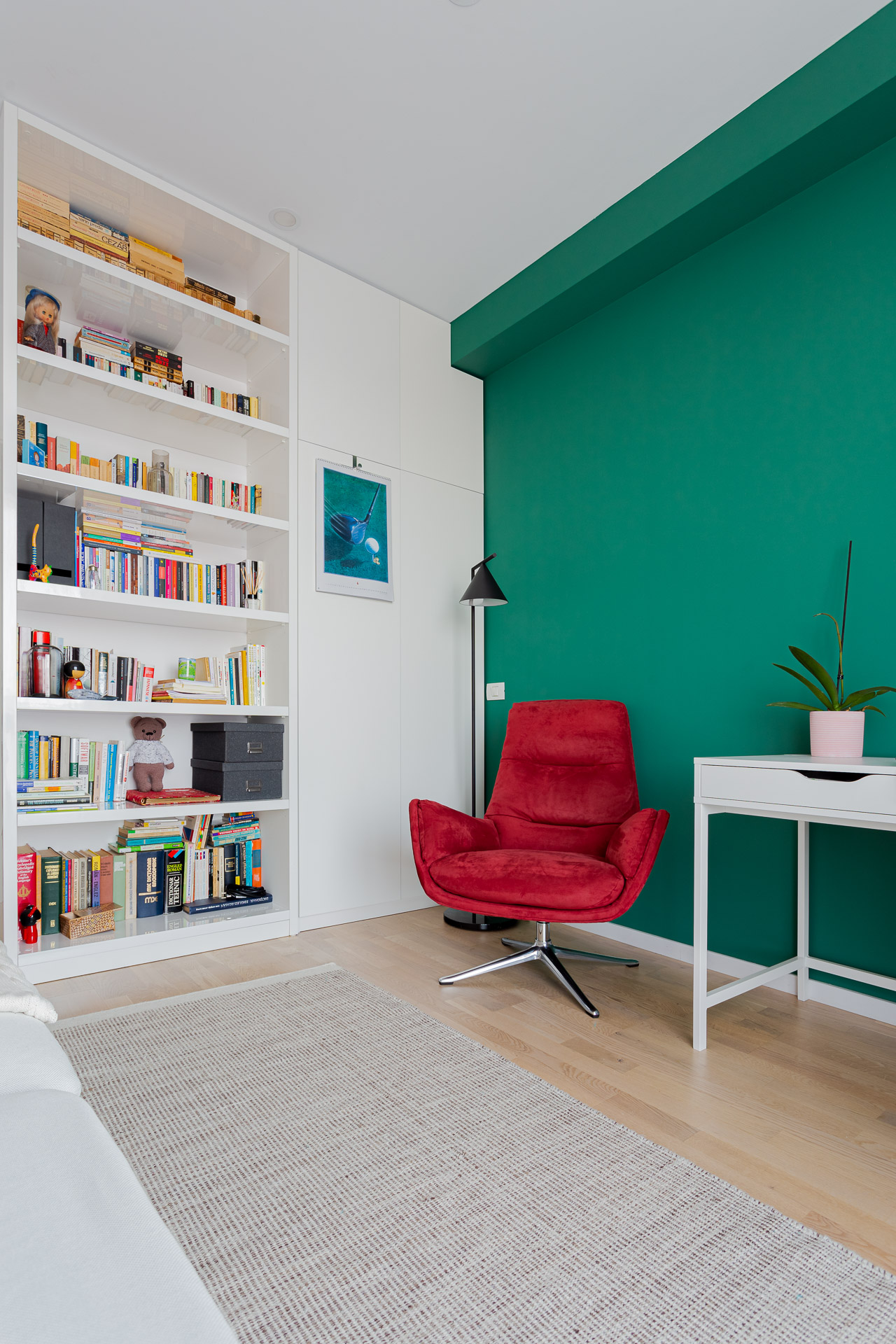 Biroul, datorită situației binecunoscute – pandemiei – a fost necesară și amenajarea unui birou, beneficiarii lucrând de acasă. Pentru birou am ales camera cea mai mică din apartament. Cromatica completează perfect restul amenajării. Mobilierul alb, canapeaua și biroul, se integrează perfect, neieșind astfel în evidență și neaglomerând spațiul. Accentele folosite sunt aceleași – roșu pentru fotoliu și draperii, corpurile de iluminat metalice, dar și peretele vopsit în verde. Am ales verdele pentru a ‘calma’ roșul folosit, și a înmlânzi un pic cromatica. Camera este și ea împărțită în zone funcționale – zona de lucru, cea a biroului, și zona de relaxare – zona canapelei și a fotoliului. Și aici, proprietarii și-au pus amprenta prin aducerea de tablouri.