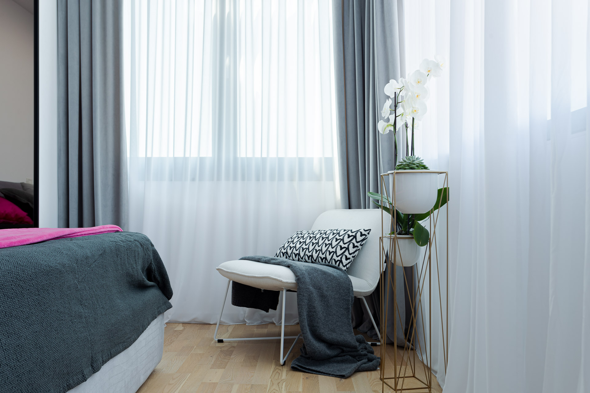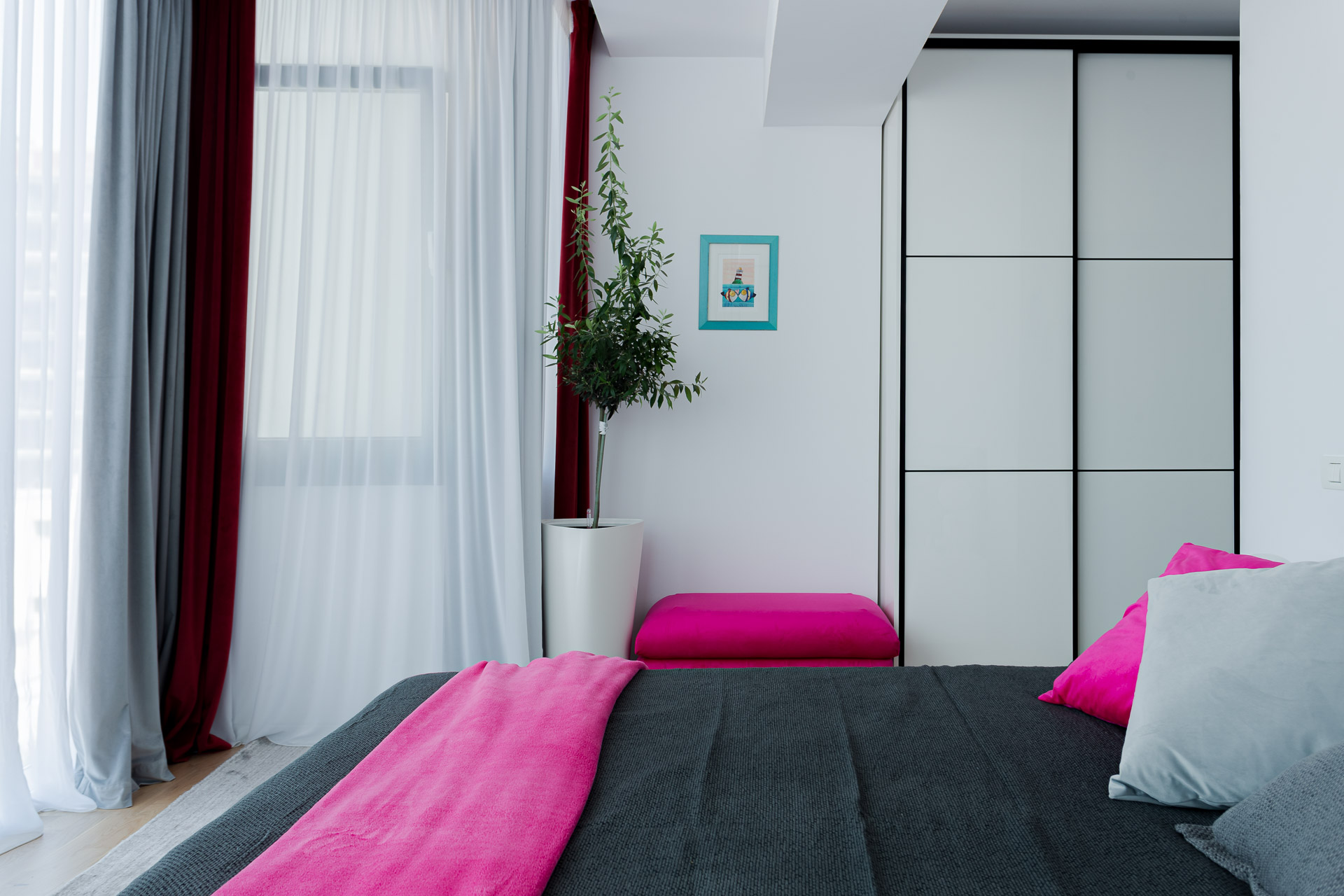 Dormitorul matrimonial continuă linia amenajării. Este gândit în tonuri de gri, pe care le-am animat cu accente colorate. Elementele majore de mobilier – patul – le-am ales gri, asemenea covorului și draperiilor. Pentru a sparge monotonia, am ales să aducem roșul din zona de living în draperie, dar și un roz fuchsia prezent în taburet și o parte de draperie. Astfel, am adăugat o notă feminină amenajării dormitorului. Fiind o cameră foarte luminoasă, am ales să nu obturăm suprafața vitrată și am ‘îmbrăcat-o’ cu o perdea din voal simplu, alb. În dormitor am împărțit funcțional spațiul, creând o zonă de dressing, zona de noapte și o zonă de relaxare. Dressingul a fost gândit eficient, astfel încât să acomodeze cât mai multe din nevoile beneficiarilor. Ușile au fost realizate din MDF alb, cu profil metalic negru, pentru accent. Pentru zona de relaxare am ales un fotoliu confortabil, alb, care să nu iasă foarte mult în evidență. În dormitor am ales să adăugăm și câteva plante verzi, pentru a aduce un pic din natură în interiorul casei. Și aici, ca și în dining, am ales să finisăm tavanul cu o vopsea decorativă culoarea betonului pentru a aduce un plus de dramatism amenajării.