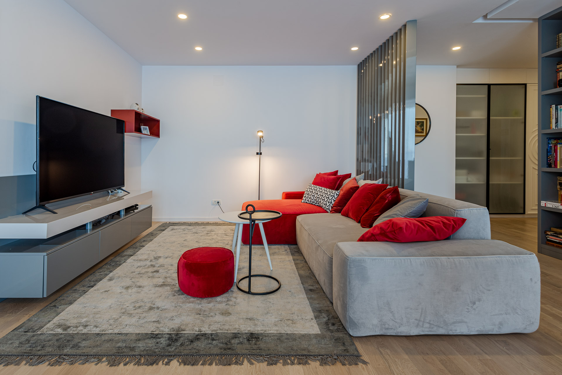 Livingul constituie unul dintre punctele de interes ale amenajării. Având și bucătărie deschisă, a trebuit să găsim echilibrul perfect între aceste două funcțiuni. Astfel, am ales pentru zona de living/relaxare un mobilier din MDF gri, creat la comandă după specificațiile noastre. Pentru a separa livingul de hol am optat pentru un riflaj, tot gri, astfel delimitând zonele. Am ales o canapea confortabilă, gri, iar o parte din aceasta am decis să o comandăm roșie pentru a aduce un accent în această zonă și a sparge un pic monotonia creată de griurile din jur.