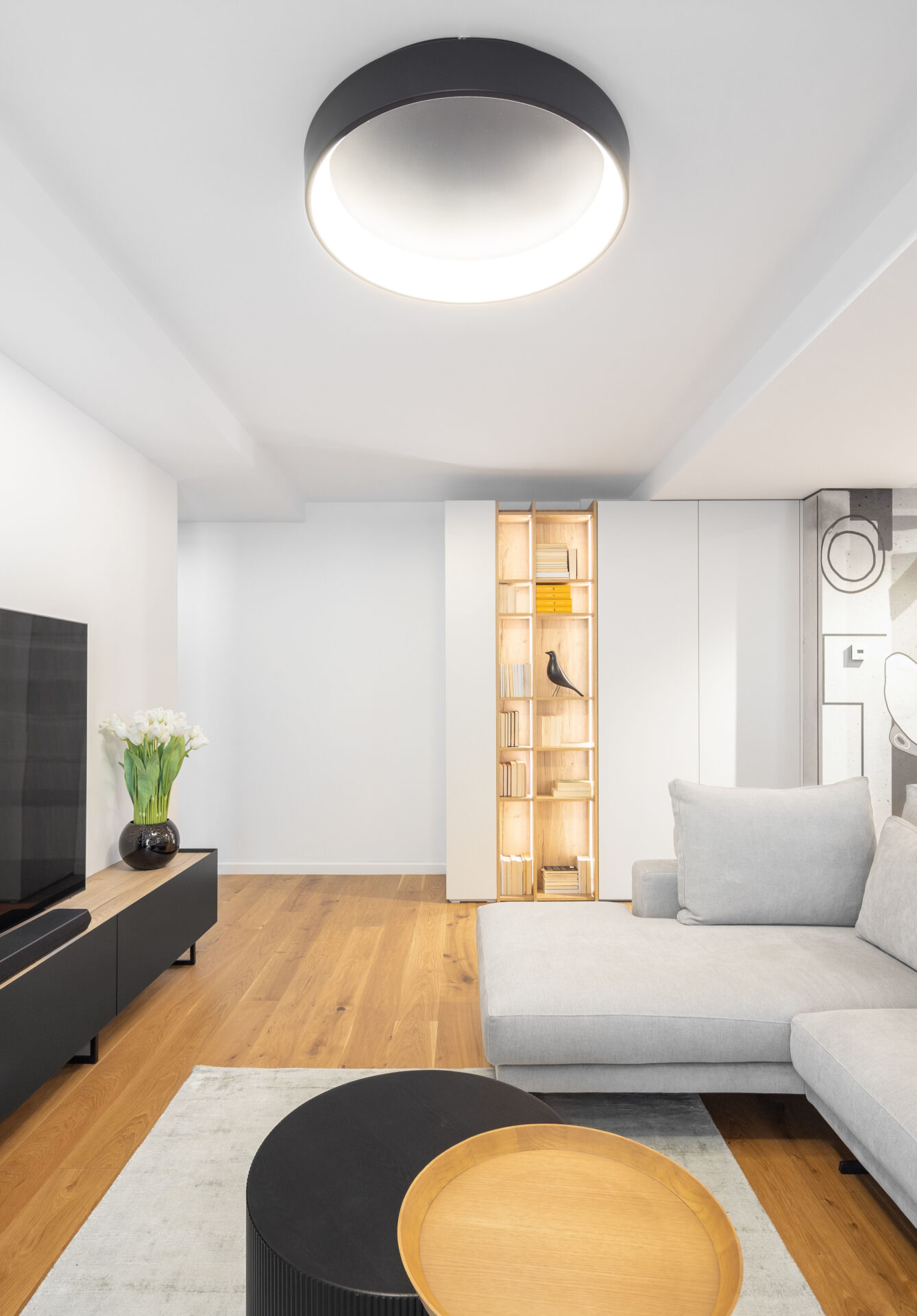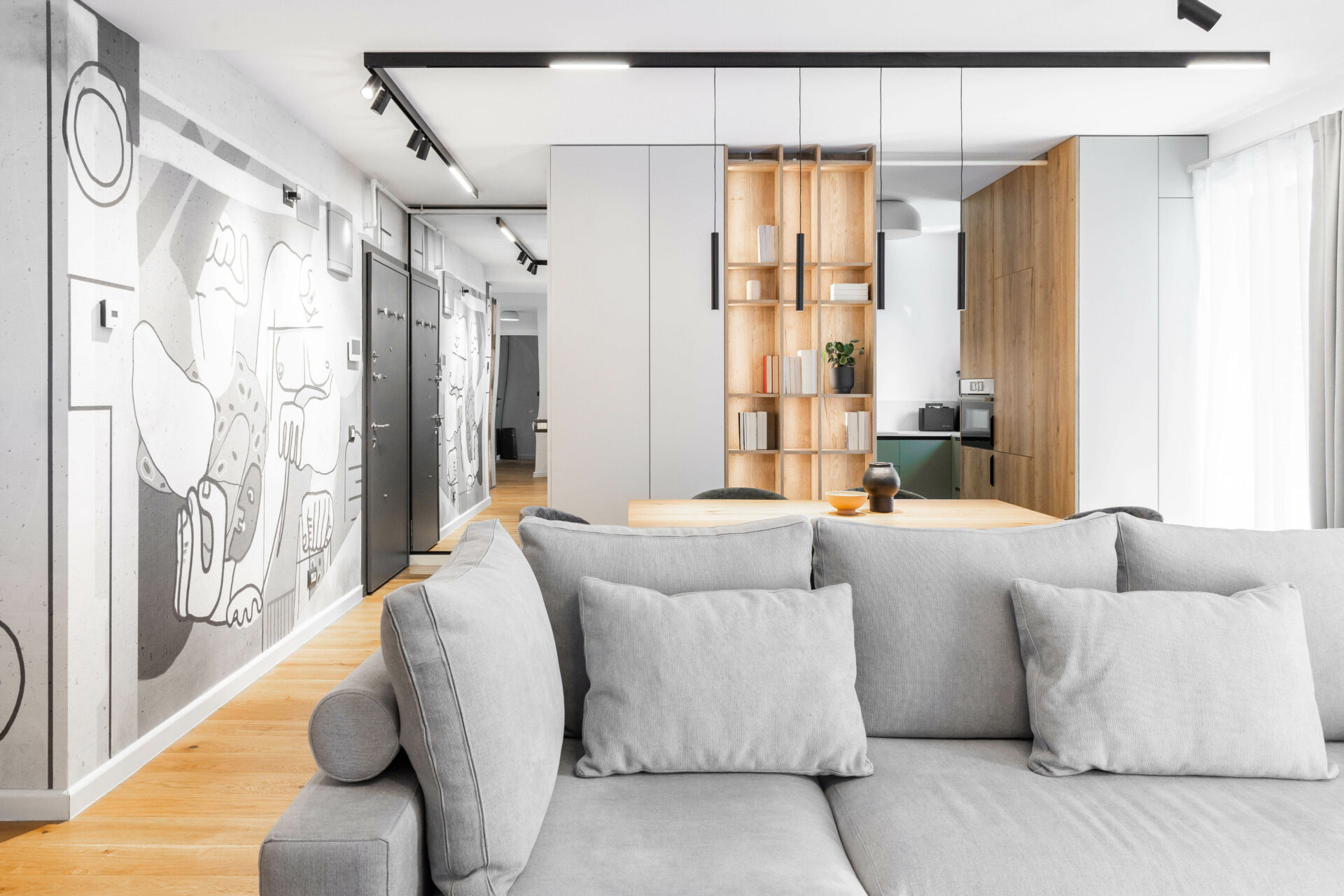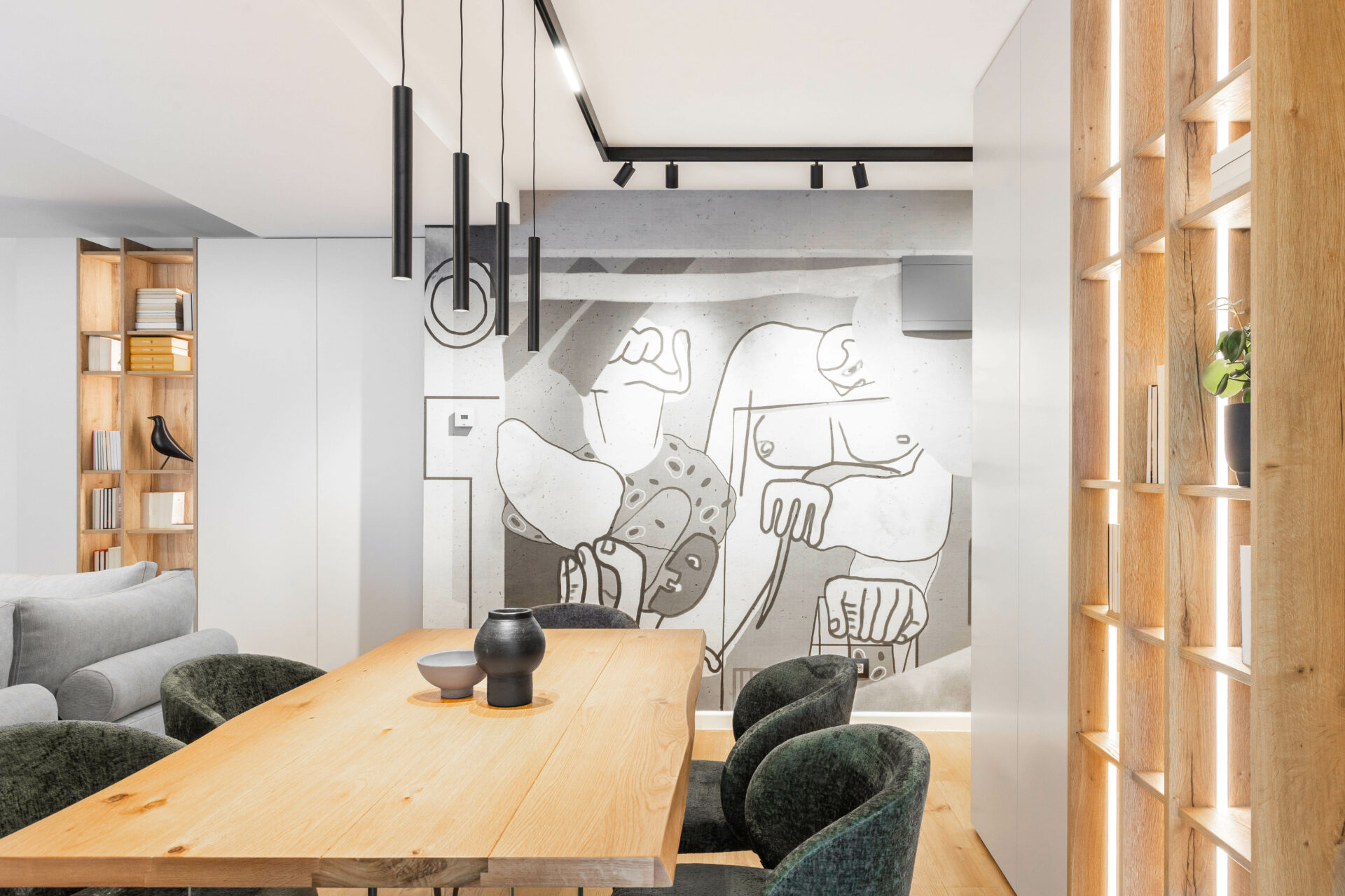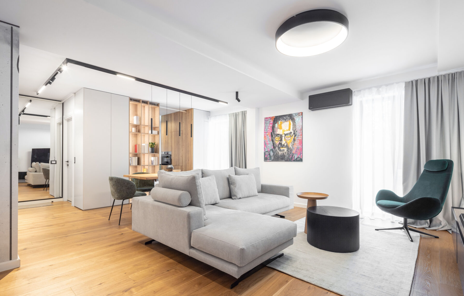 Peretele lung al holului de acces, având o prezență puternică în spațiul zonei de zi, a fost transformat într-un perete de accent „expozițional”, prin alegerea unui tapet cu un model puternic decorativ. Oglinda (pe toata înălțimea) din capătul holului dă senzația de continuitate spațiului, prelungind și oglindind „muralul” decorativ. Corpurile de iluminat au un rol foarte important în definirea și conturarea spațiilor: – plafoniera circulară cu diametru mare marchează centrul spațiului de relaxare din jurul canapelei – șina în formă L accentuează parcursul spațiului, iar cele trei tipuri de spoturi atașate șinei sunt funcțional alese: spoturi liniare pentru iluminatul general, spoturile cilindrice direcționate pentru luminarea de accent a peretelui decor și spoturile suspendate ce marchează locul de luat masa. Decorul pereților oferă personalitate spațiului: – (living) tapetul cu model decorativ, ca o operă de artă într-un muzeu; – (dormitor master) tapetul cu aspect ciment: atmosferă sobră, dar în același timp serenă; – (dormitor oaspeți) tapetul vegetal te transpune in liniștea naturii. Linia generală cromatică a mobilierului custom, în tonuri calde de lemn natur și griuri luminoase, devine un fundal deschis pentru piesele de mobilier atent alese cu forme fluide și în culori accent (verde, negru).
