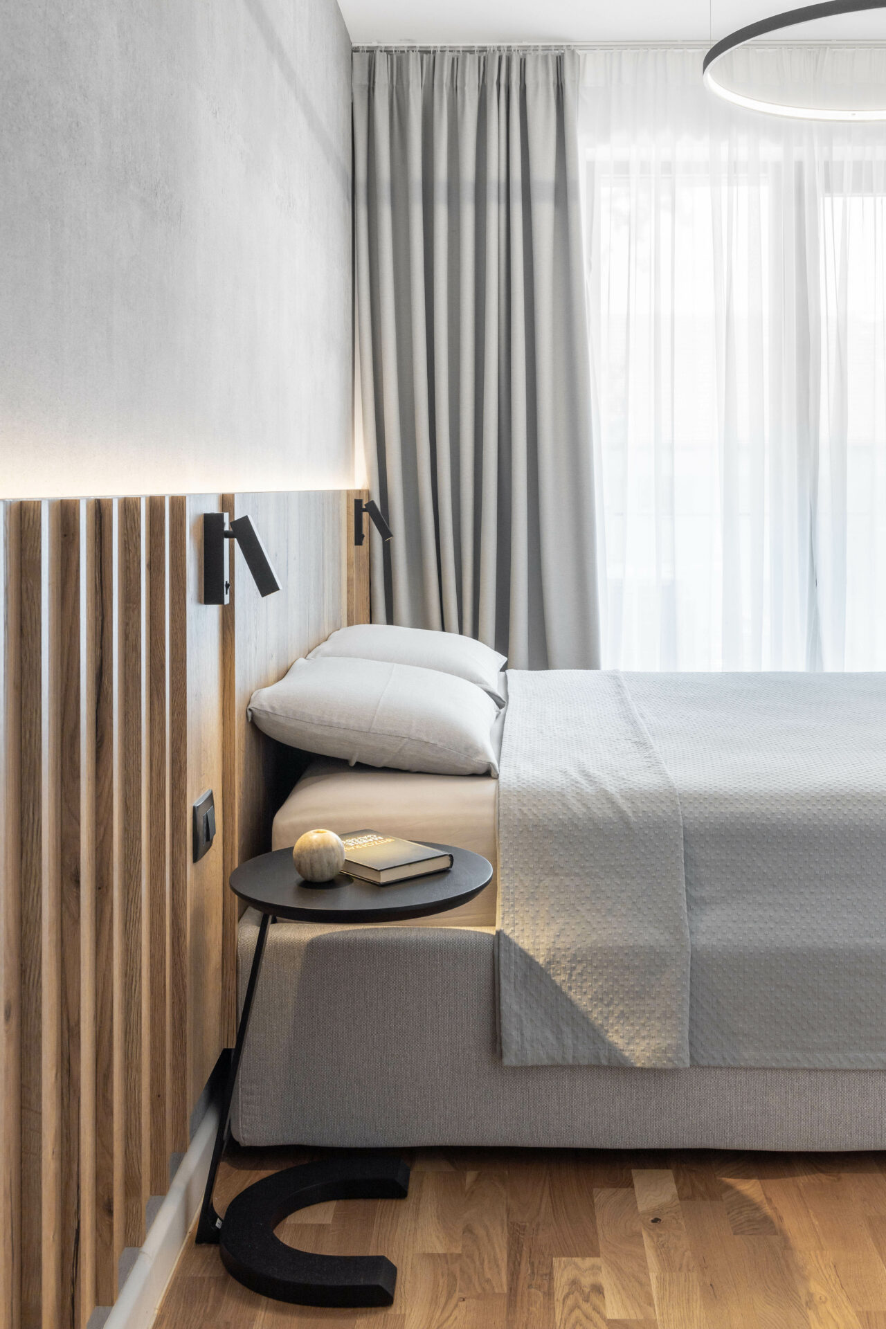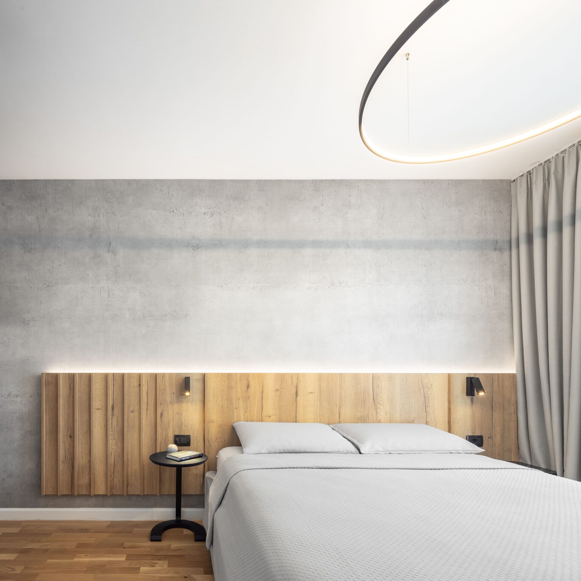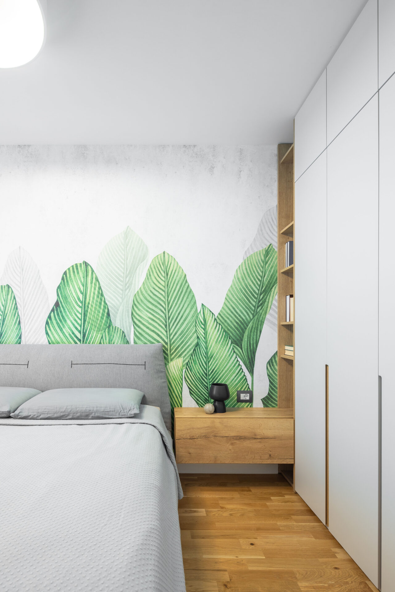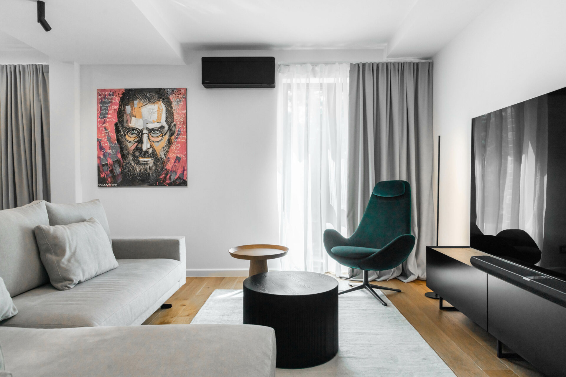 Peretele lung al holului de acces, având o prezență puternică în spațiul zonei de zi, a fost transformat într-un perete de accent „expozițional”, prin alegerea unui tapet cu un model puternic decorativ. Oglinda (pe toata înălțimea) din capătul holului dă senzația de continuitate spațiului, prelungind și oglindind „muralul” decorativ. Corpurile de iluminat au un rol foarte important în definirea și conturarea spațiilor: – plafoniera circulară cu diametru mare marchează centrul spațiului de relaxare din jurul canapelei – șina în formă L accentuează parcursul spațiului, iar cele trei tipuri de spoturi atașate șinei sunt funcțional alese: spoturi liniare pentru iluminatul general, spoturile cilindrice direcționate pentru luminarea de accent a peretelui decor și spoturile suspendate ce marchează locul de luat masa. Decorul pereților oferă personalitate spațiului: – (living) tapetul cu model decorativ, ca o operă de artă într-un muzeu; – (dormitor master) tapetul cu aspect ciment: atmosferă sobră, dar în același timp serenă; – (dormitor oaspeți) tapetul vegetal te transpune in liniștea naturii. Linia generală cromatică a mobilierului custom, în tonuri calde de lemn natur și griuri luminoase, devine un fundal deschis pentru piesele de mobilier atent alese cu forme fluide și în culori accent (verde, negru).