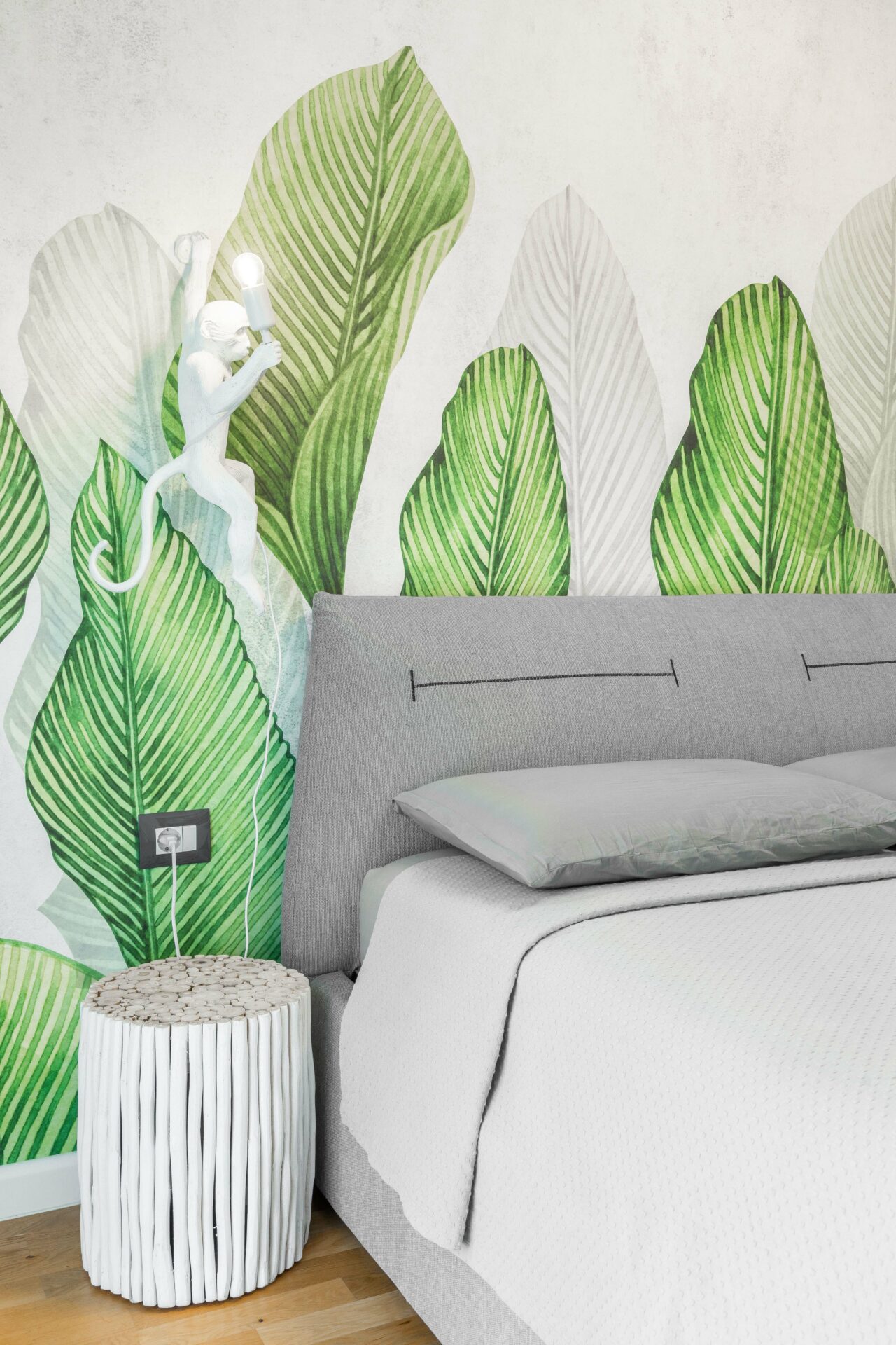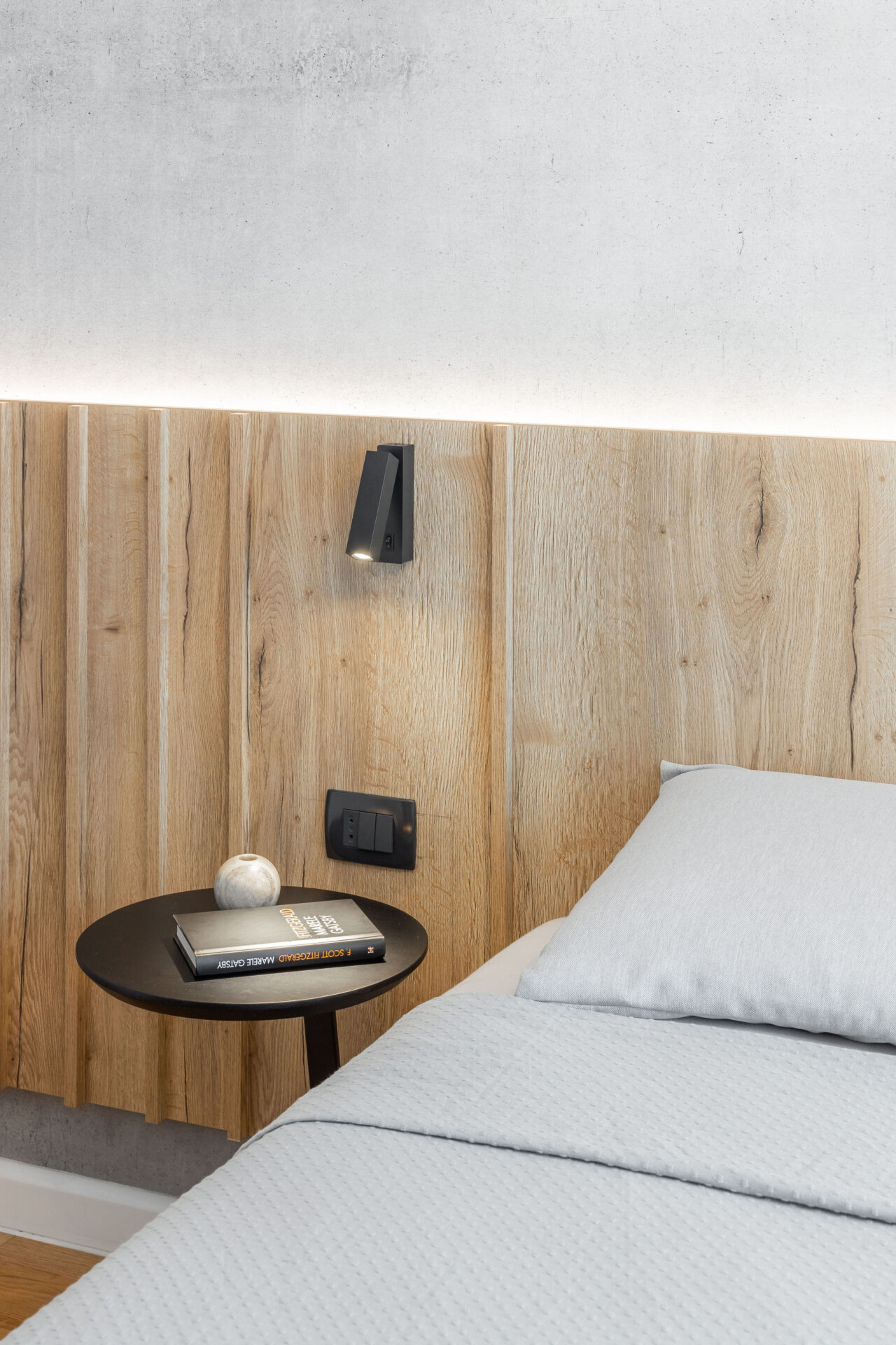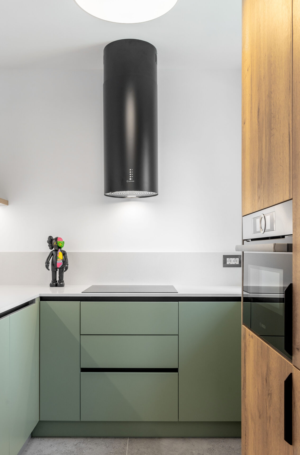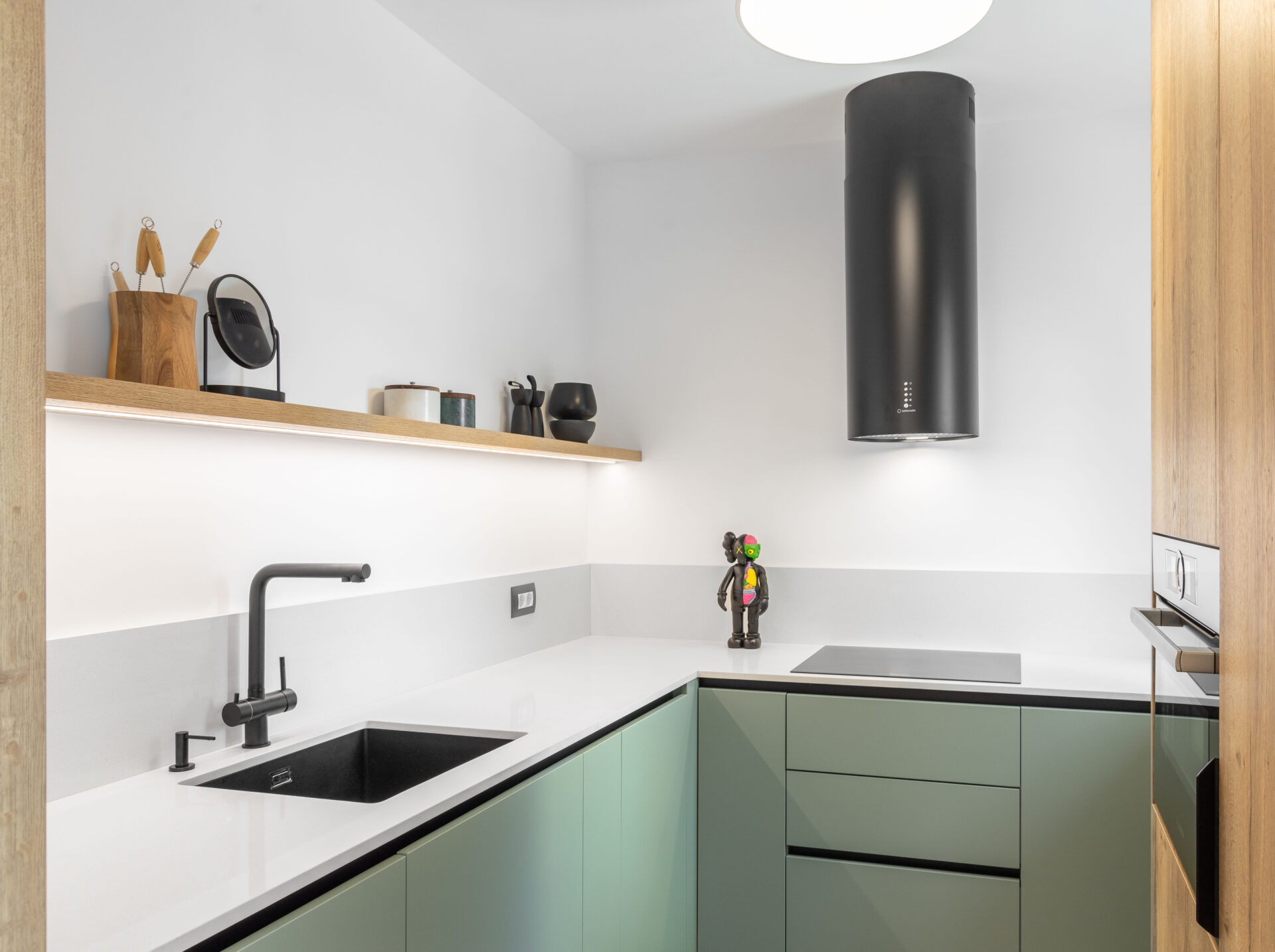 Peretele lung al holului de acces, având o prezență puternică în spațiul zonei de zi, a fost transformat într-un perete de accent „expozițional”, prin alegerea unui tapet cu un model puternic decorativ. Oglinda (pe toata înălțimea) din capătul holului dă senzația de continuitate spațiului, prelungind și oglindind „muralul” decorativ. Corpurile de iluminat au un rol foarte important în definirea și conturarea spațiilor: – plafoniera circulară cu diametru mare marchează centrul spațiului de relaxare din jurul canapelei – șina în formă L accentuează parcursul spațiului, iar cele trei tipuri de spoturi atașate șinei sunt funcțional alese: spoturi liniare pentru iluminatul general, spoturile cilindrice direcționate pentru luminarea de accent a peretelui decor și spoturile suspendate ce marchează locul de luat masa. Decorul pereților oferă personalitate spațiului: – (living) tapetul cu model decorativ, ca o operă de artă într-un muzeu; – (dormitor master) tapetul cu aspect ciment: atmosferă sobră, dar în același timp serenă; – (dormitor oaspeți) tapetul vegetal te transpune in liniștea naturii. Linia generală cromatică a mobilierului custom, în tonuri calde de lemn natur și griuri luminoase, devine un fundal deschis pentru piesele de mobilier atent alese cu forme fluide și în culori accent (verde, negru).