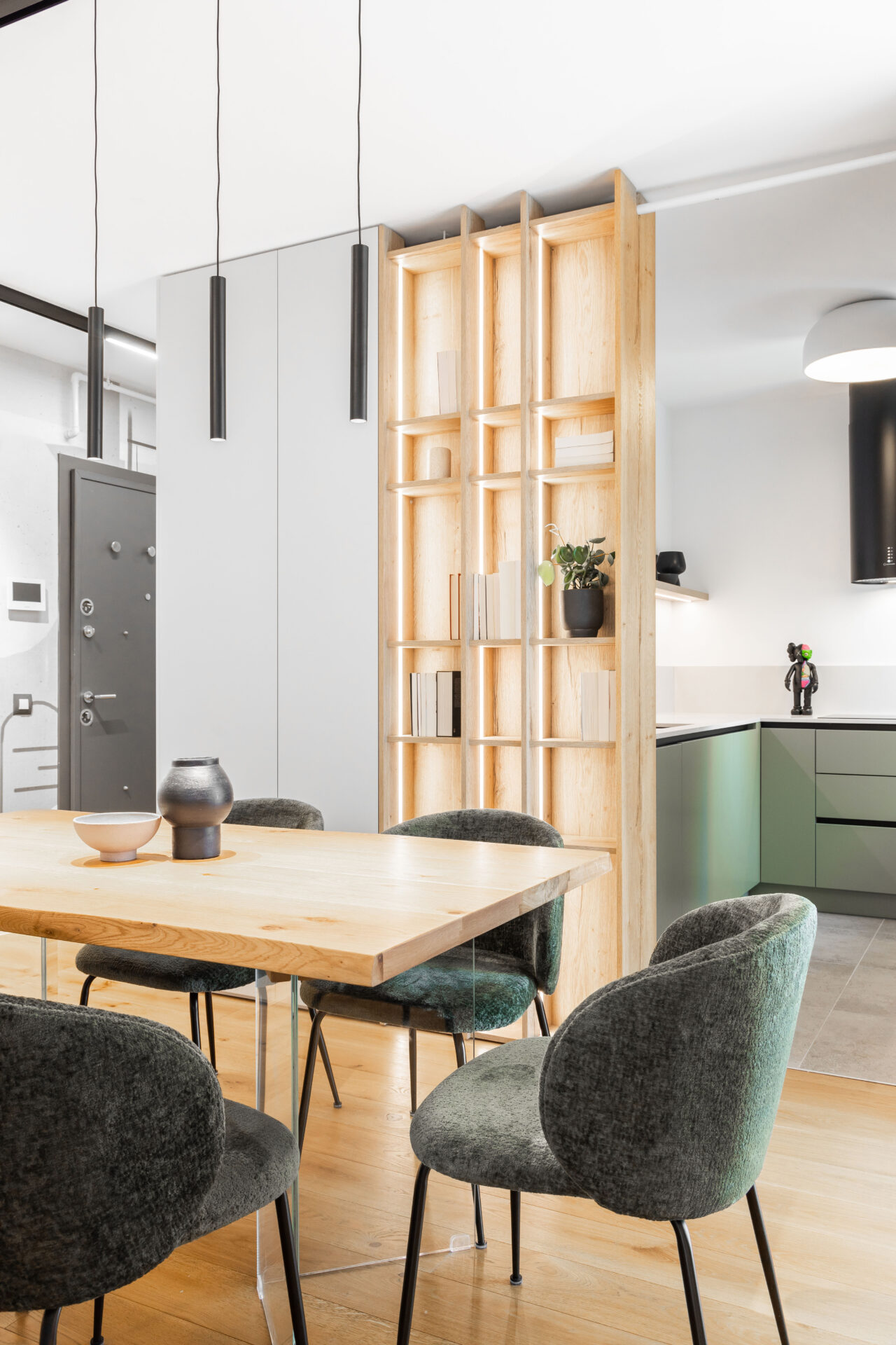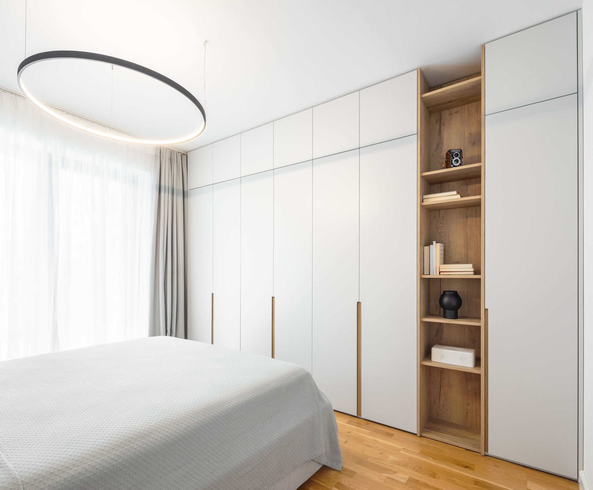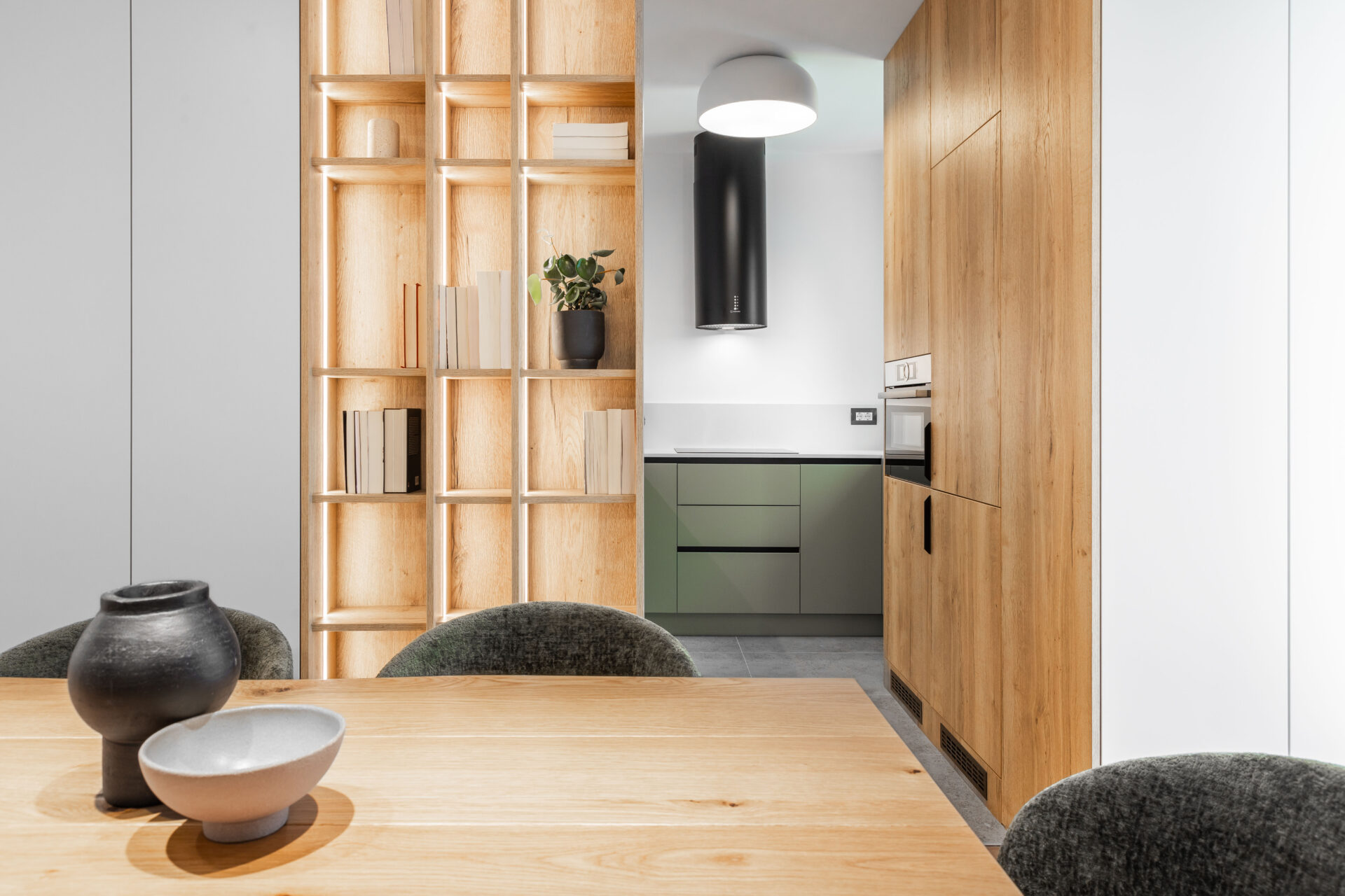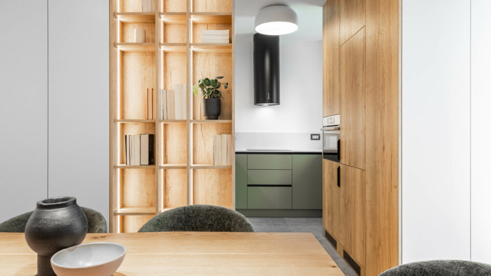 Planul apartamentul se deschide generos către zona de zi – un open space living-dining conectat vizual la spațiul semi-deschis al bucătăriei; iar în planul secundar, zona de noapte formată din două dormitoare și o baie. Fiind un apartament preluat gata finisat de dezvoltatorul imobilului, ne-am concentrat pe definirea funcțională a spațiului și ascunderea micilor imperfecțiuni de compartimentare prin compunerea inteligentă a mobilierului custom. Mobilierul custom îmbracă și ascunde colțurile neregulate ale pereților de compartimentare – astfel bucătăria semideschisă se întrevede subtil prin nișa deschisă în frontul continuu al mobilierului de depozitare. Mobilierul de depozitare devine astfel un portal ce leagă funcțional și estetic bucătăria de zona de luat masa și living.