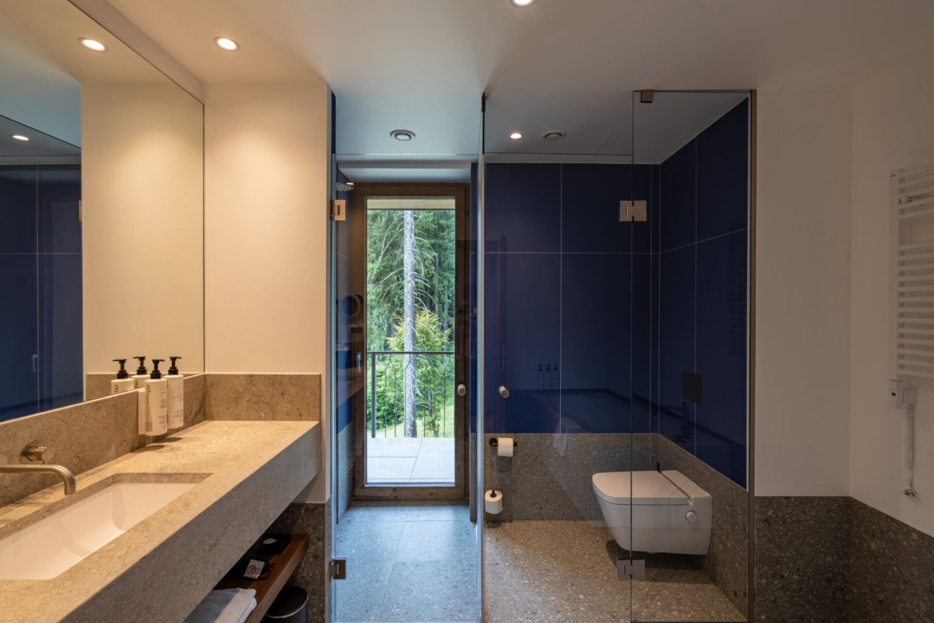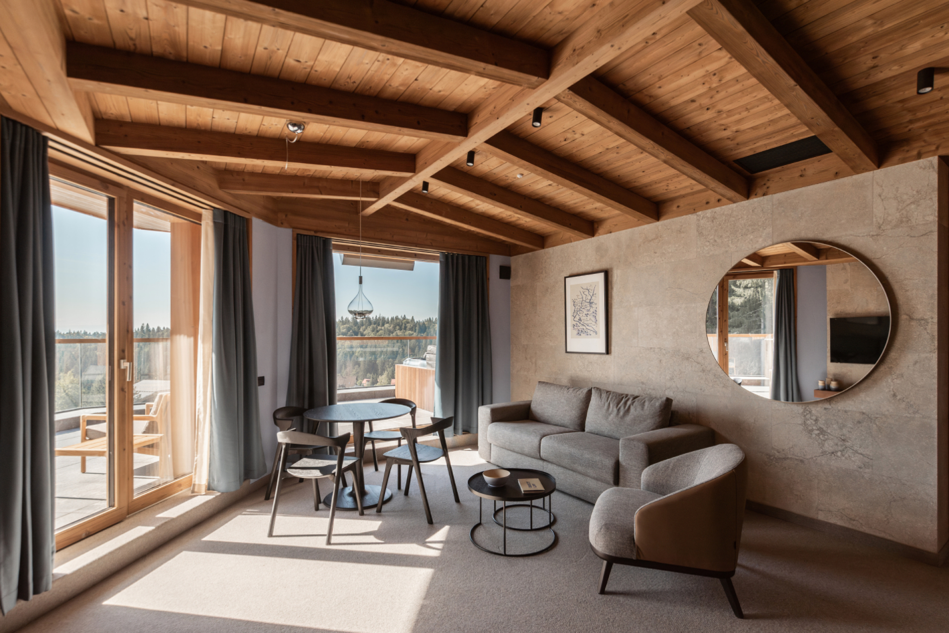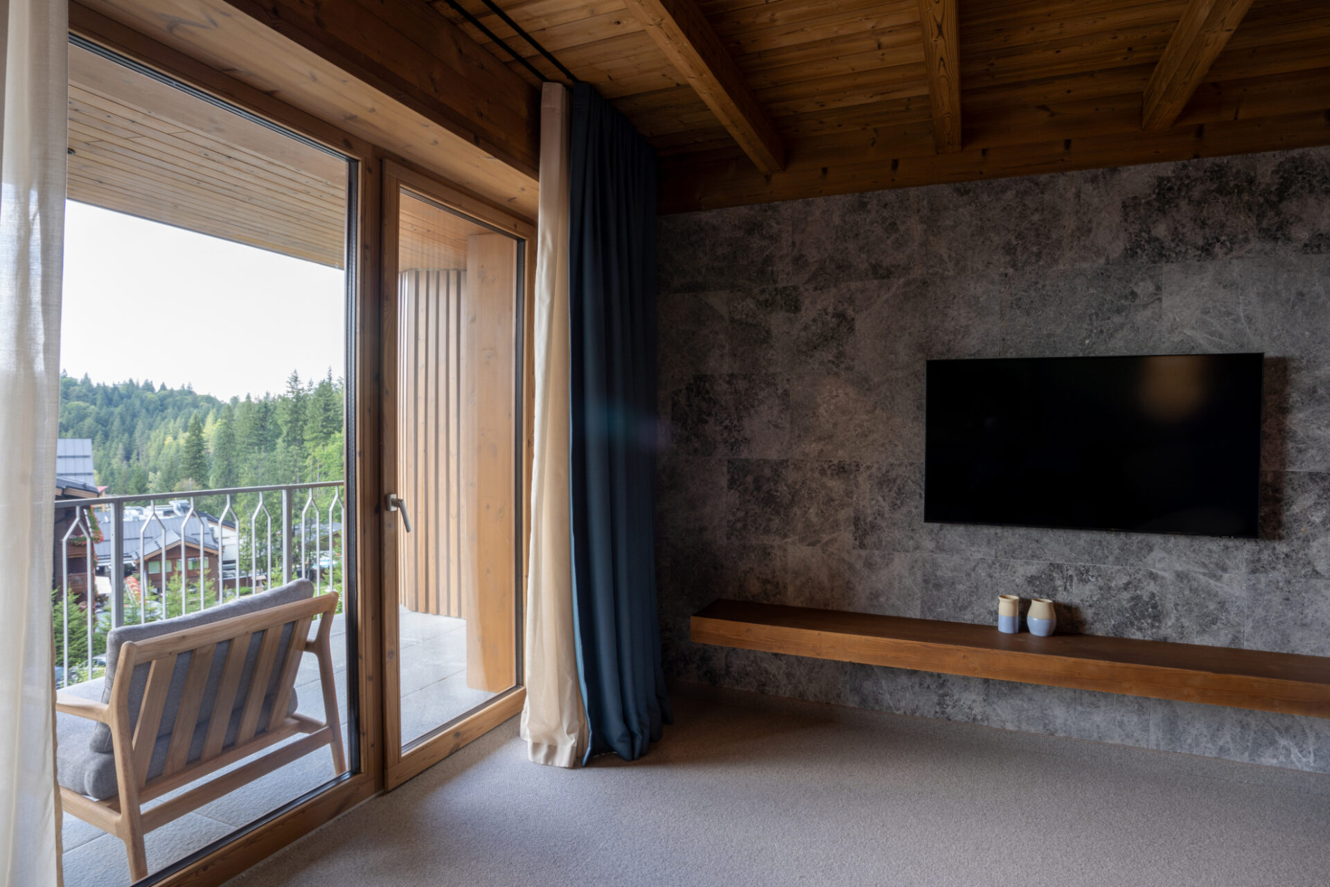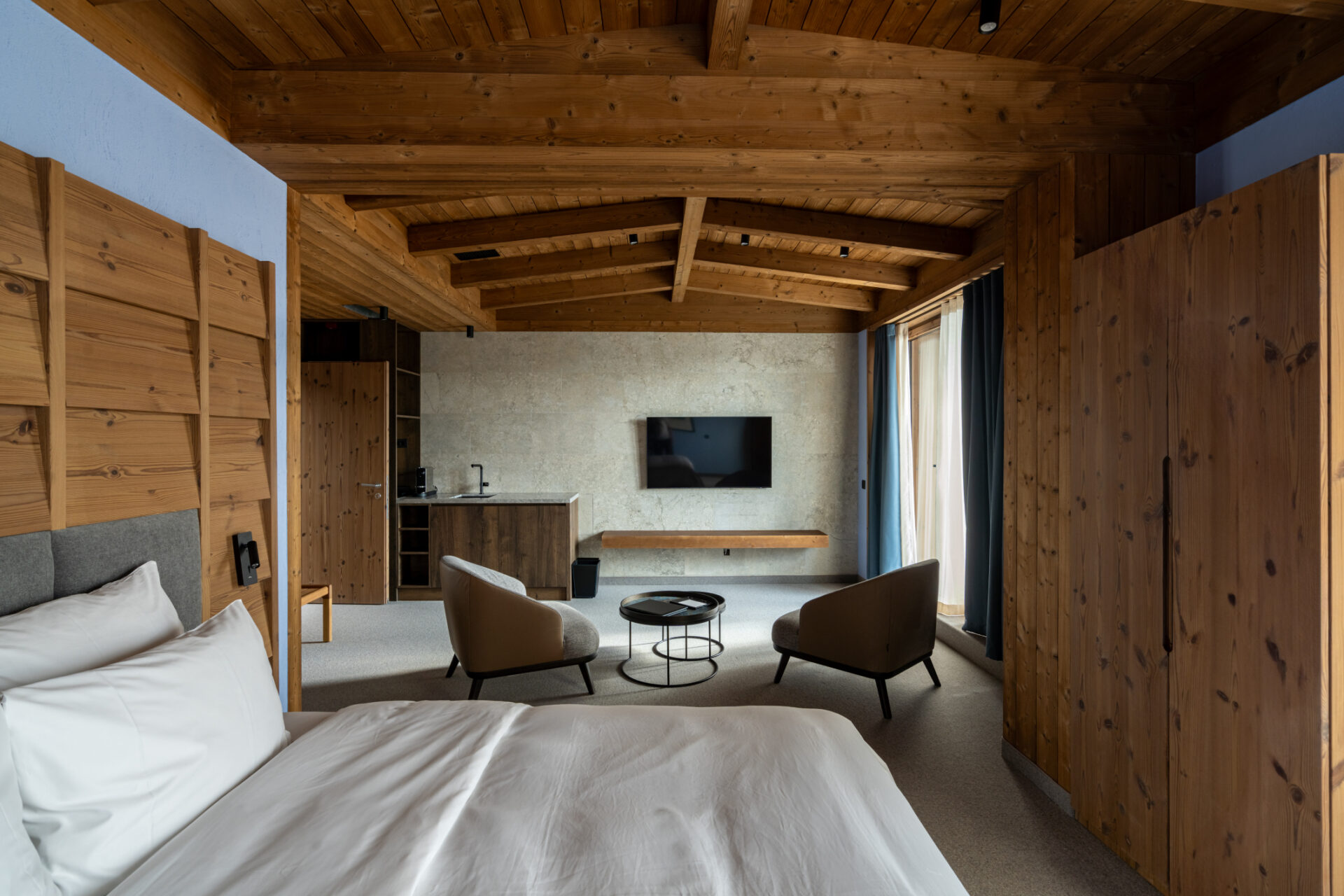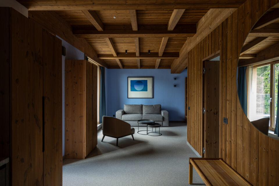 Propunem un spațiu de calitate, cu un interior ancorat în natura și cultura locală. Astăzi, luxul poate însemna diferite lucruri, în cazul nostru înseamnă un spațiu în primul rând sănătos și o definire de mod de viață inspirat din creativitate și entuziasm. Respectul față de natură și sustenabilitate ne obligă să folosim materiale și tehnici tradiționale și la producția cărora nu a fost emisă cantitate mare de dioxid de carbon. Să folosim cât mai multe materiale și elemente locale, inclusiv pentru a avea dreptul apoi să spunem că natura e integrată în adn-ul proiectului. Interioarele sunt inspirate din cea mai identitara culoare din sudul Transilvaniei – albastrul – si folosesc lemnul natur si termotratat pentru a construi o ambianta placuta si olfactiva in mod natural, atat mocheta care este din lana, cat si culoarea luminii, duc catre un interior de tara modest in infatisare, dar bogat in senzatie si consistenta. Zona de lobby face o legatura mai directa cu muntele prin materialul de piatra predominant si texturile lui, incalzit de tencuielile naturale de var si lemn. Iar zona de SPA duce oaspetele intr-o experienta sapata si mai adanc in natura, unde focul care prelucreaza lemnul se intalneste cu piatra si apa.