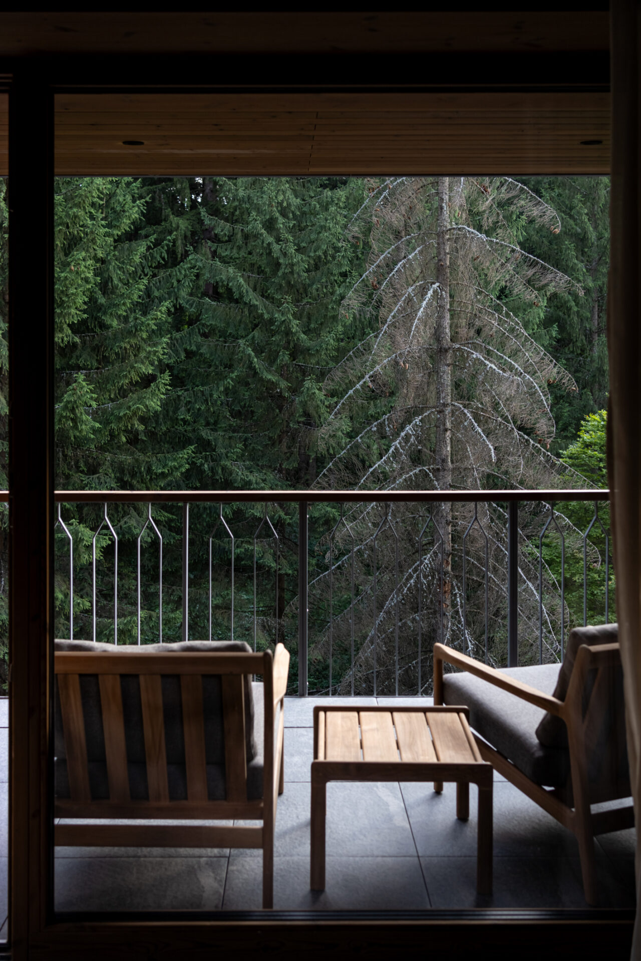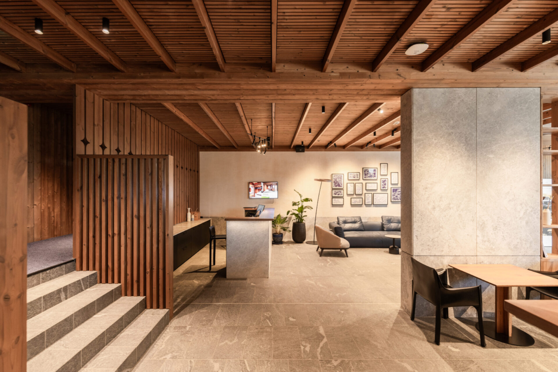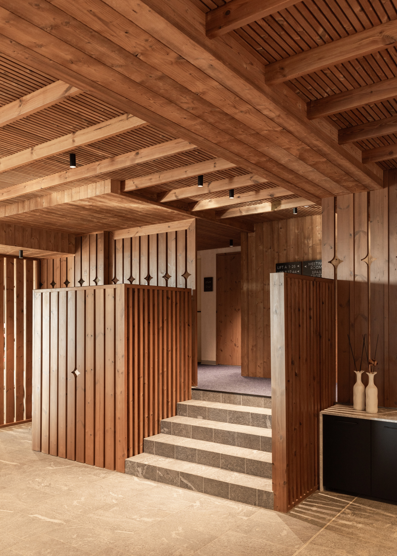 Același lemn rășions și piatră gri sunt preluate și în amenajare. Conexiunea cu natura resimțită și în interior indică o stare de bine, o liniște. Pentru a trăi și aceasta valoare intervine în experiența dimensiunii timpului pe care îl acordăm fie pentru a face explorări in natură fie pentru a observa natura în momente de liniște. Designul interior poate aduce dimensiunea timpului în experiența oaspetelui. Al doilea pilon care dă formă experienței și a identității clădirii este sănătatea ca o parte intrinsecă vieții de calitate. Sănătatea prin mișcare, hrana, odihna și foarte important prin ambientul spațiului interior. O definire a sănătății este calitatea aerului interior care se lasă cuprins de aerul montan din exterior fără a fi alterat de compușii chimici regăsiți în materialele de finisare, mobilier și construcții. De aceea am folosit în interior materiale naturale neprelucrate chimic, lemn de pin termotratat, mocheta de lână, piatră de Transilvania, finisaj de var hidraulic și văruială pe pereți pe rețeta tradiționala.