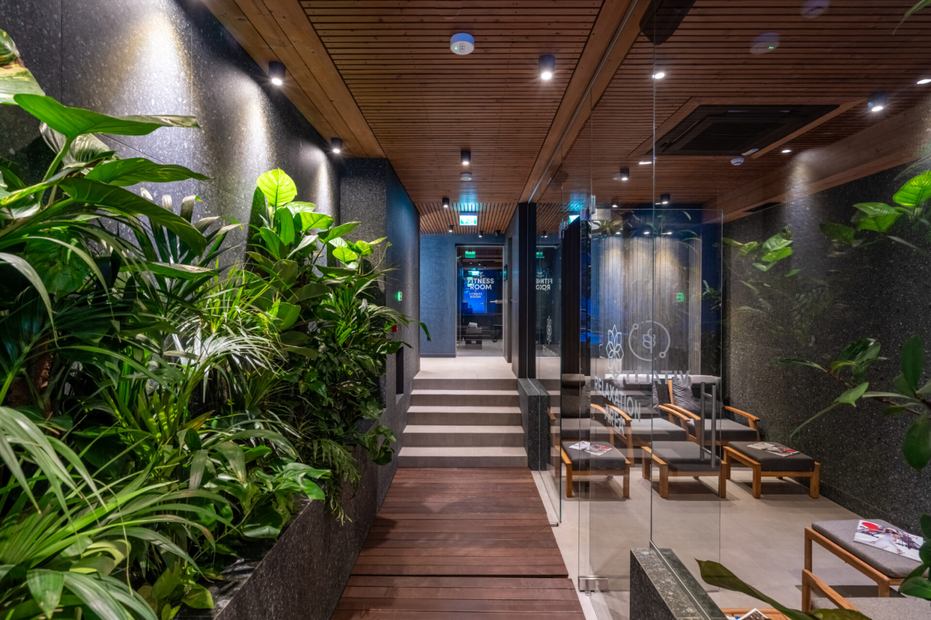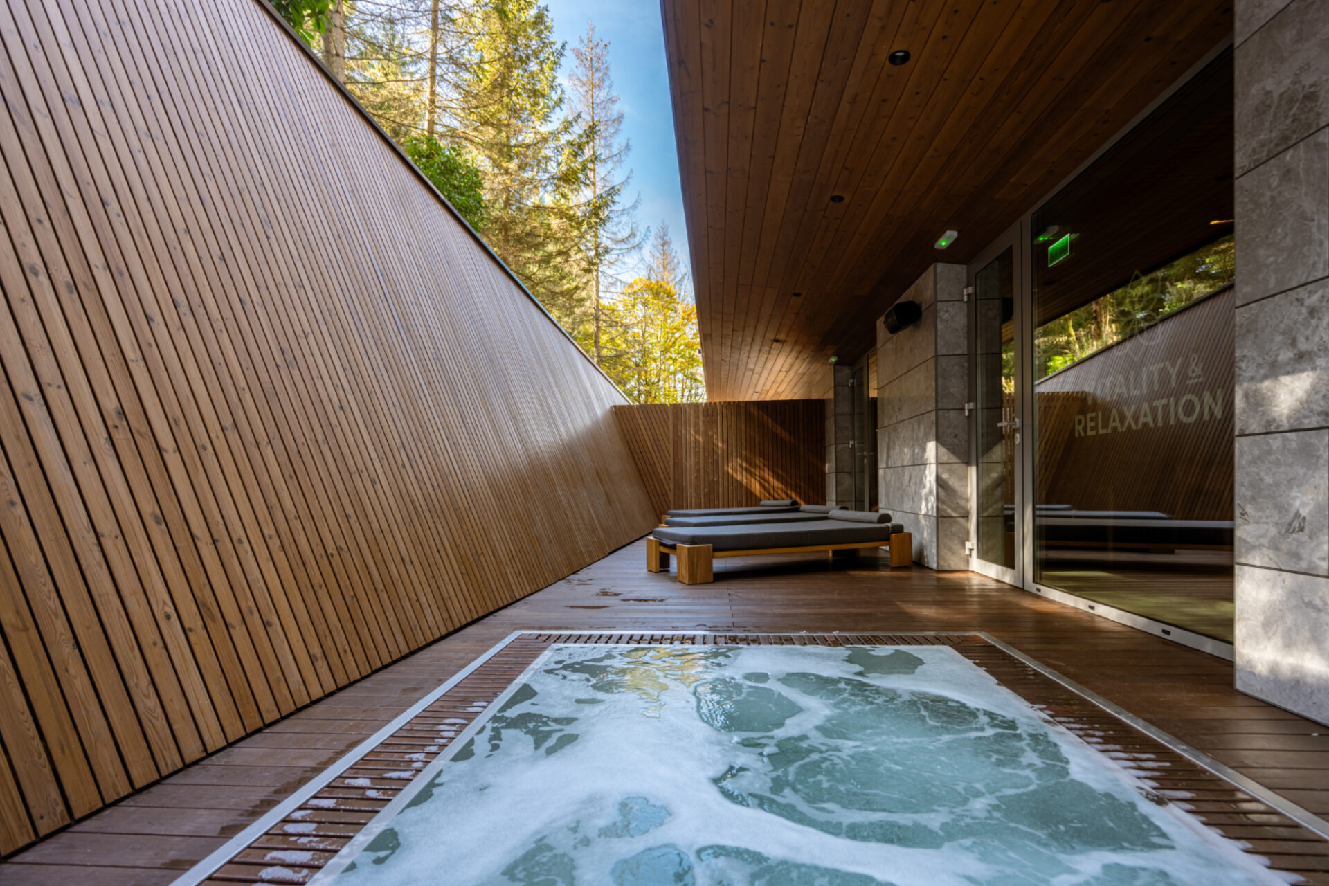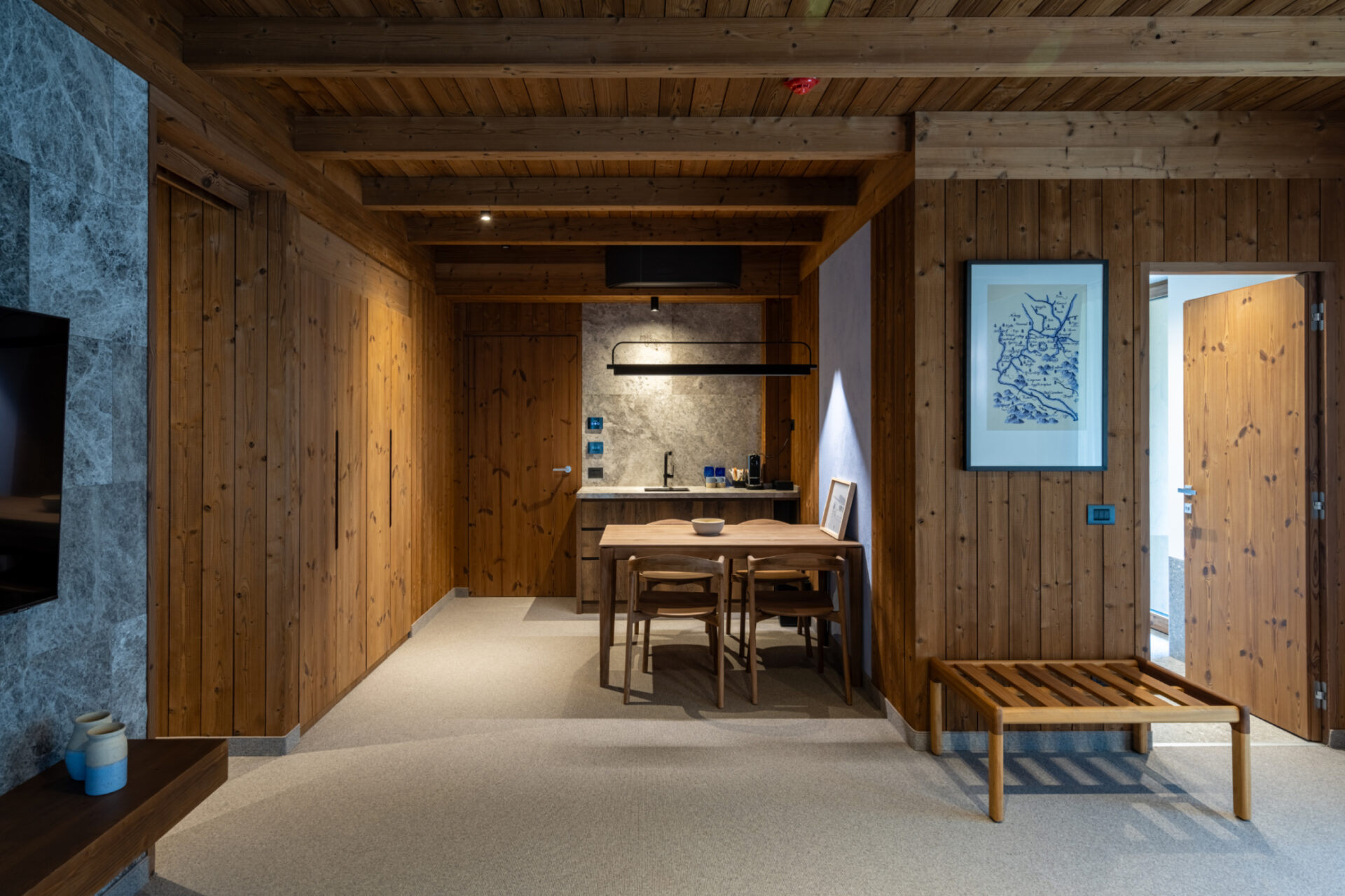 Același lemn rășions și piatră gri sunt preluate și în amenajare. Conexiunea cu natura resimțită și în interior indică o stare de bine, o liniște. Pentru a trăi și aceasta valoare intervine în experiența dimensiunii timpului pe care îl acordăm fie pentru a face explorări in natură fie pentru a observa natura în momente de liniște. Designul interior poate aduce dimensiunea timpului în experiența oaspetelui. Al doilea pilon care dă formă experienței și a identității clădirii este sănătatea ca o parte intrinsecă vieții de calitate. Sănătatea prin mișcare, hrana, odihna și foarte important prin ambientul spațiului interior. O definire a sănătății este calitatea aerului interior care se lasă cuprins de aerul montan din exterior fără a fi alterat de compușii chimici regăsiți în materialele de finisare, mobilier și construcții. De aceea am folosit în interior materiale naturale neprelucrate chimic, lemn de pin termotratat, mocheta de lână, piatră de Transilvania, finisaj de var hidraulic și văruială pe pereți pe rețeta tradiționala.