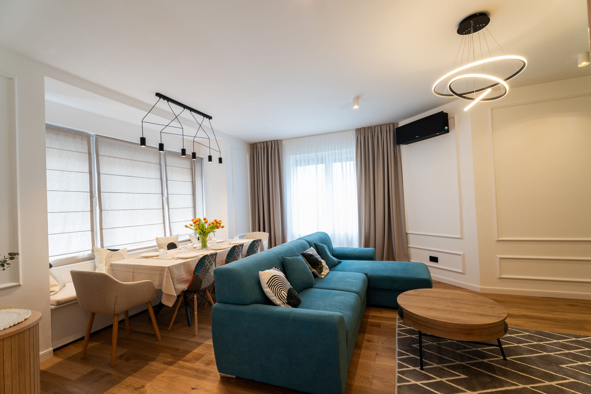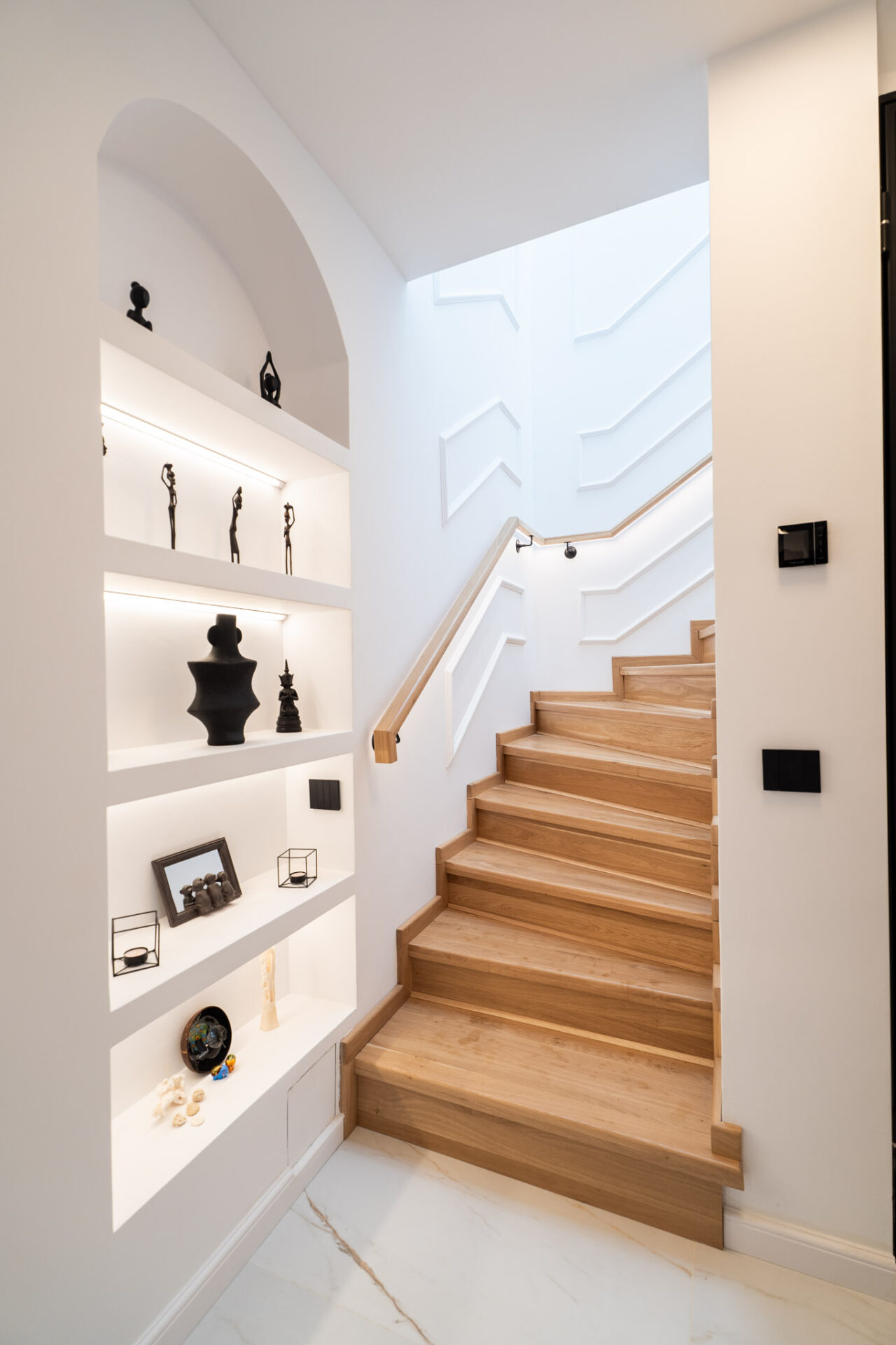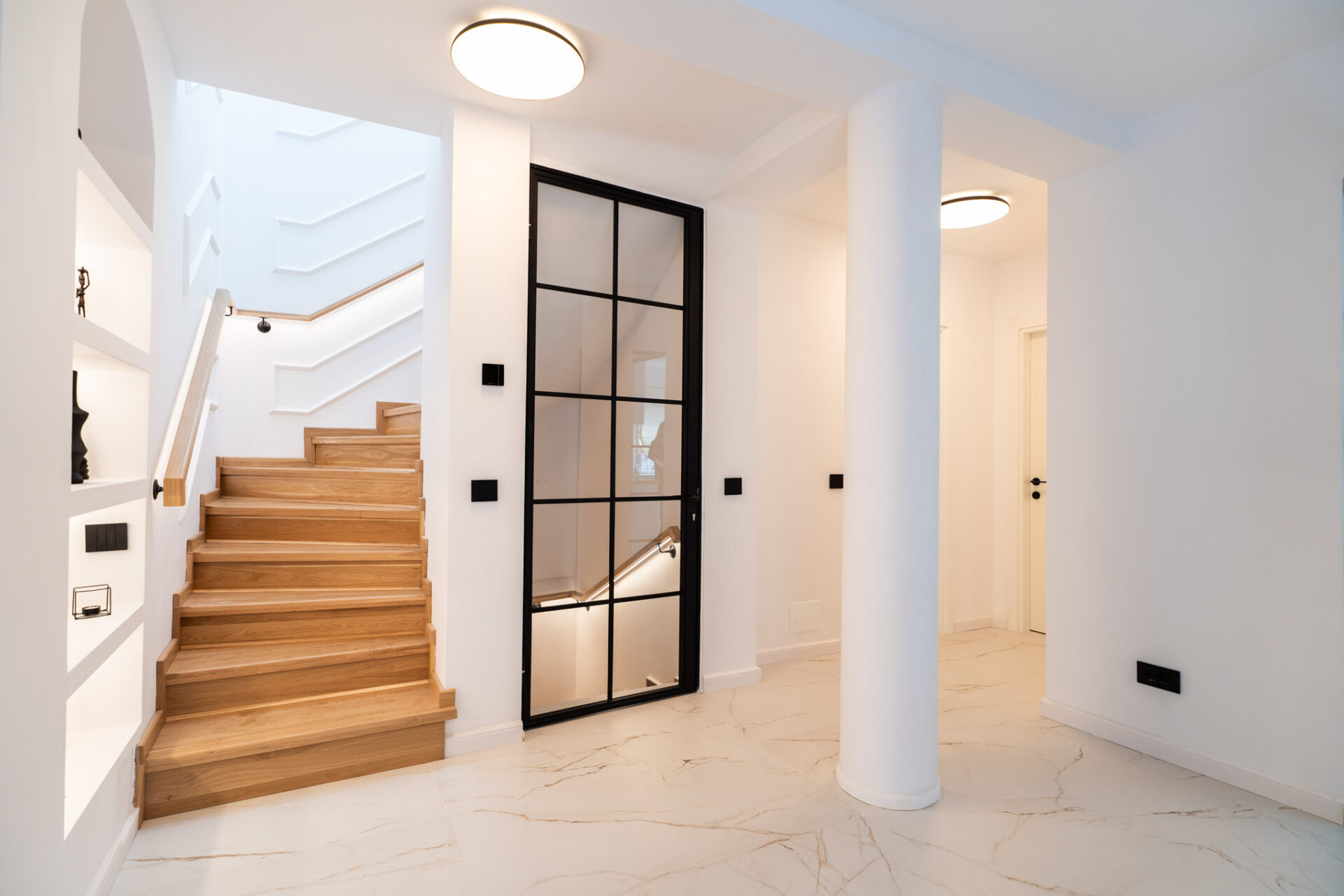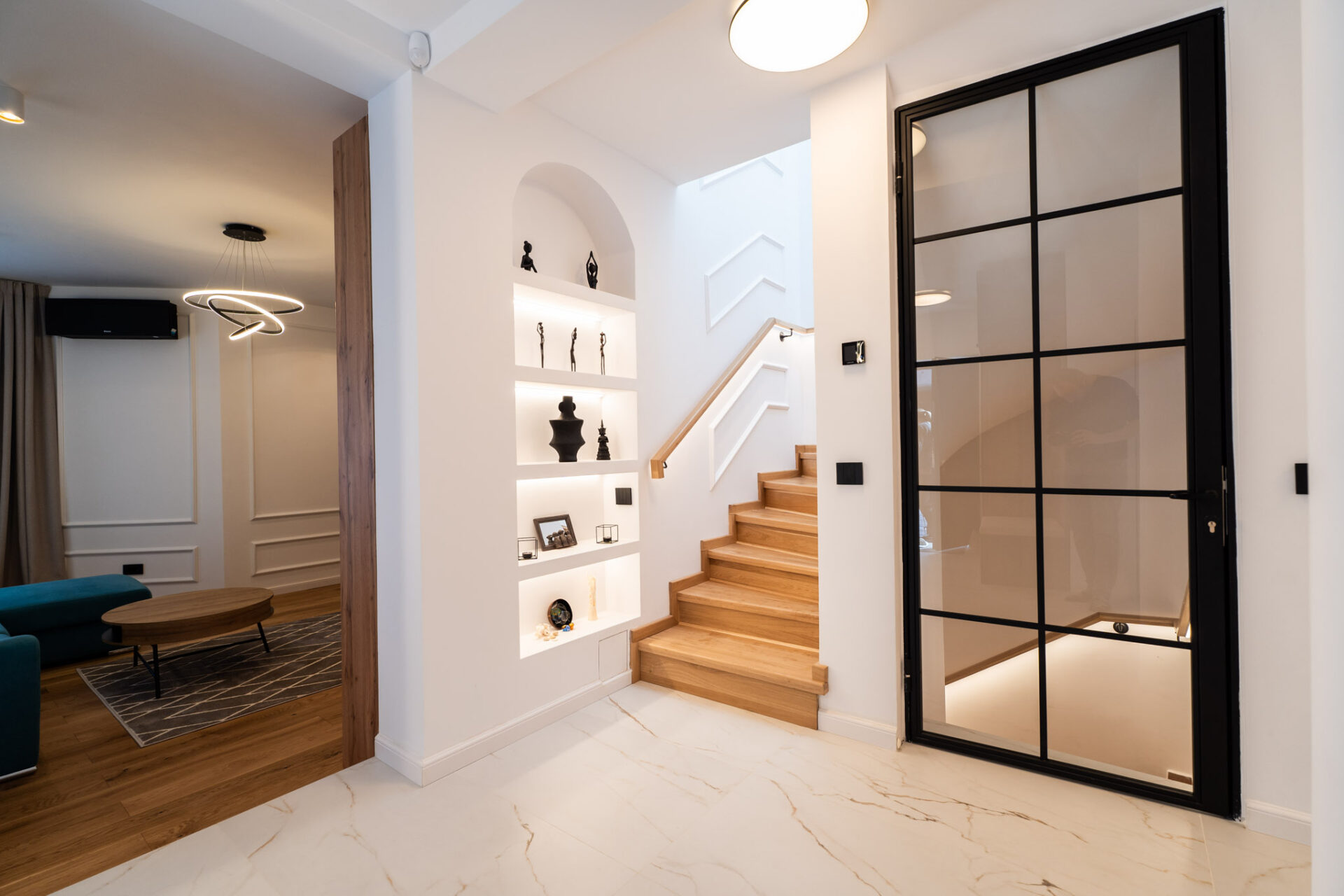 Încă de la alegerea finisajelor, am optat pentru o paletă de culori luminoase. Pereții sunt albi, finisați cu profile decorative discrete, iar la nivelul pardoselii am ales o combinație de plăci ceramice mari, cu aspect de marmură, și parchet din lemn stratificat, într-o nuanță caldă. Beneficiarii și-au exprimat dorințele legate de funcționalitate și spațialitate pentru fiecare nivel, astfel încât s-a conturat tema de proiectare. Casa are două nivele, parter și etaj, și o suprafață totală de 200 mp utili.