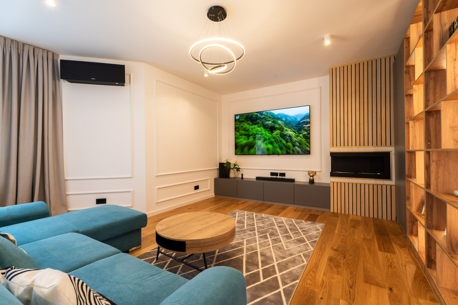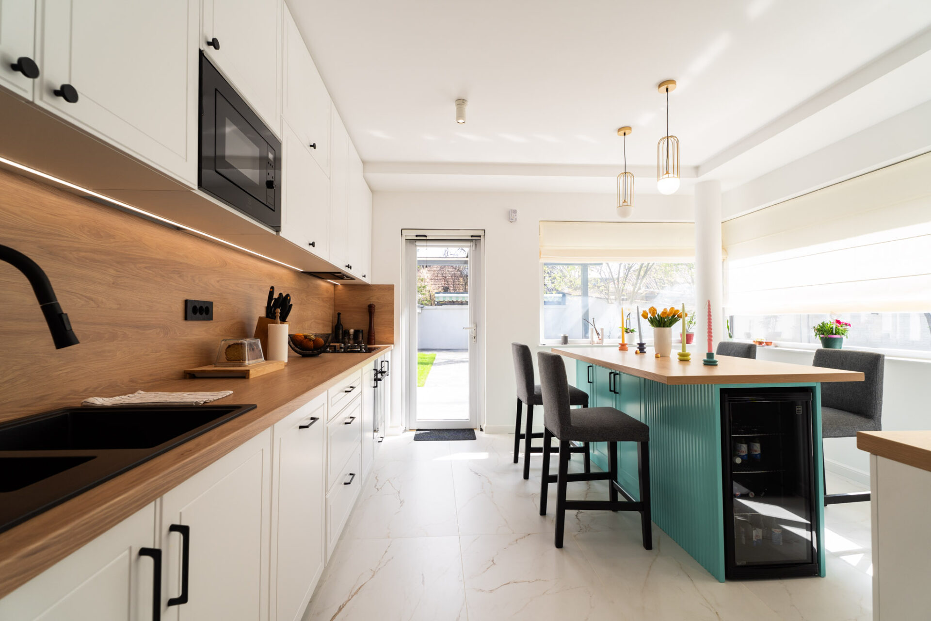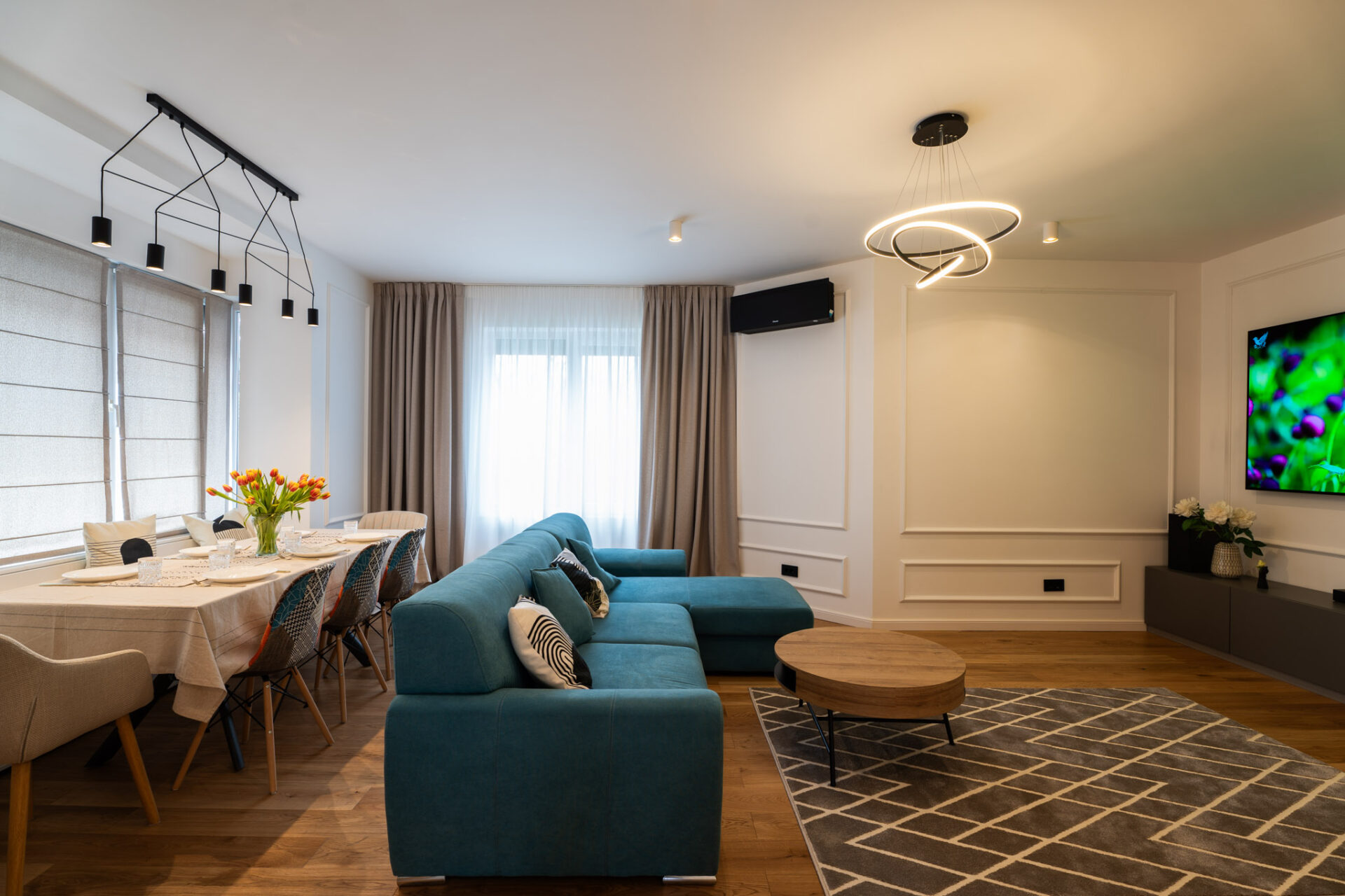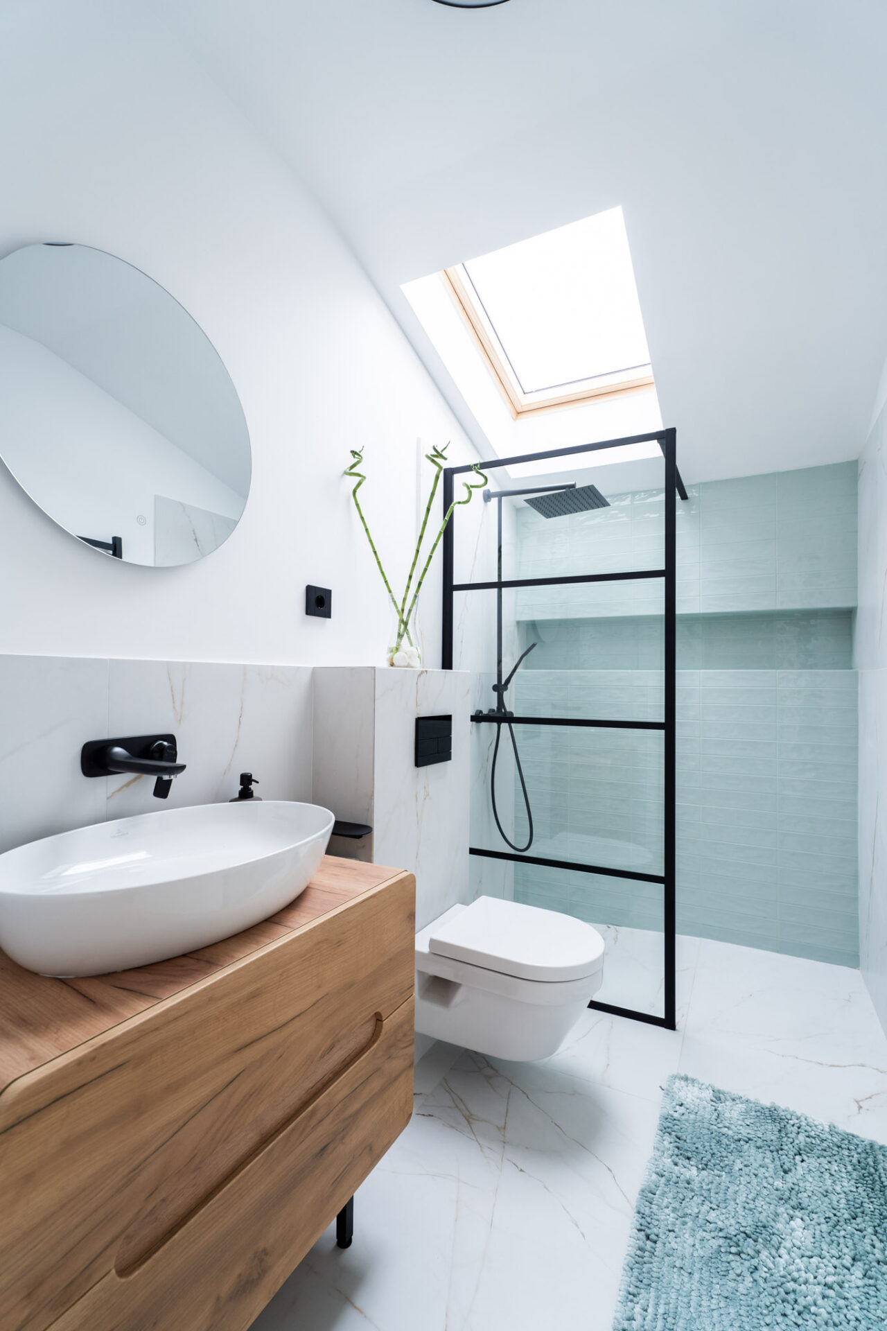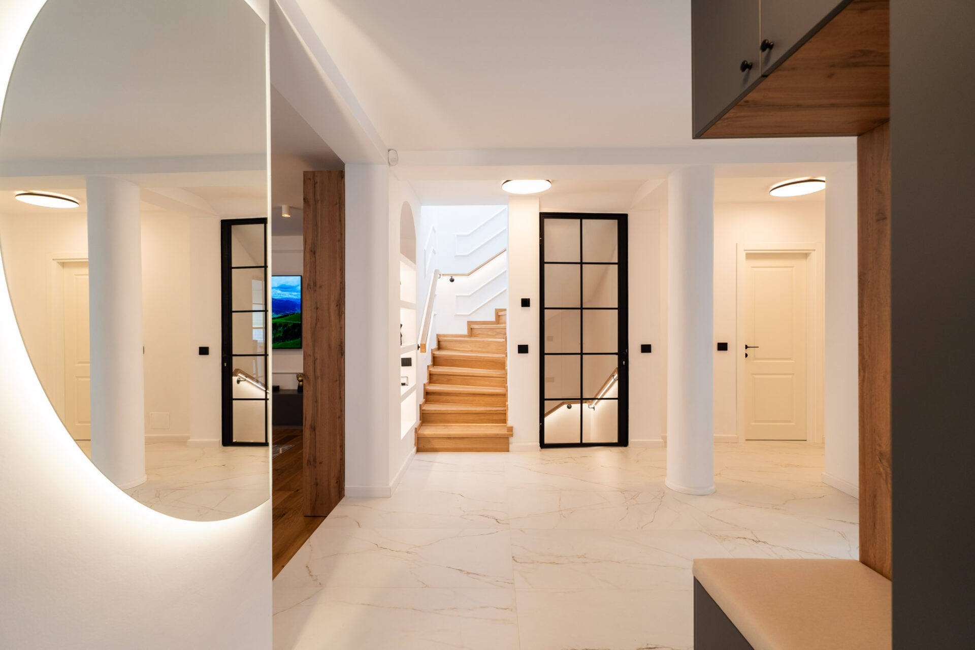 Încă de la alegerea finisajelor, am optat pentru o paletă de culori luminoase. Pereții sunt albi, finisați cu profile decorative discrete, iar la nivelul pardoselii am ales o combinație de plăci ceramice mari, cu aspect de marmură, și parchet din lemn stratificat, într-o nuanță caldă. Beneficiarii și-au exprimat dorințele legate de funcționalitate și spațialitate pentru fiecare nivel, astfel încât s-a conturat tema de proiectare. Casa are două nivele, parter și etaj, și o suprafață totală de 200 mp utili.