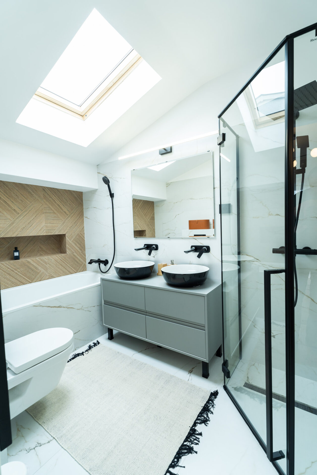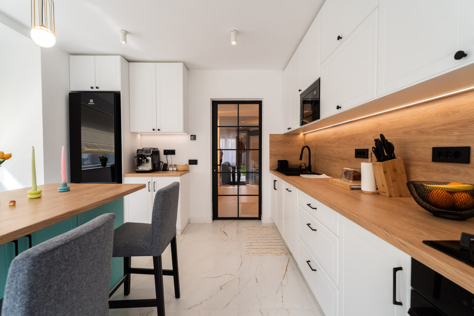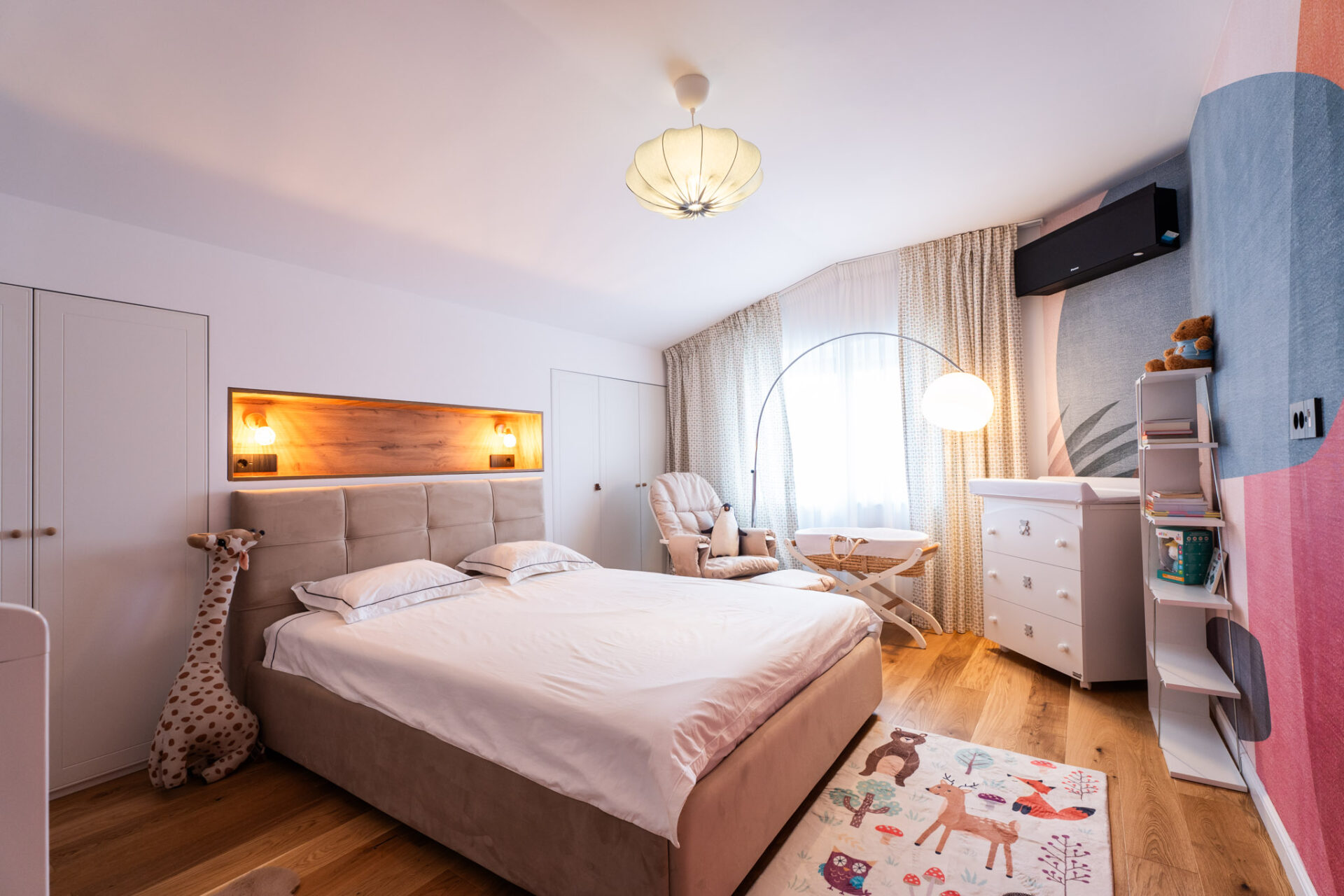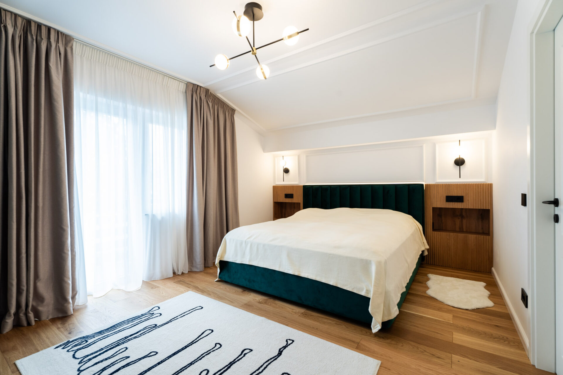 La etaj se găsește zona intimă a casei, complet izolată, unde regăsim dormitoarele cu băile aferente și biroul. Știm cât de importantă este lumina naturală într-o încăpere, atât din punct de vedere fizic, cât și psihologic, dar nu trebuie să ignorăm importanța iluminatului arhitectural de interior într-o amenajare. Așadar, am avut în vedere utilizarea mai multor surse de lumină, gândite pentru diverse scenarii de utilizare a zonelor. Pe lângă iluminatul central, am adăugat spoturi, suspensii deasupra mesei de dining și a insulei din bucătărie, benzi LED în corpurile de mobilă, precum și aplice în dormitoare.