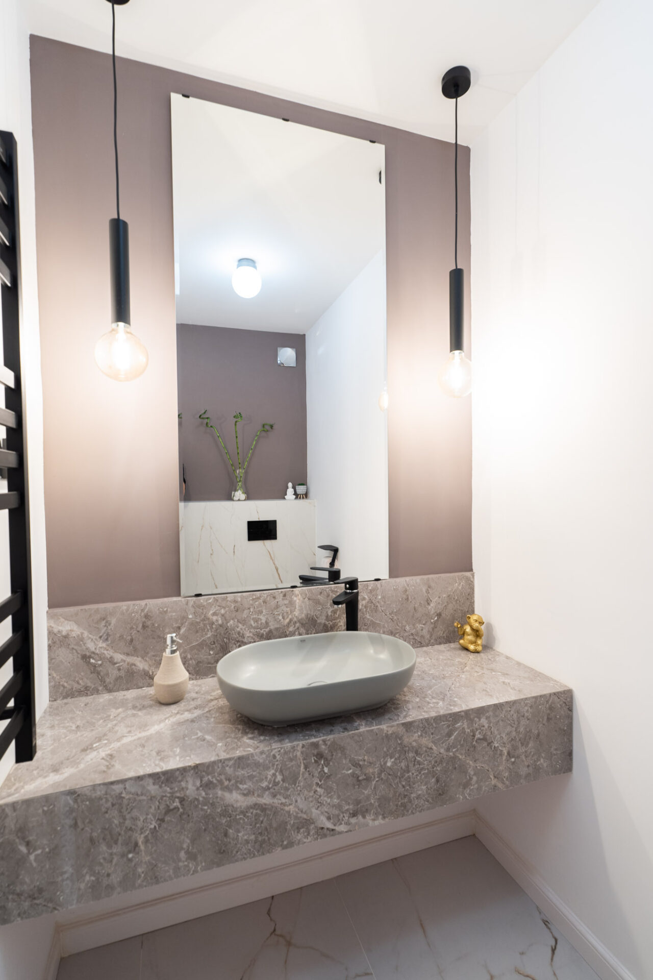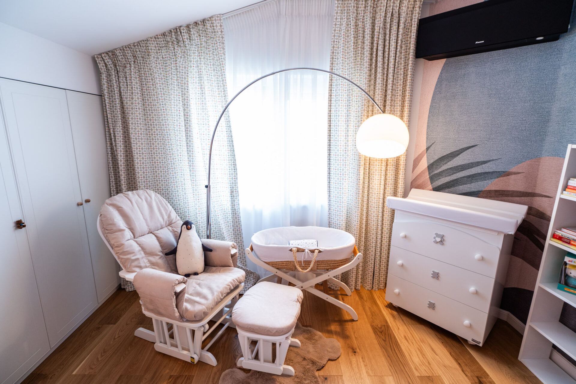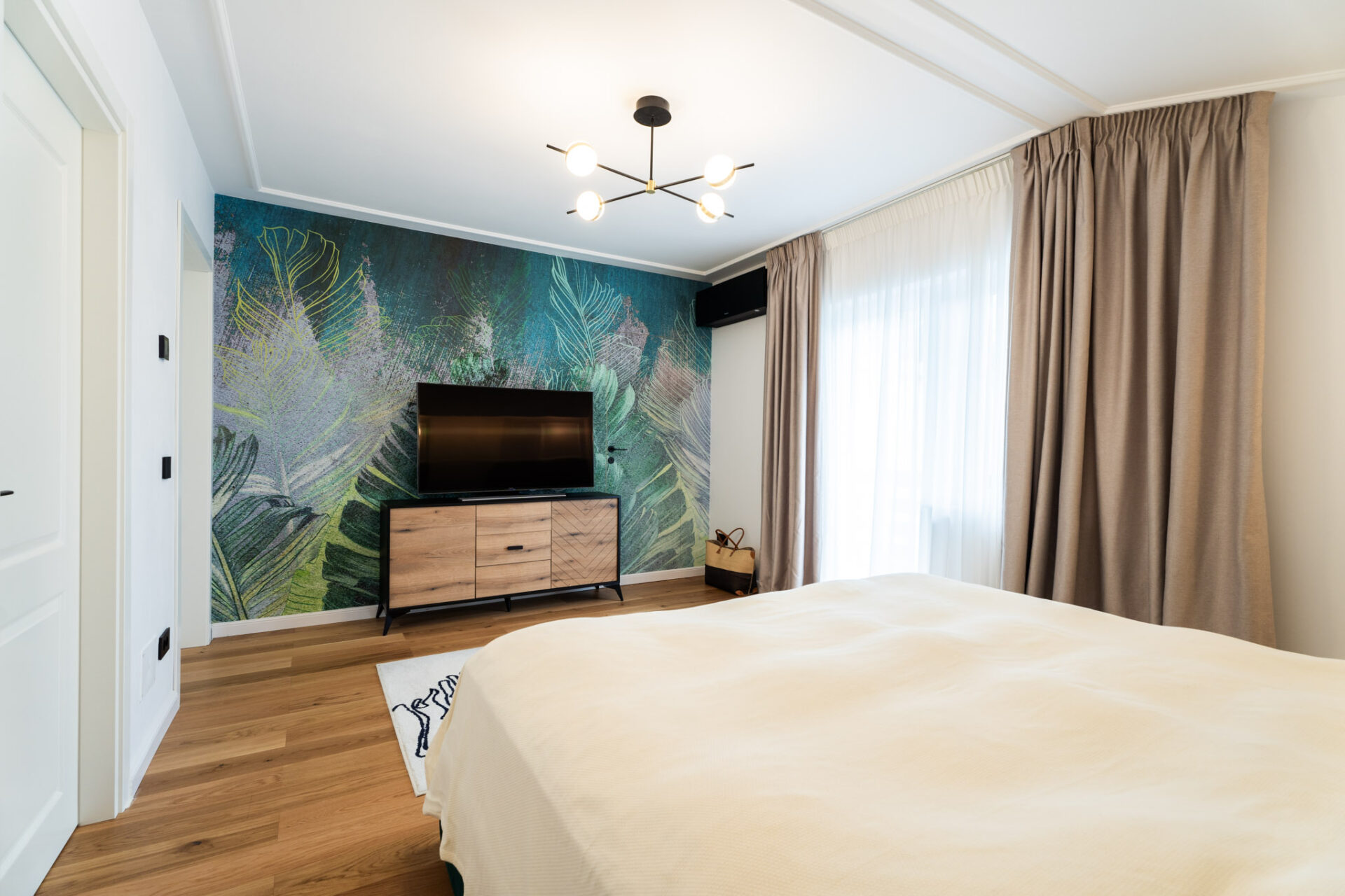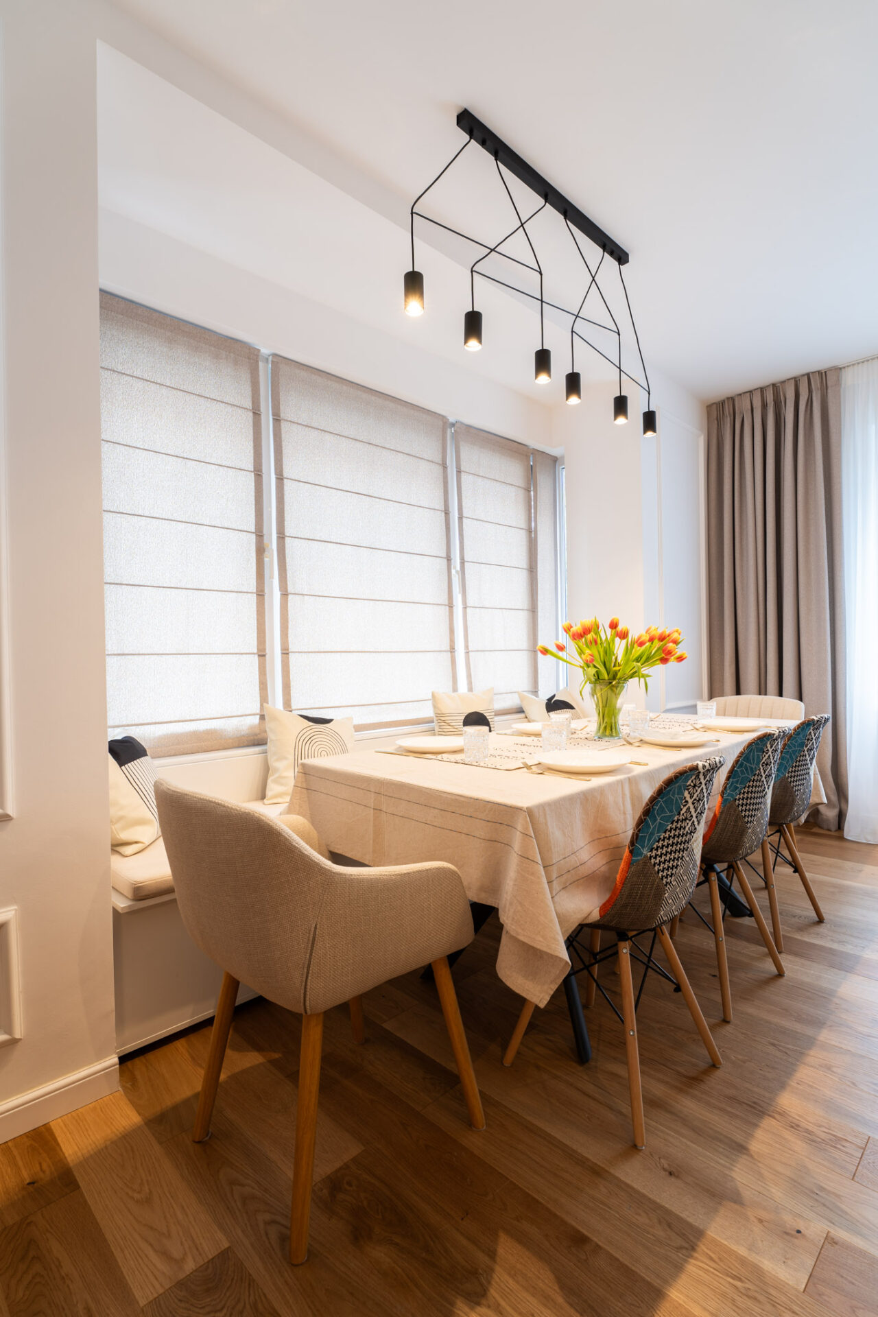 La etaj se găsește zona intimă a casei, complet izolată, unde regăsim dormitoarele cu băile aferente și biroul. Știm cât de importantă este lumina naturală într-o încăpere, atât din punct de vedere fizic, cât și psihologic, dar nu trebuie să ignorăm importanța iluminatului arhitectural de interior într-o amenajare. Așadar, am avut în vedere utilizarea mai multor surse de lumină, gândite pentru diverse scenarii de utilizare a zonelor. Pe lângă iluminatul central, am adăugat spoturi, suspensii deasupra mesei de dining și a insulei din bucătărie, benzi LED în corpurile de mobilă, precum și aplice în dormitoare.