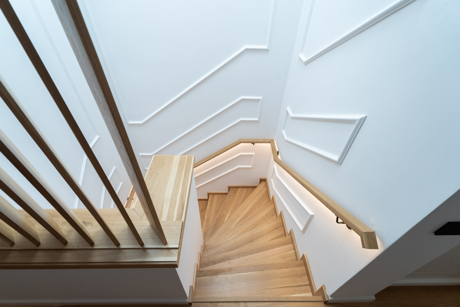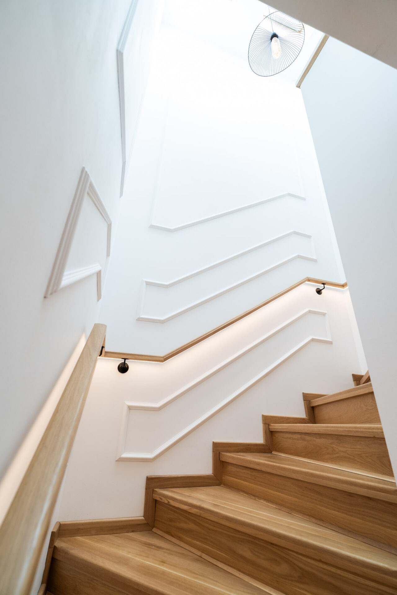 La parter se află zona de zi, formată dintr-un hol generos la intrare, living și dining, o bucătărie separată și o baie de serviciu. Scara face tranziția către spațiul privat de la etaj și este primul element pe care îl vedem la intrarea în casă. Cu o înălțime de aproximativ 6 m, casa scării este un element unificator, datorită luminozității și materialelor folosite.