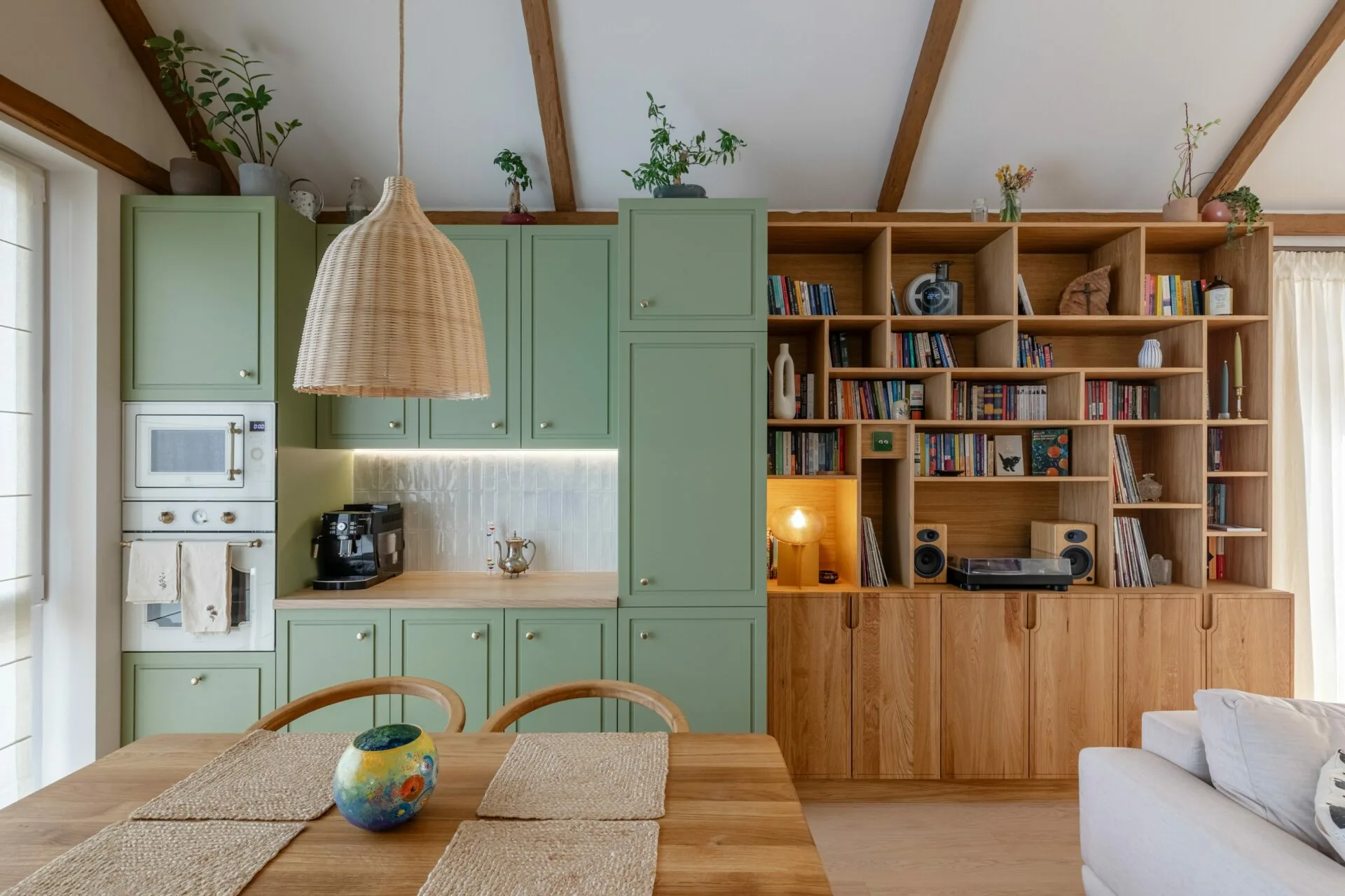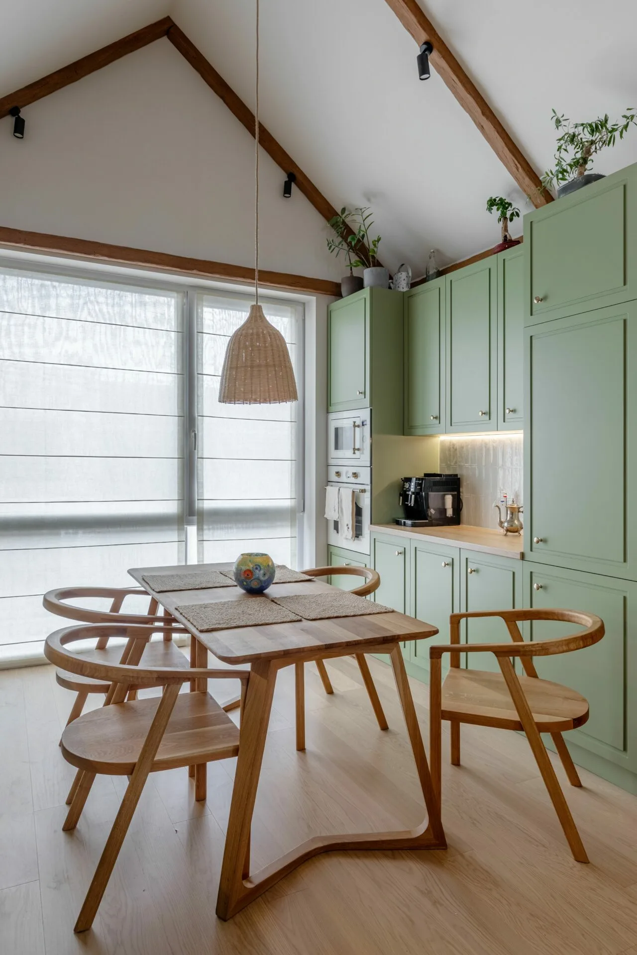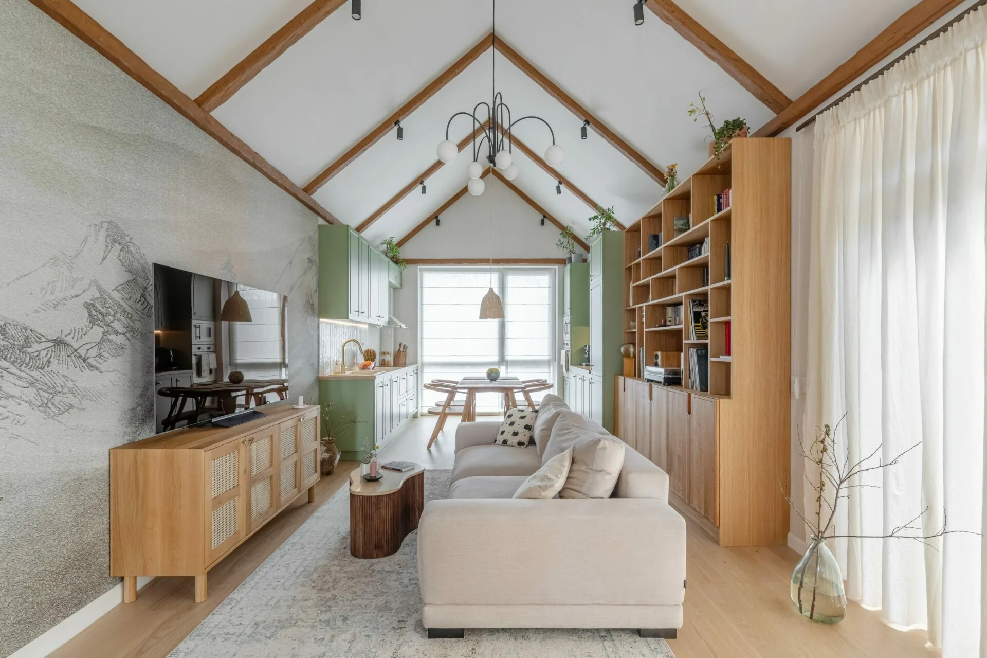 The Green Nest este un interior construit în jurul ideii de retragere contemporană, unde armonia dintre proporții, texturi și emoții devine esența experienței de locuire. De la geometria atipică a tavanului, până la delicatețea materialelor naturale, fiecare alegere susține această direcție, conturând un spațiu calm și coerent. Volumetria existentă, definită de un tavan înalt cu formă triunghiulară, specifică arhitecturii cabanelor alpine, a fost tratată ca un element identitar. Aceasta a fost valorizată și integrată coerent în compoziția generală, devenind un reper arhitectural al spațiului. Inserțiile contemporane, cu volumetrii simple și detalii discrete, completează ansamblul și ancorează proiectul într-un limbaj actual. Într-un apartament gândit ca loc de relaxare și reconectare cu natura, materialele nu pot fi alese la întâmplare. Materialele organice, precum inul, ratanul, bumbacul și lemnul natural, sunt utilizate în mod recurent, nu doar pentru valoarea lor vizuală, ci și pentru calitățile tactile și sustenabile, jucând un rol esențial în conturarea atmosferei. Paleta cromatică, inspirată din natură, este alcătuită din nuanțe de verde, bej și tonuri pământii, care se succed firesc de la un spațiu la altul. The Green Nest propune astfel o estetică a firescului, în care nimic nu pare forțat sau demonstrativ, explorând ideea de confort contemporan printr-un limbaj vizual simplu, dar rafinat, în care materialele și proporțiile devin adevărații protagoniști.