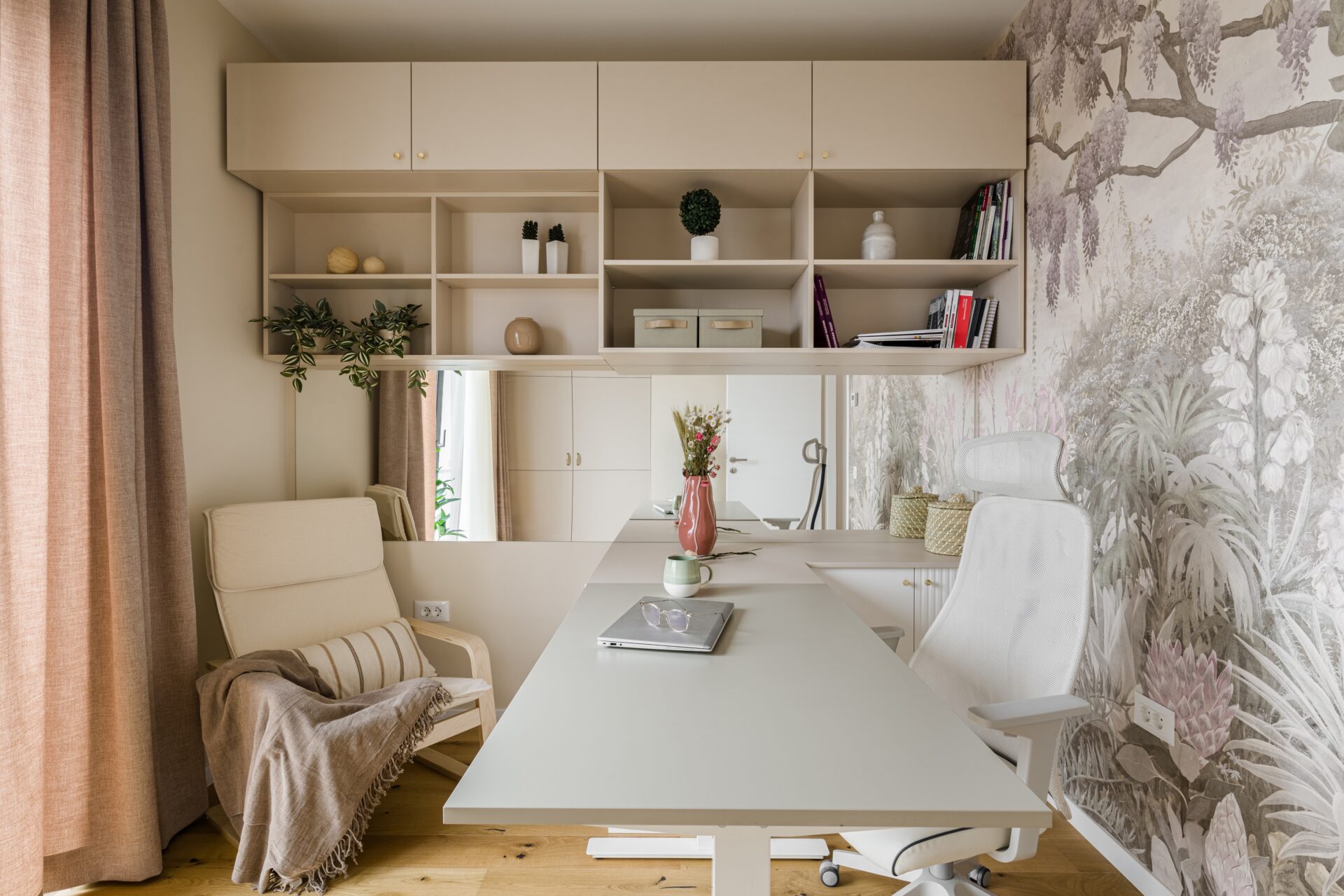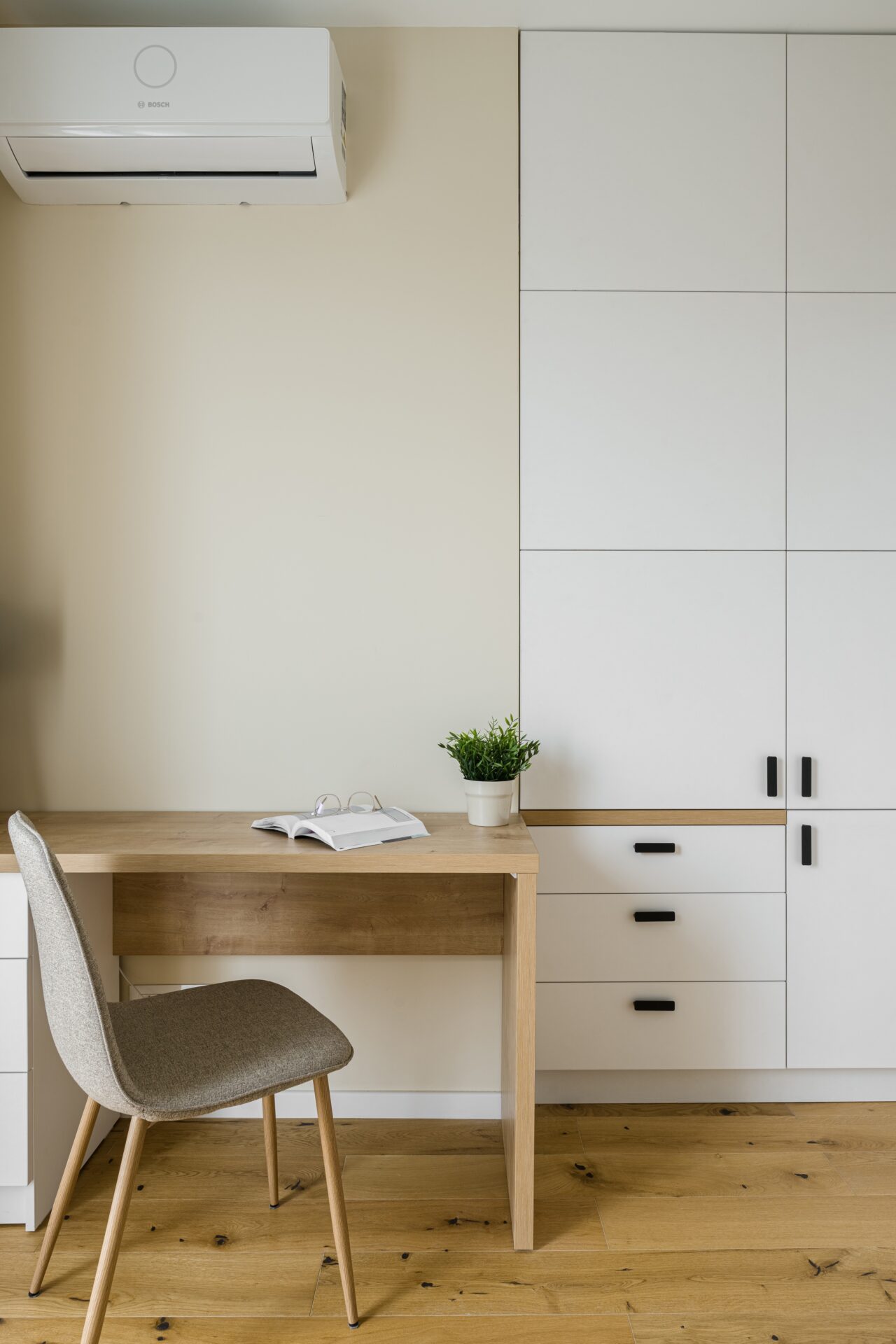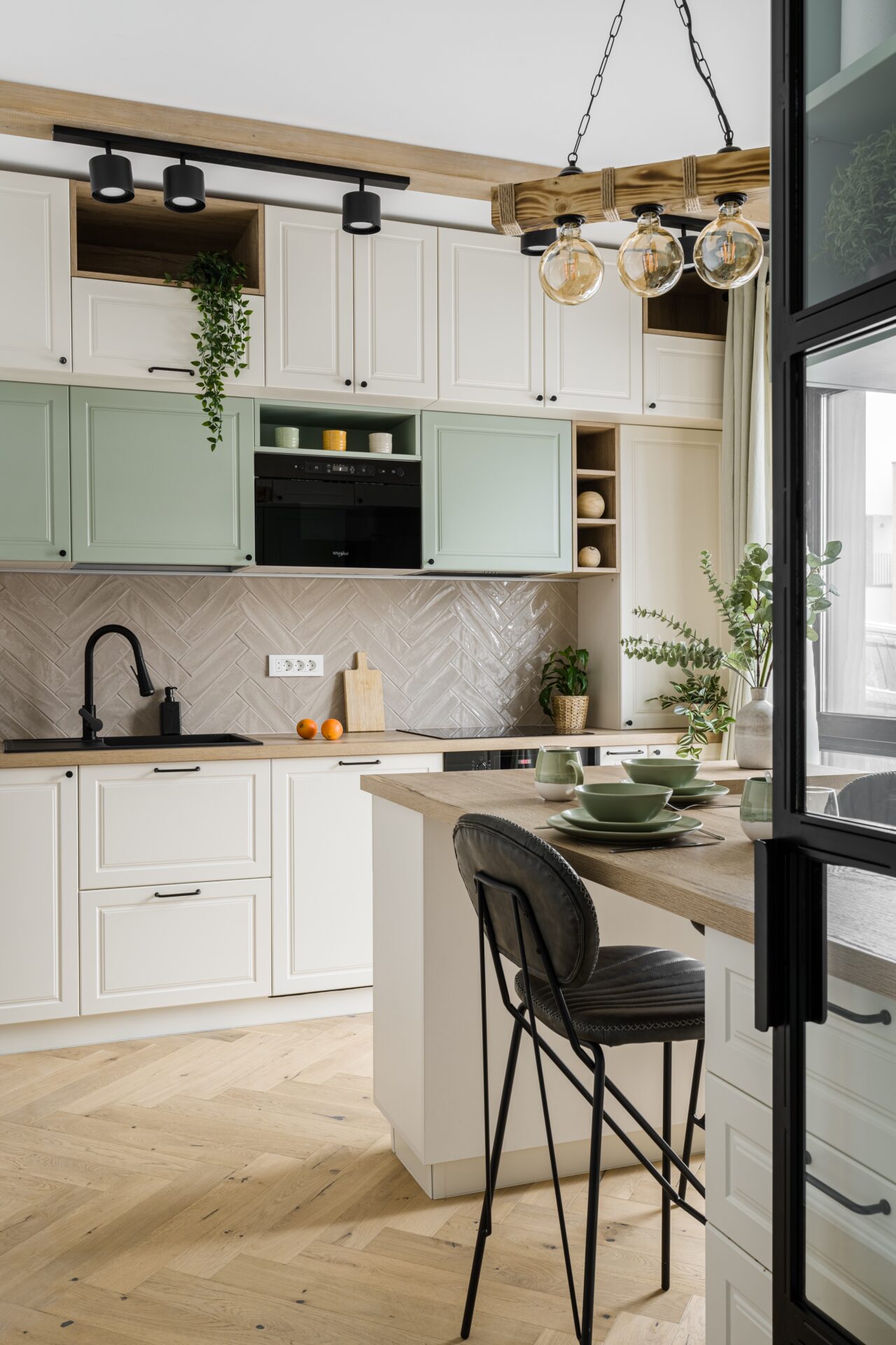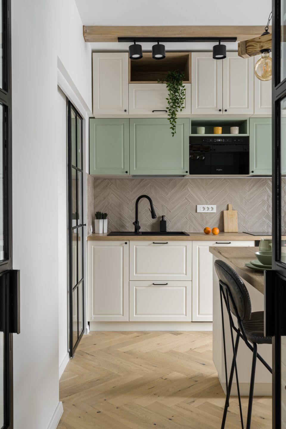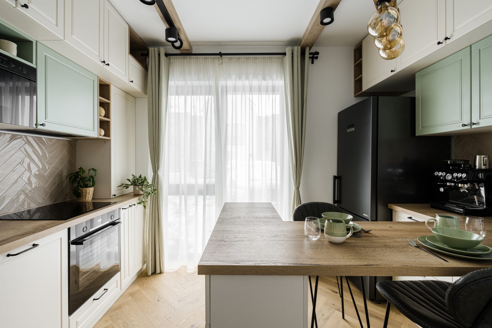 In bucătărie am montat 2 grinzi (stilul farmhouse) pe care le-am băițuit în nuanța parchetului pentru ca toate elementele de lemn din casă să facă parte din aceeași paletă cromatică. Pentru a păstra ‘firul roșu’ al amenajării sau, în cazul nostru, firul ‘negru’ 🙂 am închis bucătăria cu uși metalice fabricate în atelierul nostru.
