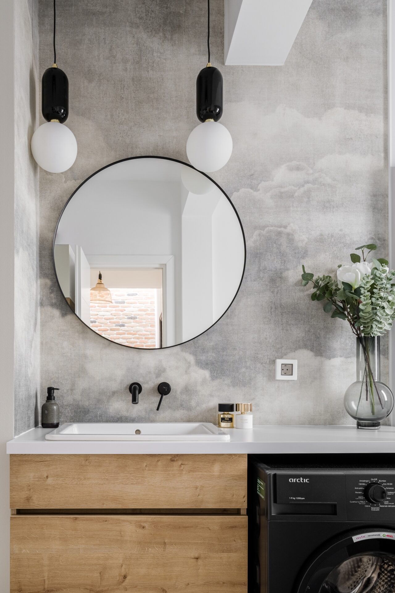 În baia de sus, clienții simțeau că atmosfera era prea impersonală; tapetul ales pentru peretele din spatele oglinzii conferă băii unicitate și personalitate.