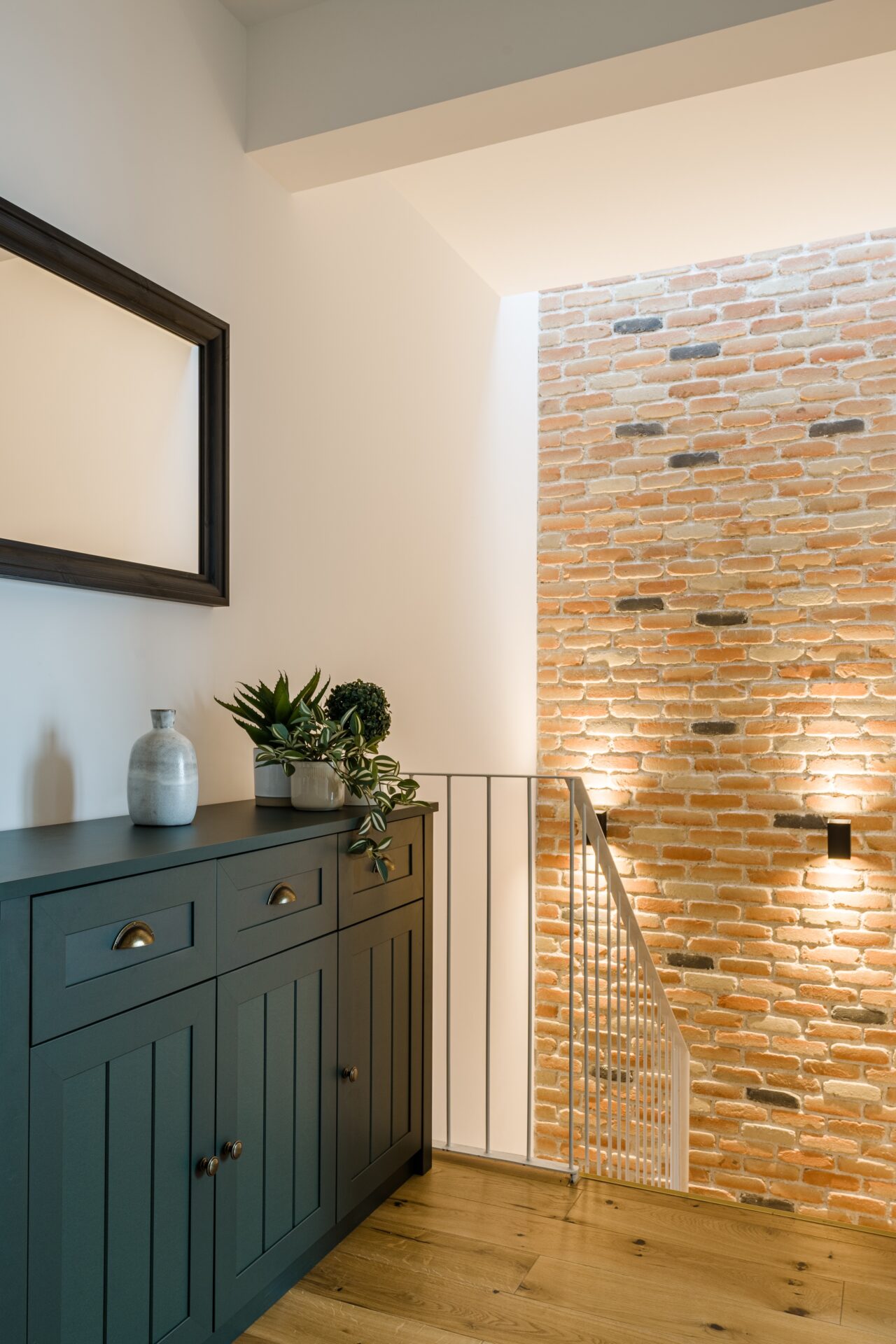 Pentru a ascunde obiectele depozitate sub casa scarii: la intrare, am creat o oglindă rotundă, astfel lumina încă poate trece, dar s-a ‘blocat’ câmpul vizual spre depozitare, mărind vizual intrarea cu un obiect absolut util. Iar în partea opusă am montat un riflaj al căror lamele le-am așezat la 45 grade, astfel încât din perspectiva care ne interesa nimic sub scară să nu fie vizibil, dar în același timp pastrand luminozitatea.
