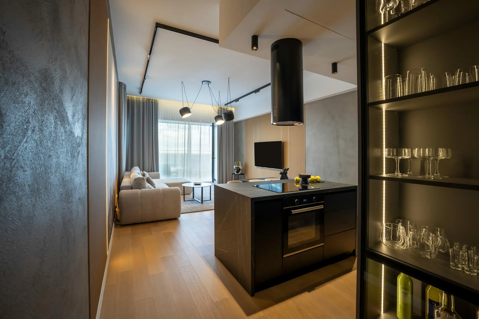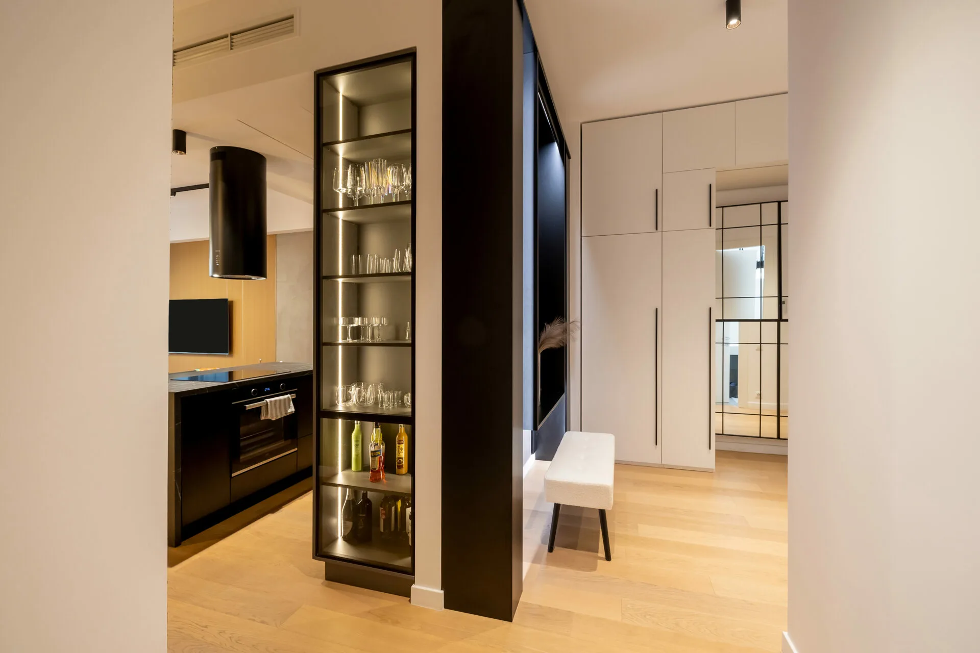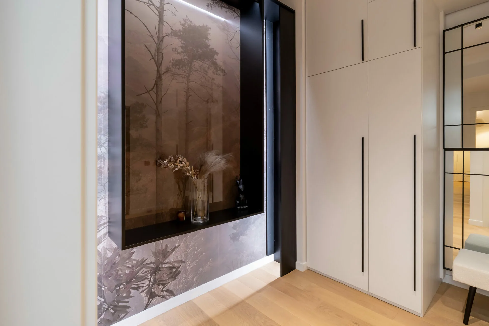 Inițial, holul de intrare avea o atmosferă întunecată și neprimitoare, ceea nu crea un efect inițial pozitiv. Am creat astfel, din momentul în care deschidem ușa în apartament, un capăt de perspectivă de impact, care să ne readucă aceeași senzație pe care o avem în momentul în care pășim în zona de living, și ni se arată toată priveliștea. Compoziția pe care am creat-o pe acel perete de la intrare, folosind astfel un ancadrament negru, sticlă, și grafică vegetală, a fost în ideea de a alcatui o fereastră falsă, conceptuală, care sa ne pastreze tonul întregului apartament, și să ne conducă cu gândul, din nou, către exterior. Aceeași temă a fost pastrată și în restul încăperilor : Zona de zi, un open-space alcătuit din living, bucătărie și dining, a fost completată de placări decorative în nuanțe calde, contrastate de pereții finisați în beton aparent – un contrast pe care-l regăsim atât de des în parcursul nostru urban.