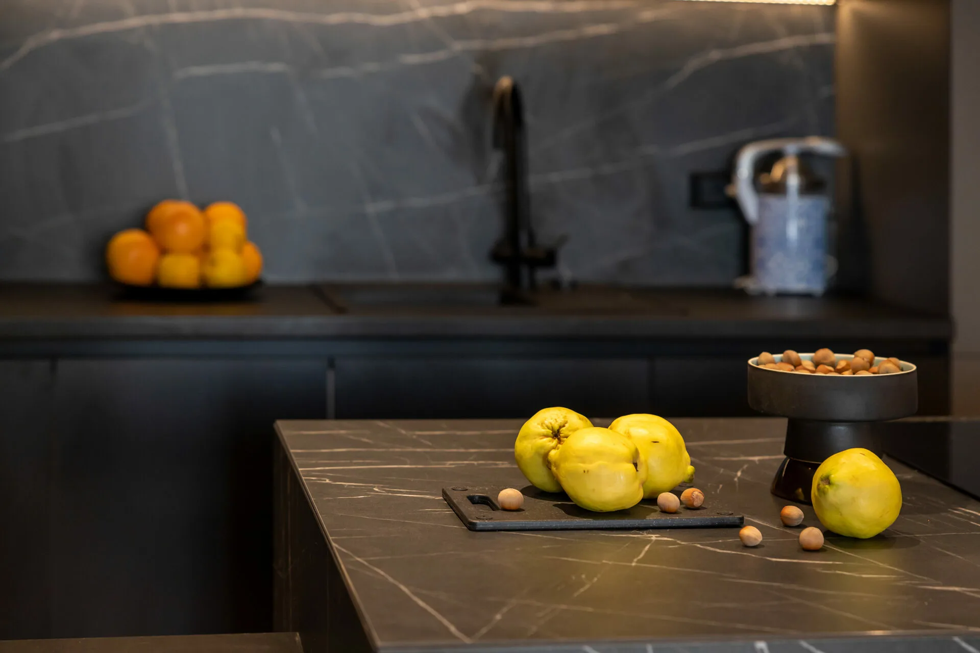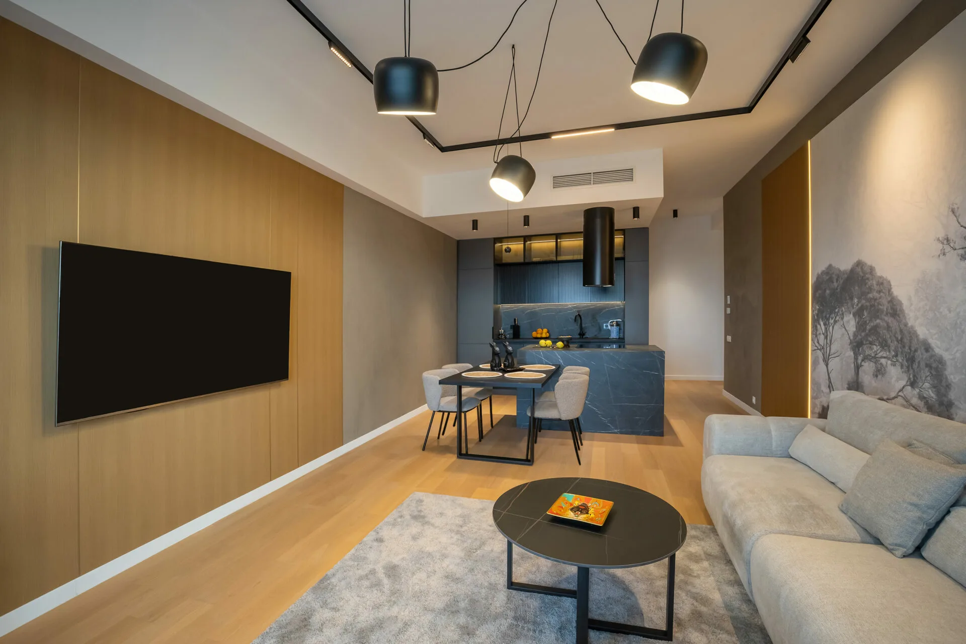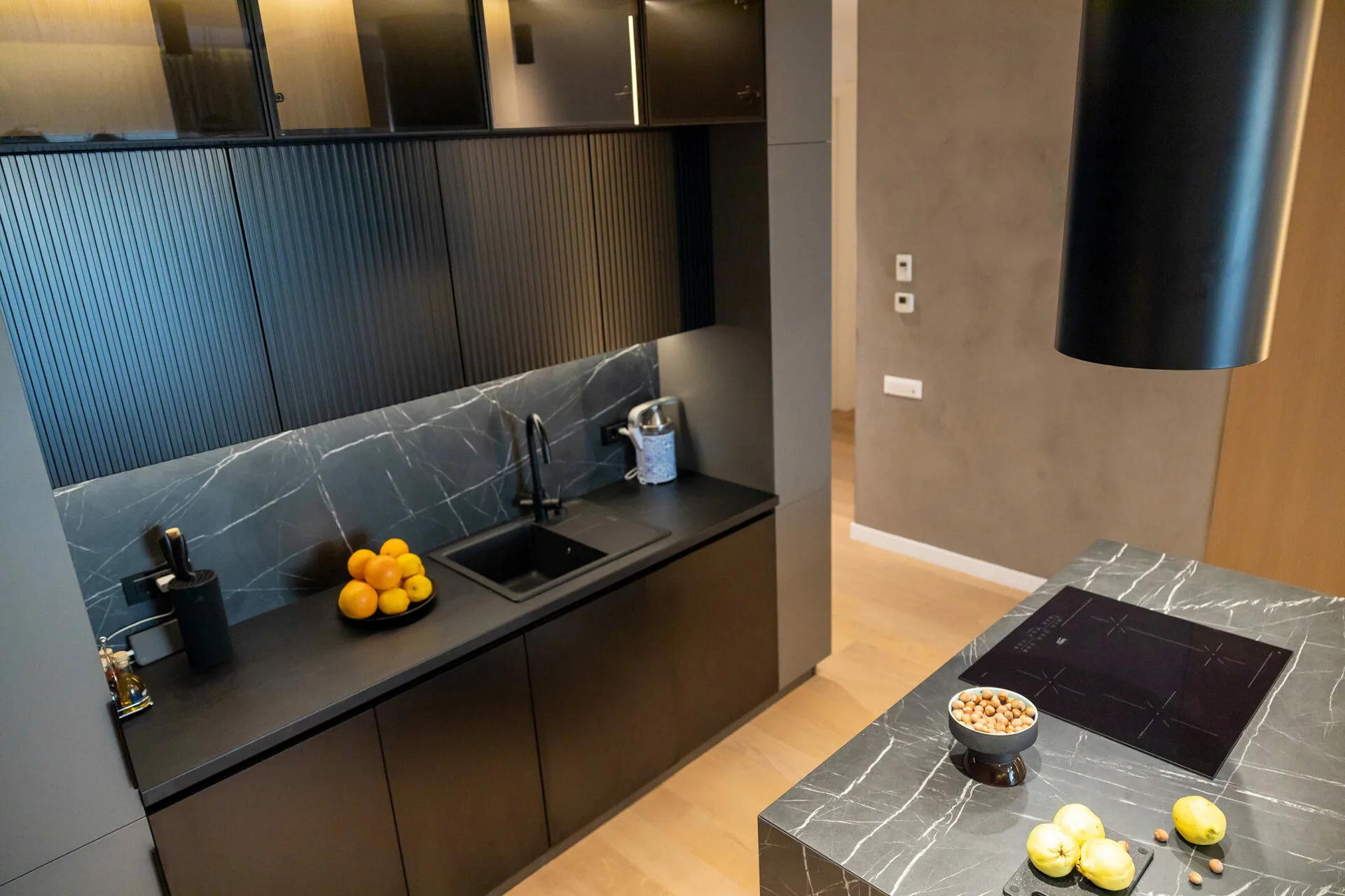 Inițial, holul de intrare avea o atmosferă întunecată și neprimitoare, ceea nu crea un efect inițial pozitiv. Am creat astfel, din momentul în care deschidem ușa în apartament, un capăt de perspectivă de impact, care să ne readucă aceeași senzație pe care o avem în momentul în care pășim în zona de living, și ni se arată toată priveliștea. Compoziția pe care am creat-o pe acel perete de la intrare, folosind astfel un ancadrament negru, sticlă, și grafică vegetală, a fost în ideea de a alcatui o fereastră falsă, conceptuală, care sa ne pastreze tonul întregului apartament, și să ne conducă cu gândul, din nou, către exterior. Aceeași temă a fost pastrată și în restul încăperilor : Zona de zi, un open-space alcătuit din living, bucătărie și dining, a fost completată de placări decorative în nuanțe calde, contrastate de pereții finisați în beton aparent – un contrast pe care-l regăsim atât de des în parcursul nostru urban.