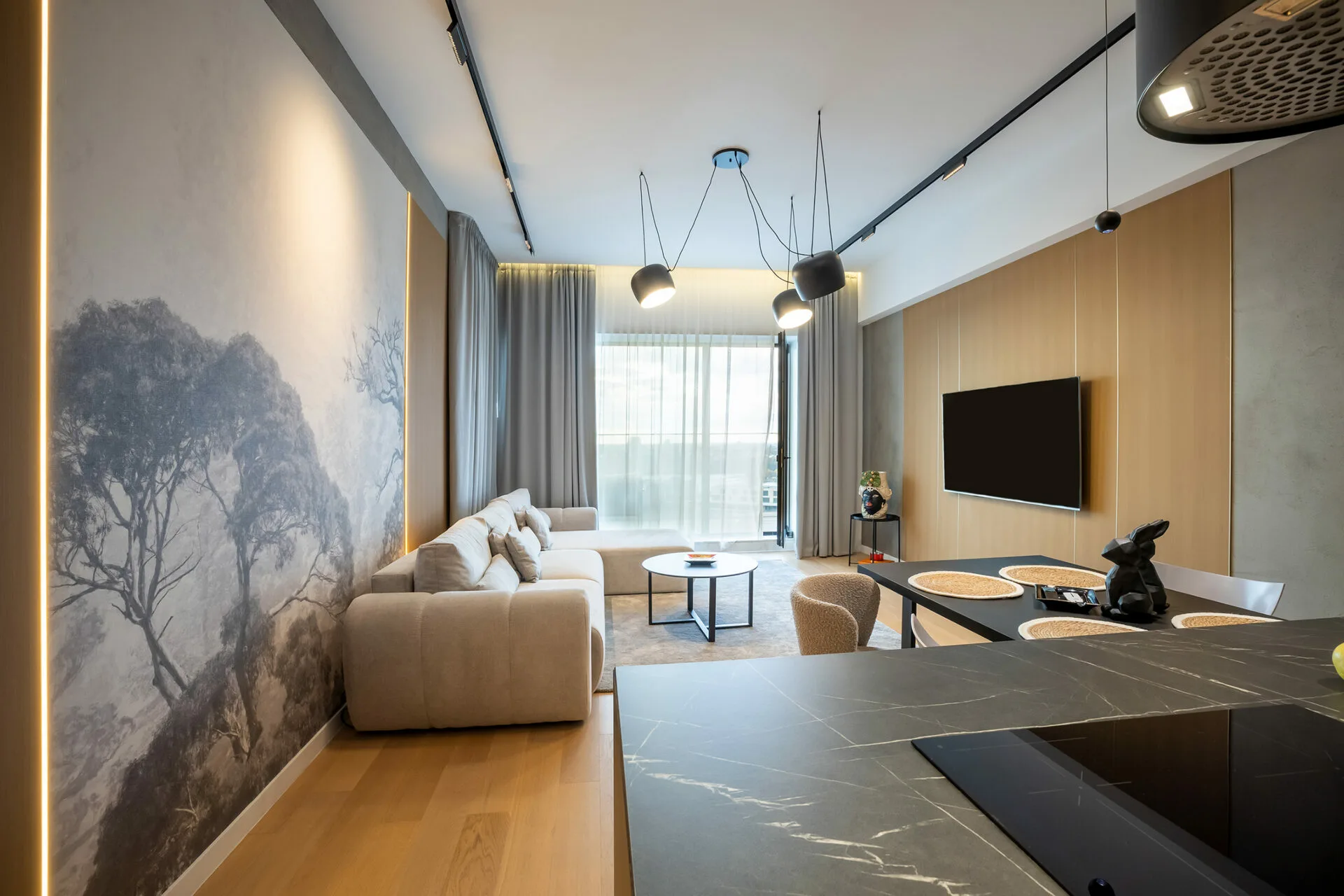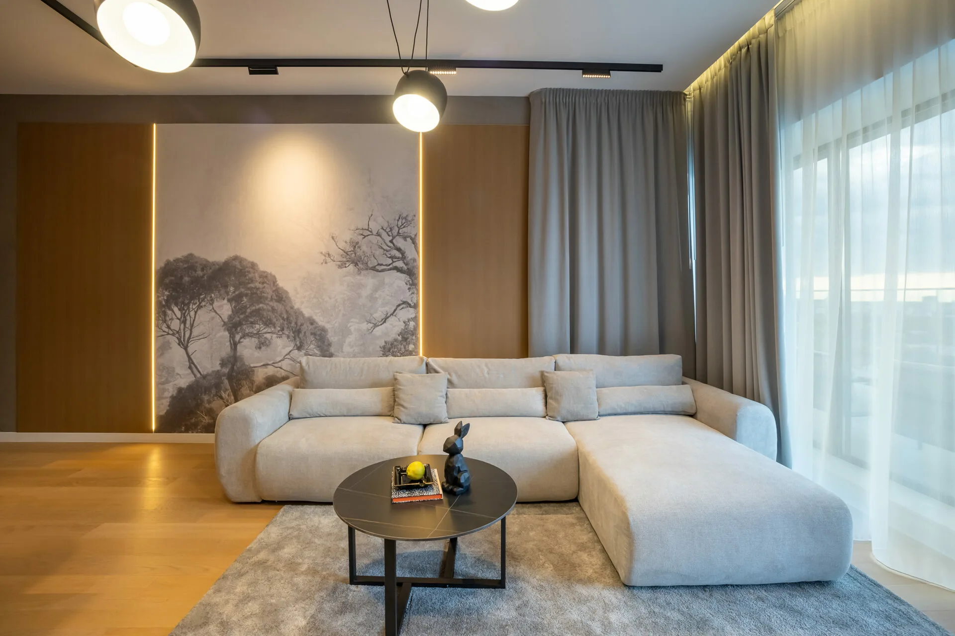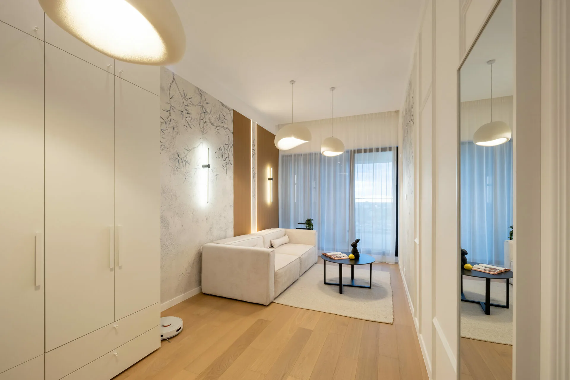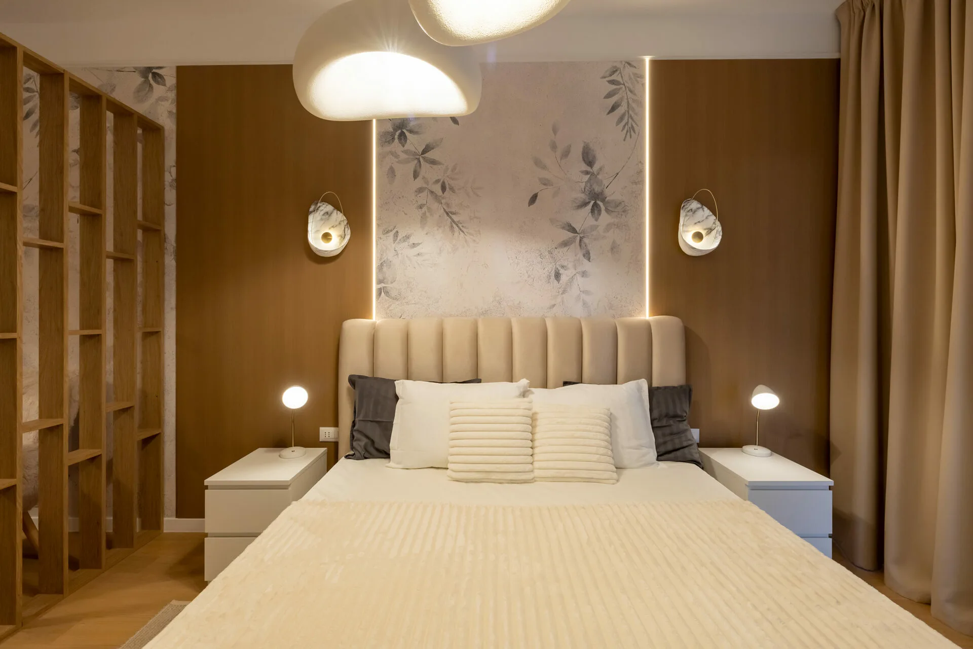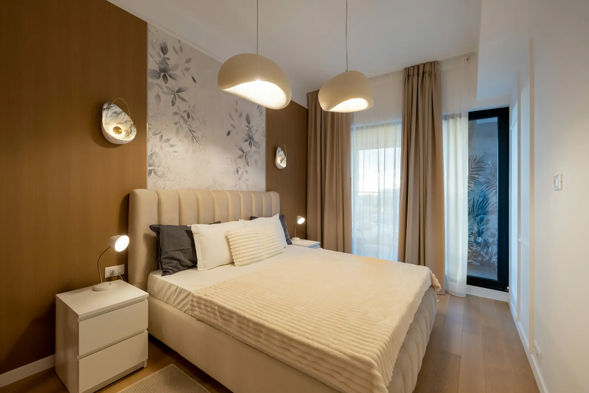 Dormitorul matrimonial emană calm și eleganță printr-un joc controlat al texturilor și luminii. Paleta cromatică este una caldă, dominată de nuanțe de bej, crem și maro deschis, care conferă senzația de confort și continuitate vizuală. Fiind un apartament care urma a fi închiriat, proprietarii și-au dorit o amenajare interioară cu un impact vizual puternic, însă cu accentul pus pe funcționalitate, pentru ca spațiul să poata fi adaptat oricărui chiriaș. Acest fapt a reprezentat astfel și cea mai mare provocare – am căutat întotdeauna să aducem echilibrul între ceea ce este estetic, și ceea ce este practic si funcțional. În final, acest apartament ramane o declarație clară despre cum spațiul poate deveni un instrument al stării de bine – pentru oricine va locui acolo. Însă reușita lui stă și în conceptul care îi definește identitatea: aducerea spațiului exterior la interior. Texturile naturale, lumina filtrată și fluiditatea compoziției ne arată cum granița dintre casă si natură, in final, se estompează și totul capătă coerență și sens.
