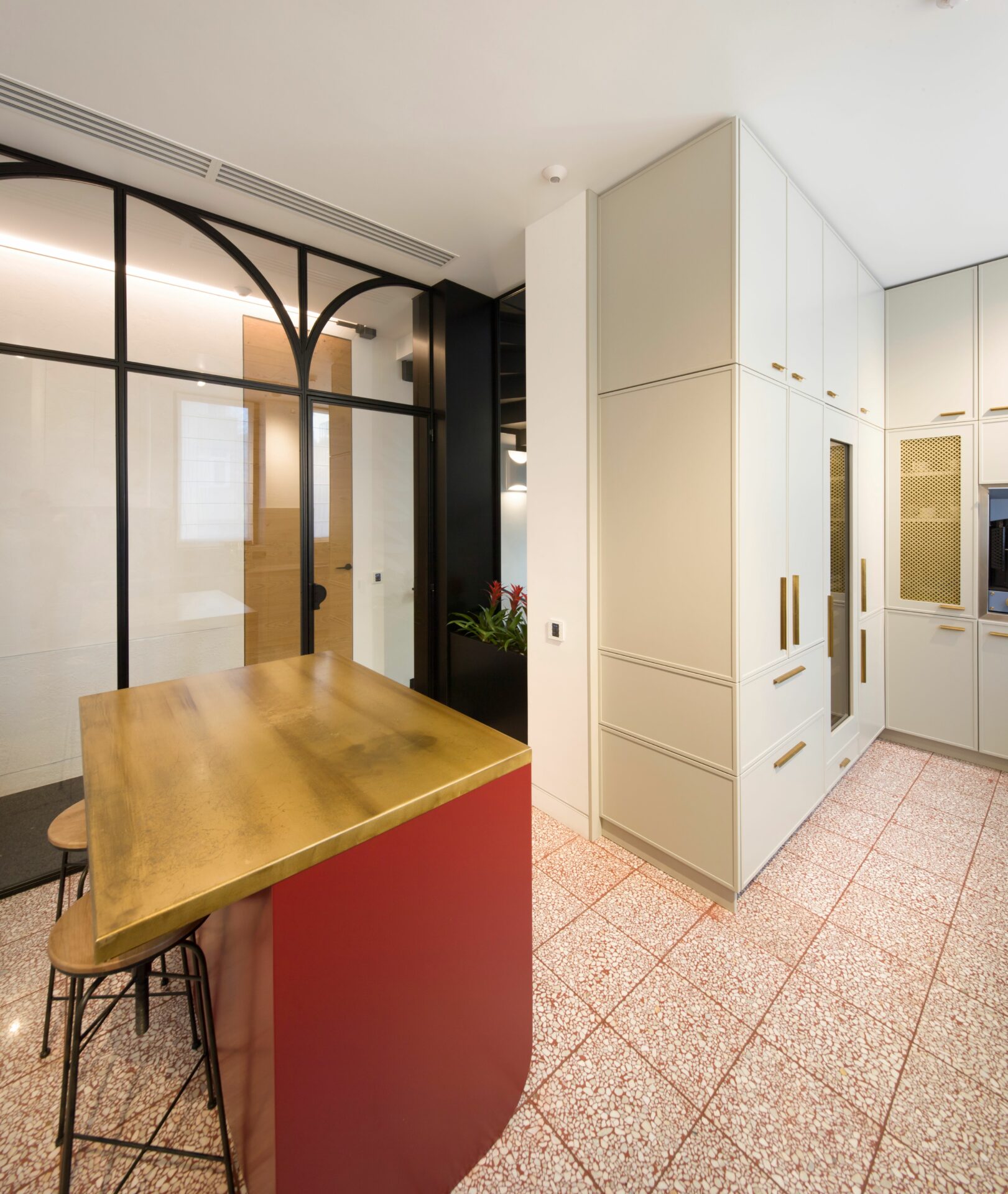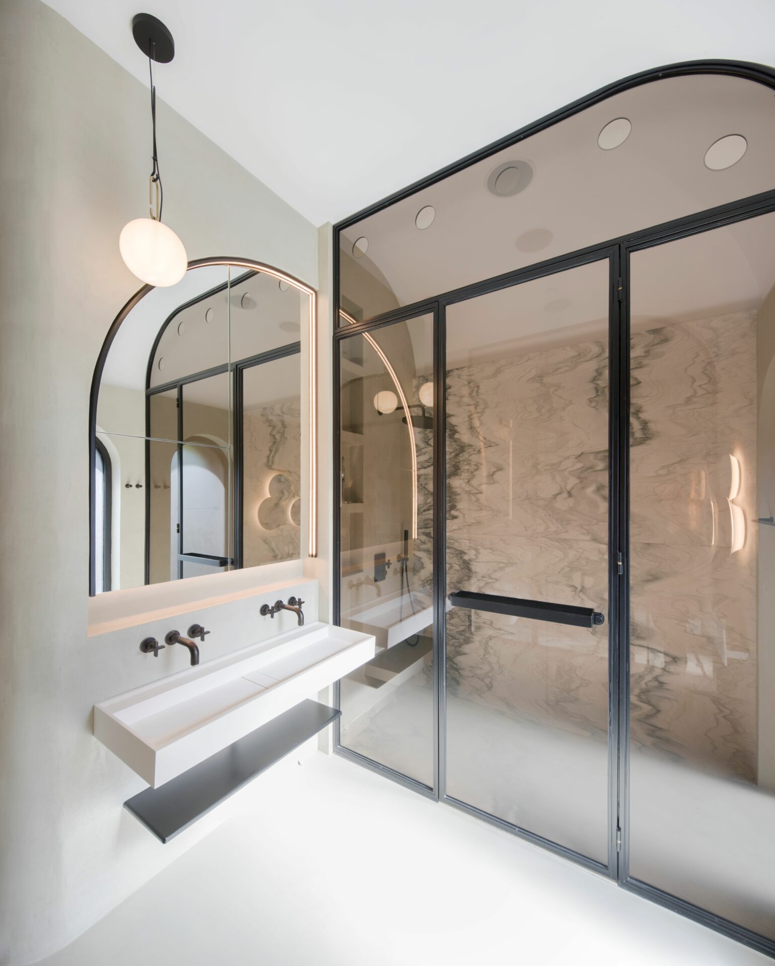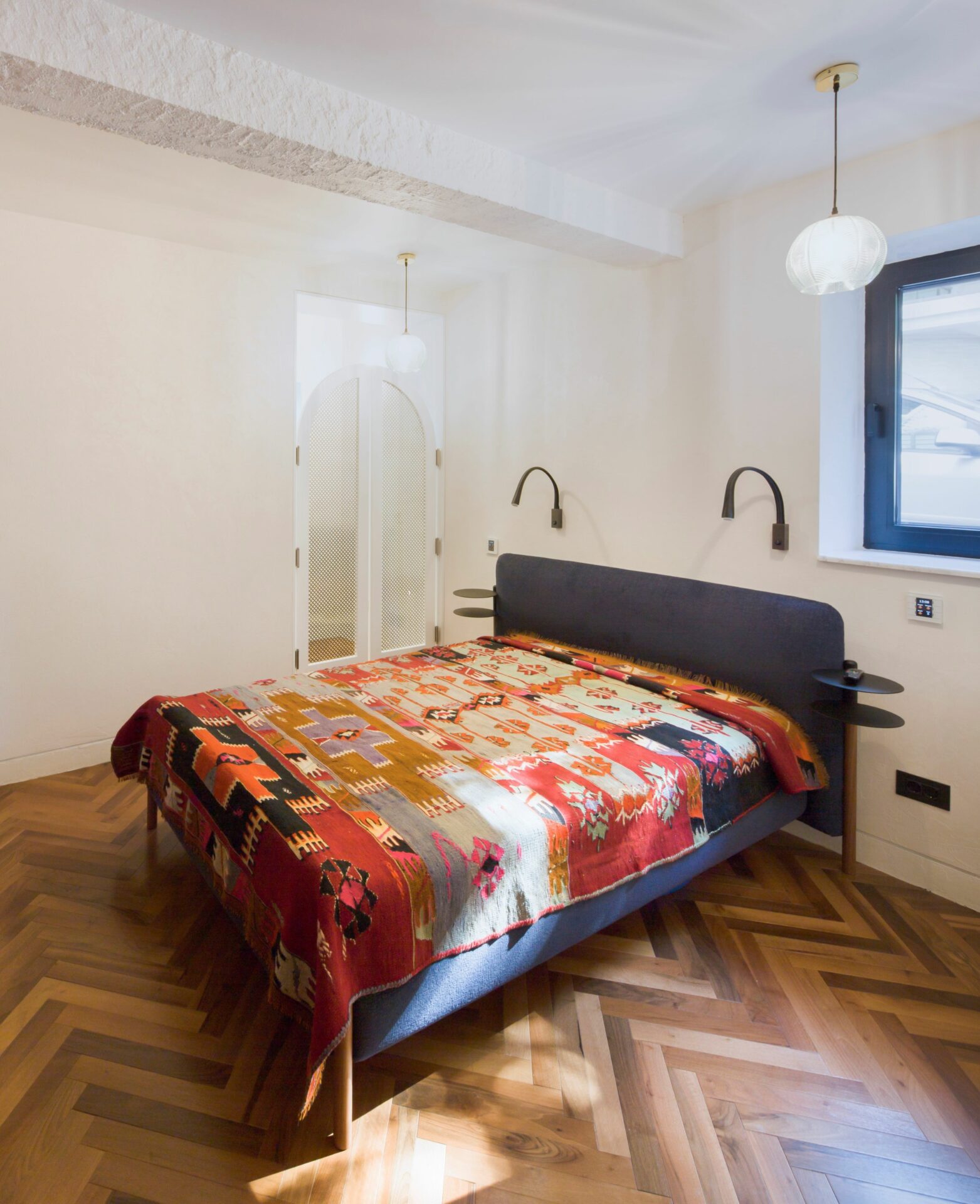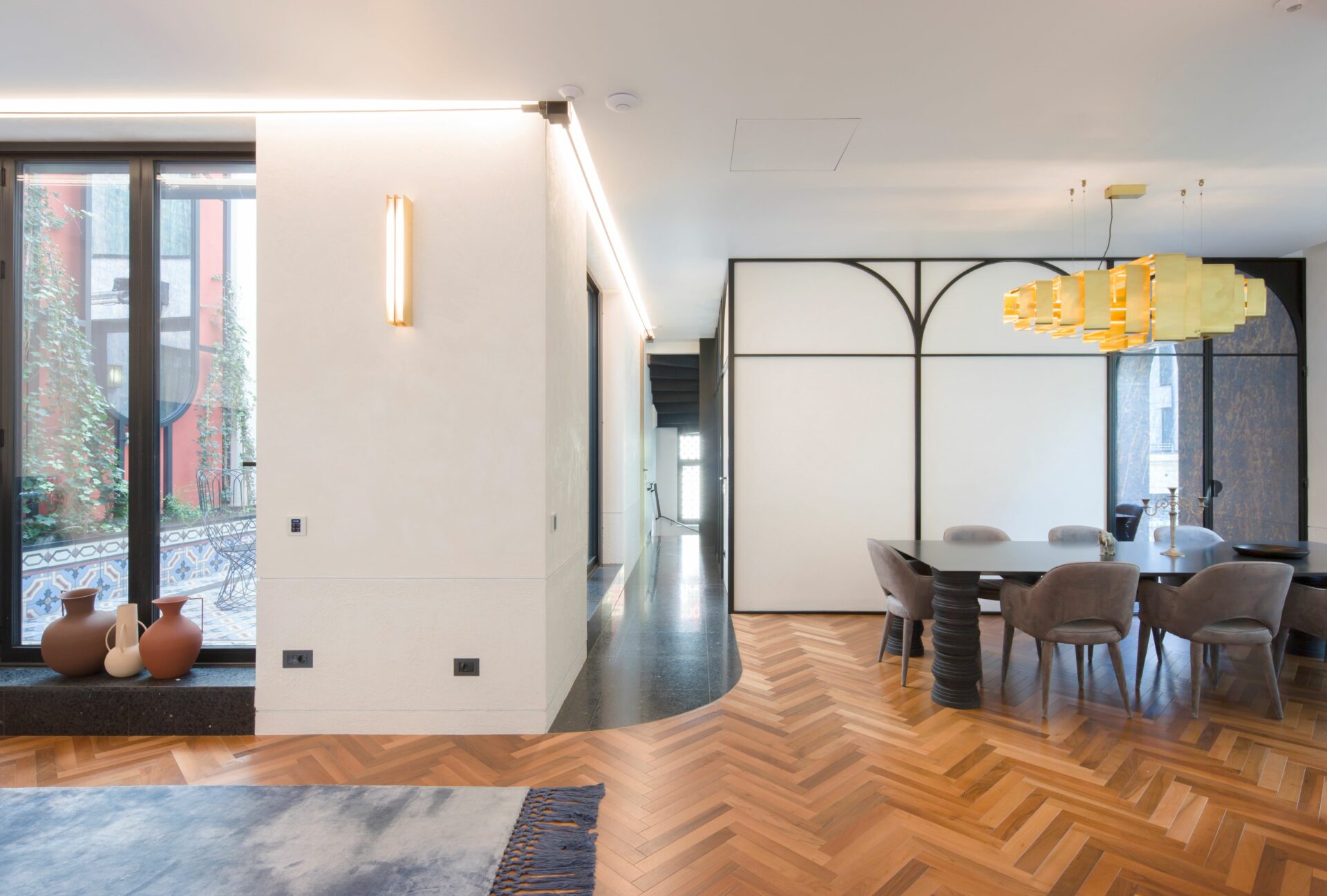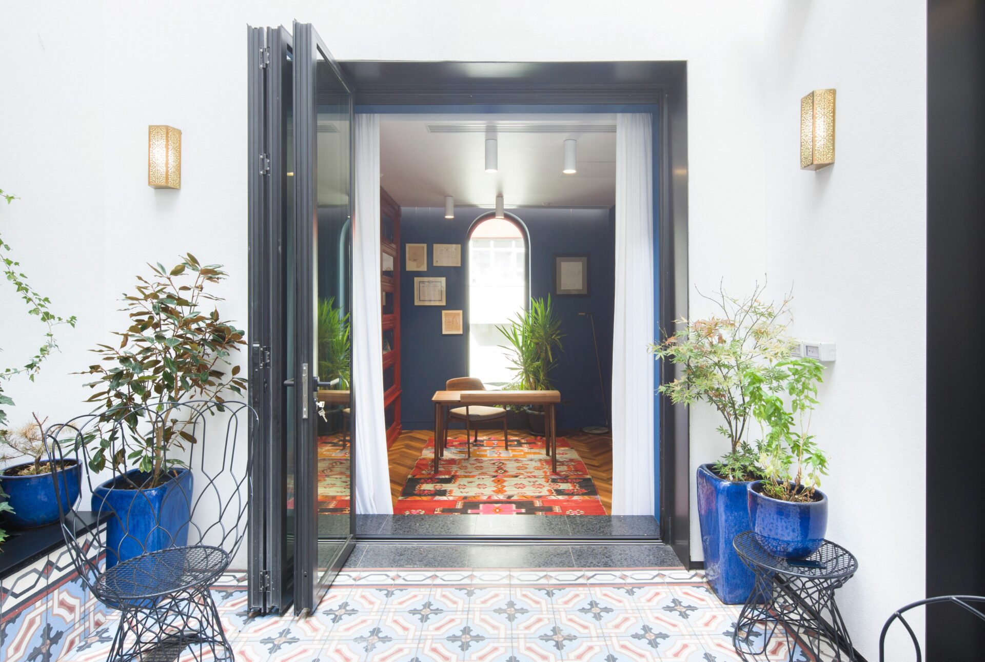 Caracteristici marocane au fost combinate, reinterpretate și stilizate, până s-a obținut un limbaj unitar, un parcurs coerent de la exterior, din stradă, până la interior, la elementele de decor și detaliile mobilierului. Parcursul de la fațadele discrete, aproape sobre, la mozaicul colorat și mobilierul aproape filigramat din inima casei se face lin, prin introducerea treptată, atent dozată a detaliile de arhitectură și culorilor. Cele două elemente coagulante, ce țin împreună întregul proiect, sunt arcul de cerc și traforul. Arcul de cerc se regăsește atât în detaliile arhitecturale ale fațadei, cât și în elementele de design interior: arcade, scafe, desene în pardoseală, subtile decupaje în mobilă. De la metru la milimetru, scara arcelor se schimbă trasând povestea casei. Traforul este folosit că un instrument de „modelare” a luminii: la ferestre, detalii de mobilier și corpuri de iluminat, lumina este filtrată și transformată în jocuri de umbre subtile, ce aduc un plus decorului. Că și paletă cromatică, tonurile neutre de gri deschis și alb sunt completate de pete de culoare, albastru și roșu, în diverse nuanțe, dozate cu grijă pentru fiecare spațiu și complementate de detaliile de alamă . Întreaga casă este orientată către curtea interioară, o camera decupată chiar în mijloc, bogat ornamentată cu pardoseală din mozaic, oglinzi și plante. Ferestrele mari, orientate spre curte, aproape anulează limitele fizice dintre spatii, creând iluzia unui amplu spațiu deschis. Materialele și detaliile moderne de plinte îngropate, nuturi, inserții de baghete sunt completate de tencuielile tradiționale marocane de tip tadelact.