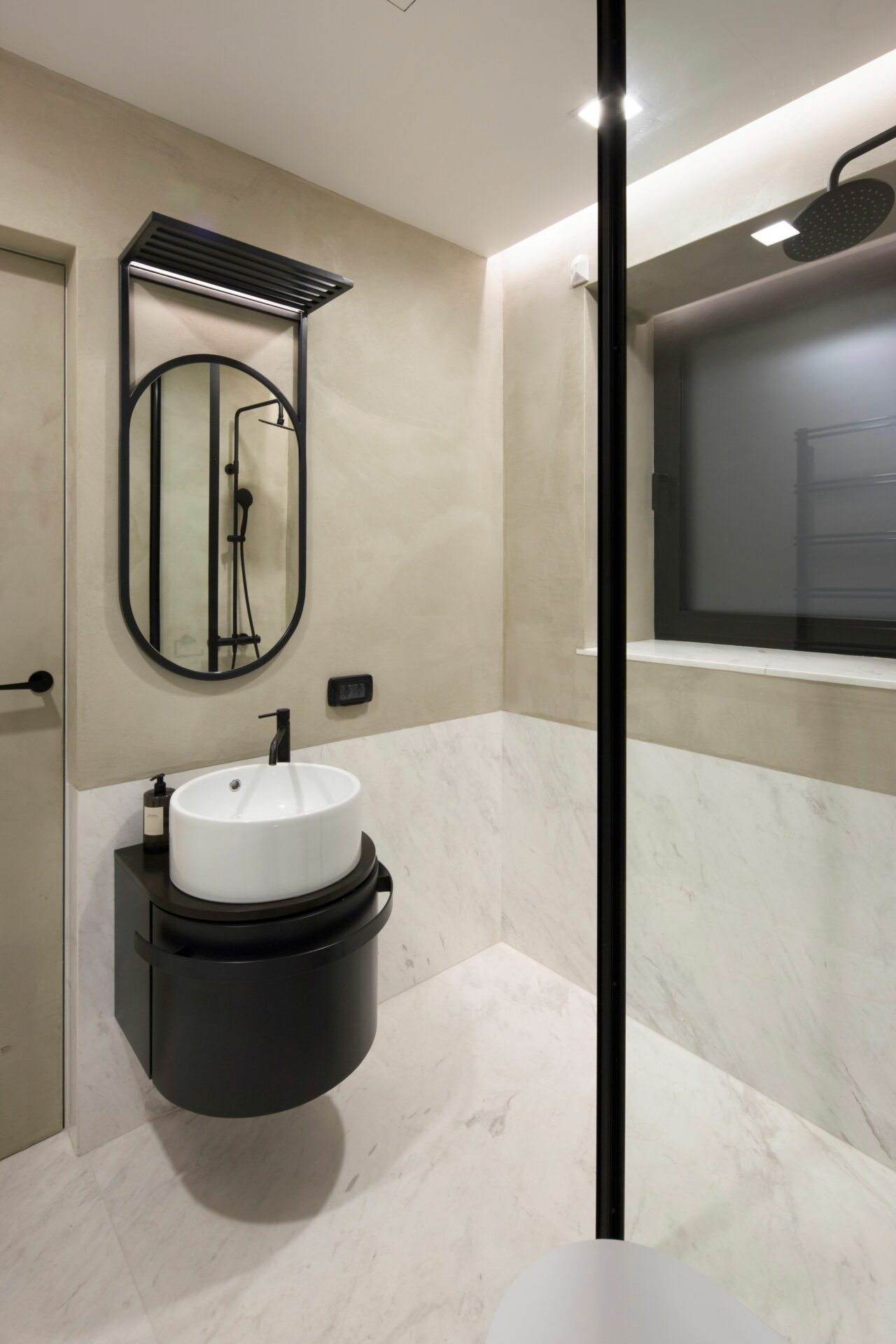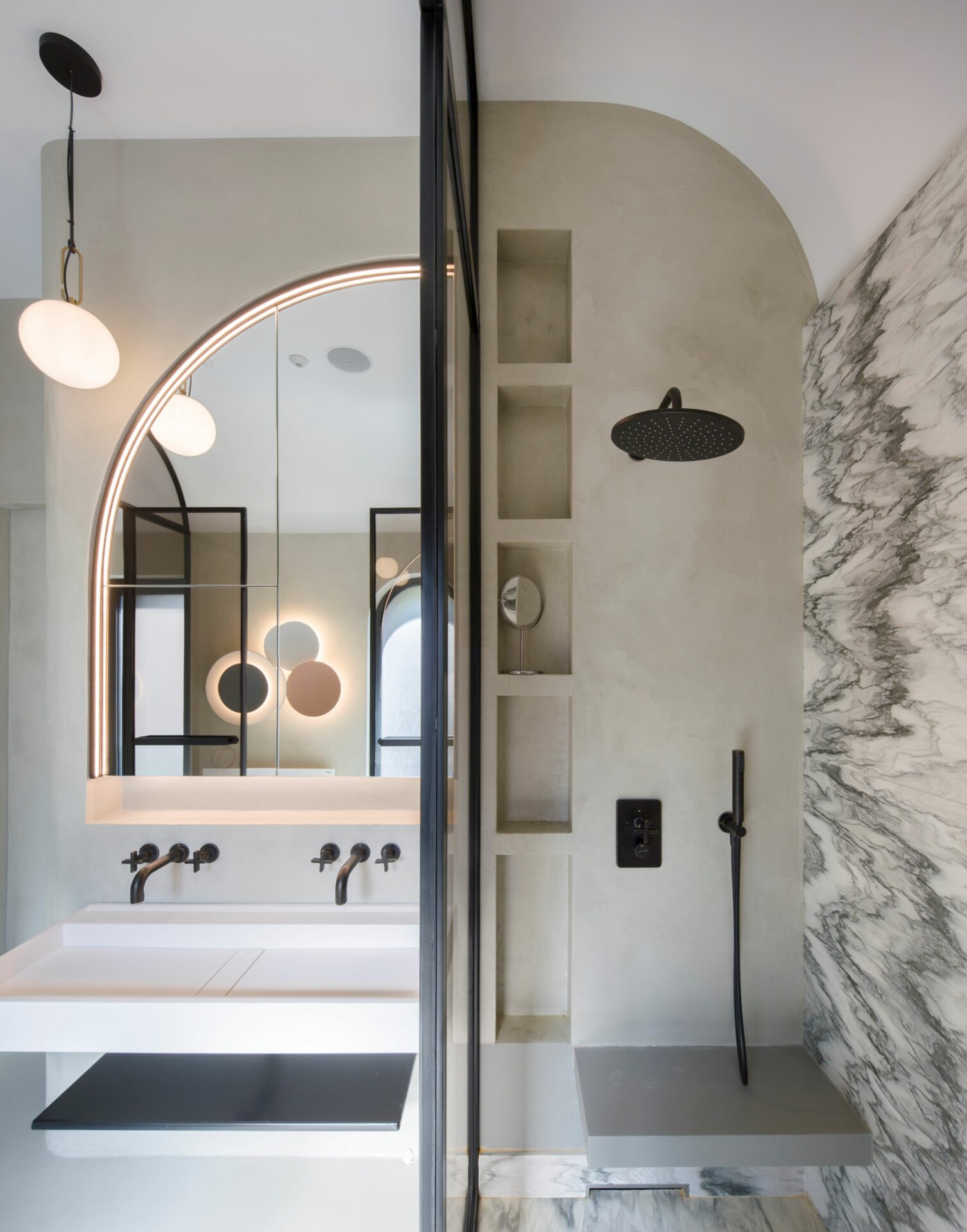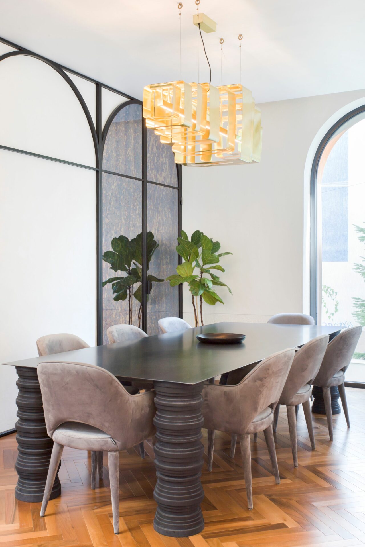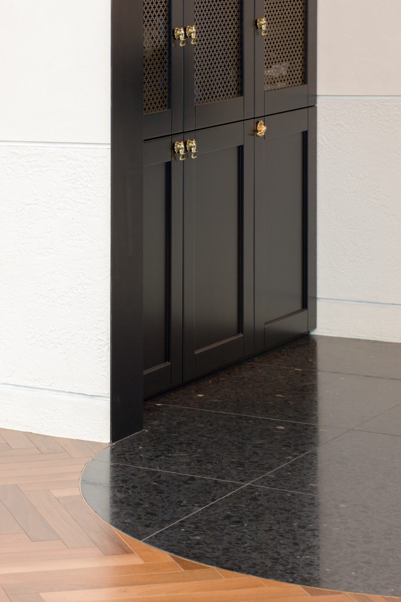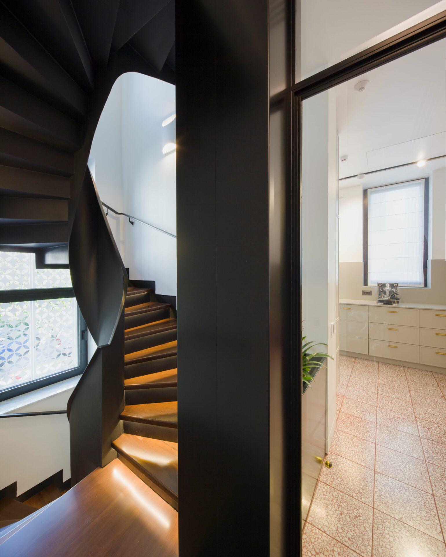 Caracteristici marocane au fost combinate, reinterpretate și stilizate, până s-a obținut un limbaj unitar, un parcurs coerent de la exterior, din stradă, până la interior, la elementele de decor și detaliile mobilierului. Parcursul de la fațadele discrete, aproape sobre, la mozaicul colorat și mobilierul aproape filigramat din inima casei se face lin, prin introducerea treptată, atent dozată a detaliile de arhitectură și culorilor. Cele două elemente coagulante, ce țin împreună întregul proiect, sunt arcul de cerc și traforul. Arcul de cerc se regăsește atât în detaliile arhitecturale ale fațadei, cât și în elementele de design interior: arcade, scafe, desene în pardoseală, subtile decupaje în mobilă. De la metru la milimetru, scara arcelor se schimbă trasând povestea casei. Traforul este folosit că un instrument de „modelare” a luminii: la ferestre, detalii de mobilier și corpuri de iluminat, lumina este filtrată și transformată în jocuri de umbre subtile, ce aduc un plus decorului. Că și paletă cromatică, tonurile neutre de gri deschis și alb sunt completate de pete de culoare, albastru și roșu, în diverse nuanțe, dozate cu grijă pentru fiecare spațiu și complementate de detaliile de alamă . Întreaga casă este orientată către curtea interioară, o camera decupată chiar în mijloc, bogat ornamentată cu pardoseală din mozaic, oglinzi și plante. Ferestrele mari, orientate spre curte, aproape anulează limitele fizice dintre spatii, creând iluzia unui amplu spațiu deschis. Materialele și detaliile moderne de plinte îngropate, nuturi, inserții de baghete sunt completate de tencuielile tradiționale marocane de tip tadelact.