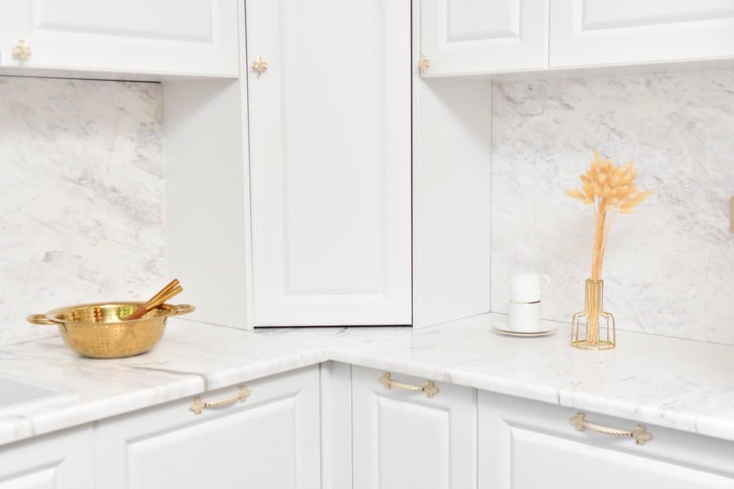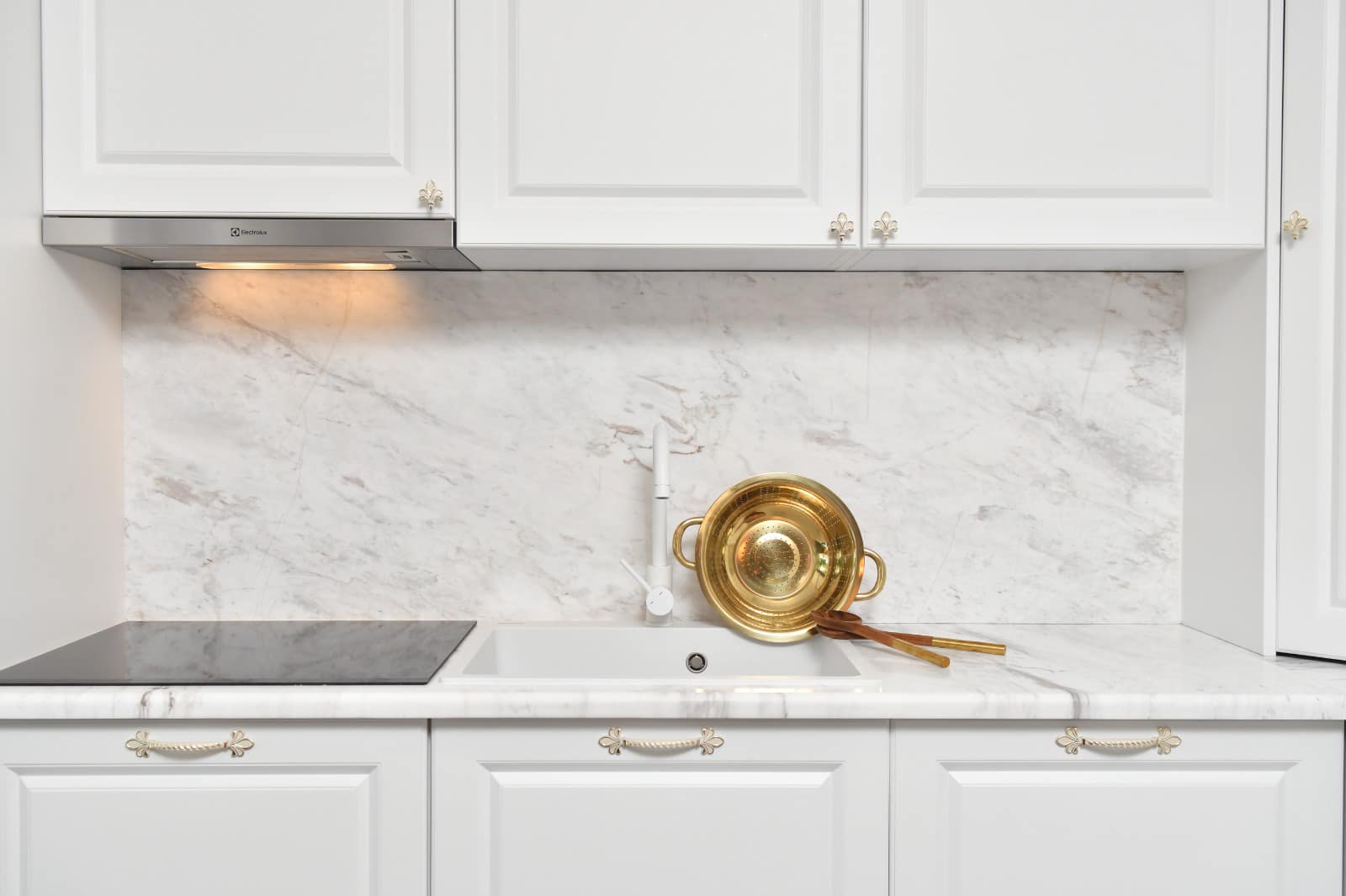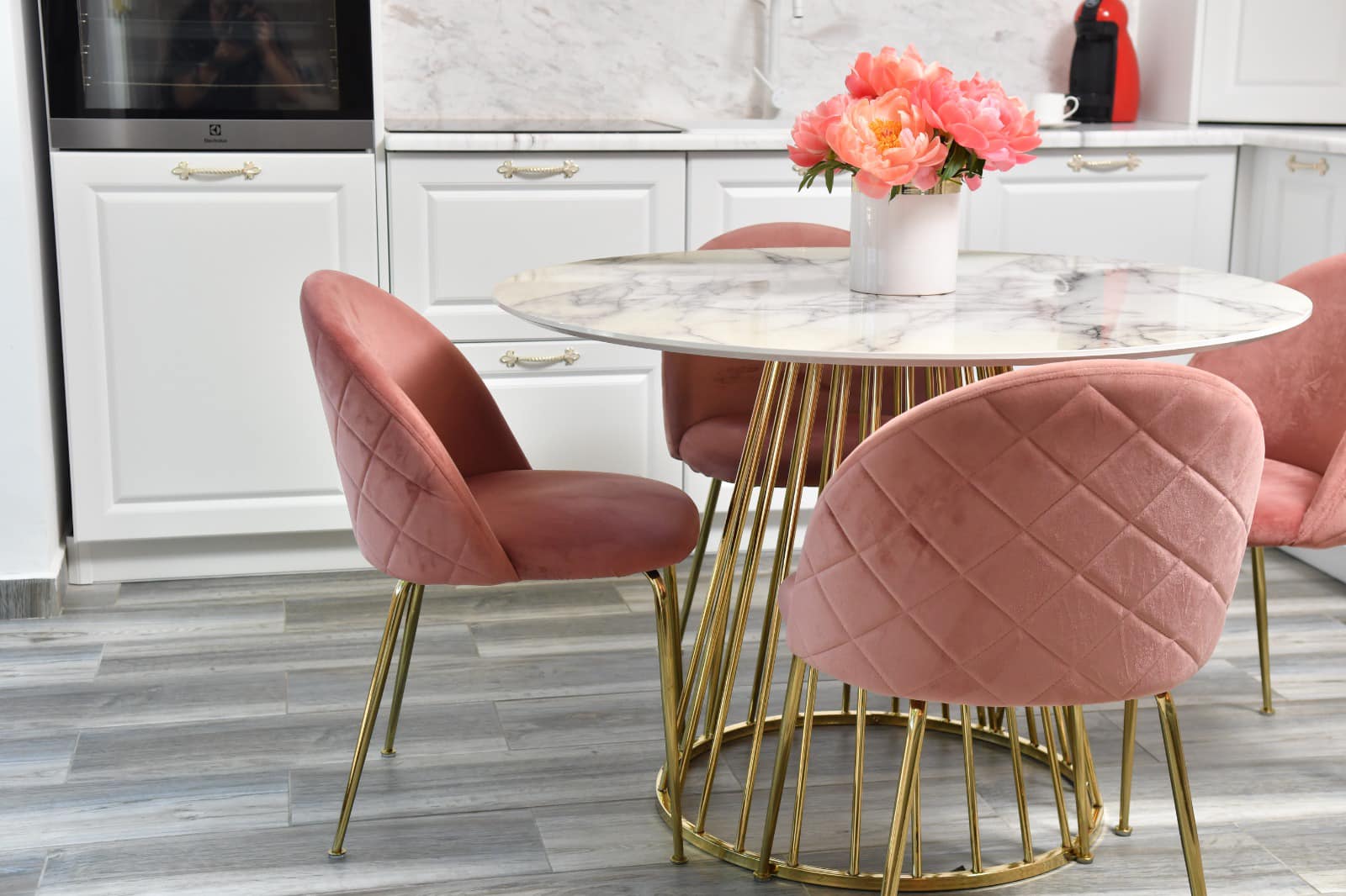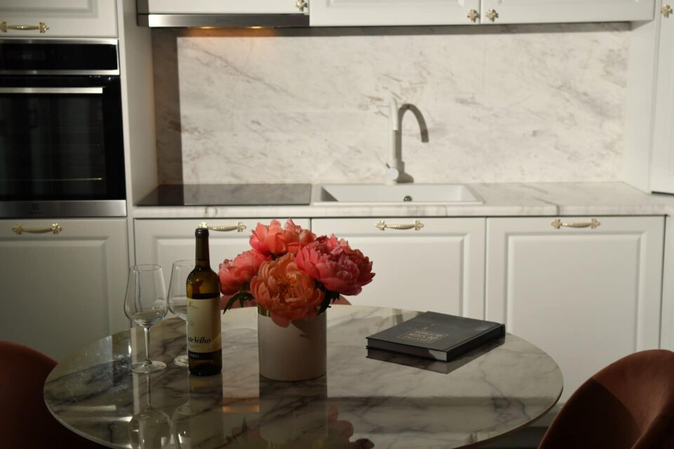 Bucătăria: „White marble kitchen with a taste of gold!” Acesta este spațiul în cadrul căruia se poate remarca cel mai bine contopirea dintre modern și clasic, cu elemente majore: marmura – blatul accentuează orizontalitatea și finețea liniilor, auriul metalic – o culoare puternică ‘stinsă’ ulterior de albul simplu. Spațiu simplu, prețios, modern și funcțional. Bucătăria este extrem de primitoare și elegantă în același timp, datorită blatului și contrablatului din marmură, dar și mobilierului în stil clasic cu fronturi mari, ce deschide vizual spațiul. Încăperea se deschide către terasă, beneficiind din plin de lumina naturală.