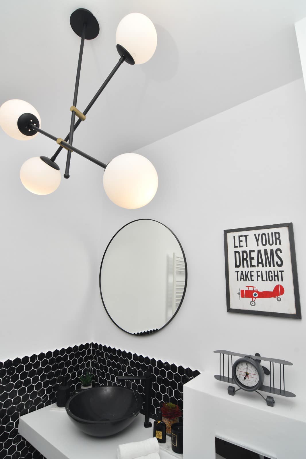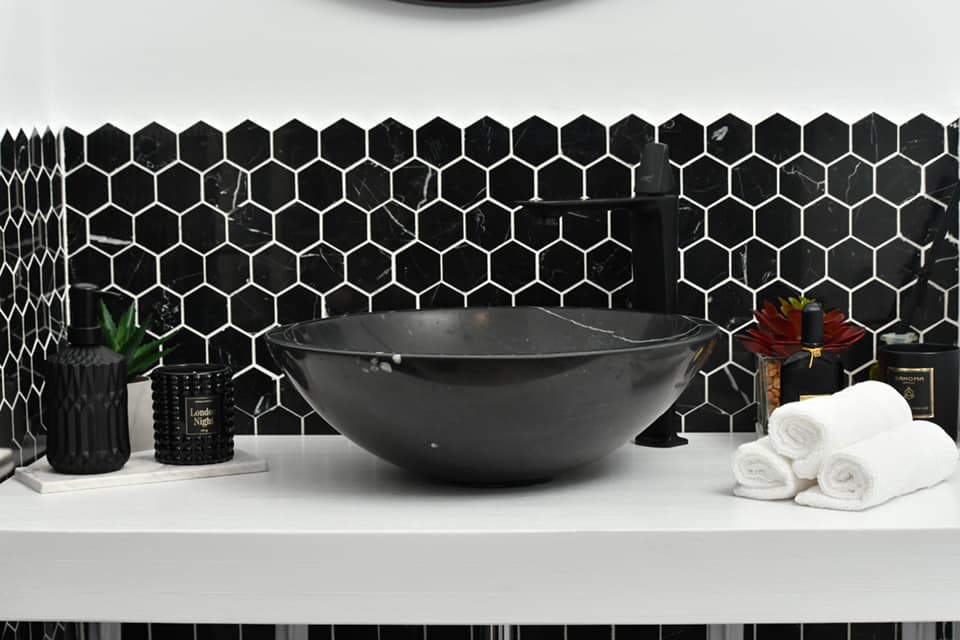 Baia Neagră cu Efect Moody⚜️: Conceptul de amenajare al băii a pornit de la ideea optimizării spațiului și potențării lui din punct de vedere funcțional. S-a acordat o atenție deosebită finisajelor pentru a crea un interior modern: s-au folosit materiale naturale, precum lemnul masiv, alături de plăcări cu mozaic din marmură de culoare neagră – hexagonală în zona corpului de mobilier și pardoseală din marmură, mobilier personalizat, obiecte sanitare suspendate. Baia inspiră masculinitate prin texturi, culori și finisaje, ambientul creat fiind unul dinamic și reconfortant. S-a apelat la un joc de pattern-uri și accente cromatice intense – contrastul între alb și negru creând un accent vizual puternic. Beneficiarul, lucrând în domeniul aviației, a cerut o temă pentru această baie.