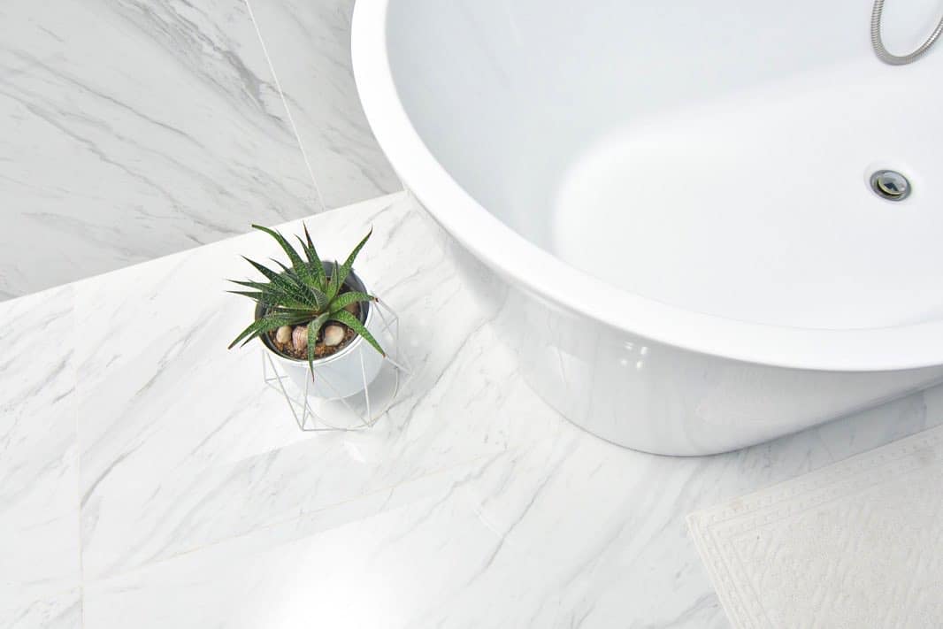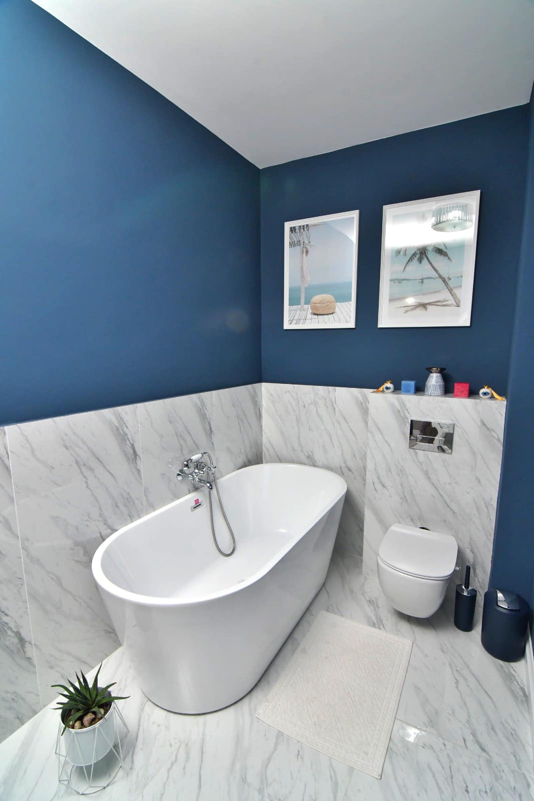 Baia Matrimonială: „White and blue bathroom”. Textura marmurei albe, obiectele independente și relieful mobilierului definesc un spațiu luminos, modern și sofisticat. Cada freestanding aduce eleganța necesară unui spațiu rezervat răsfățului.