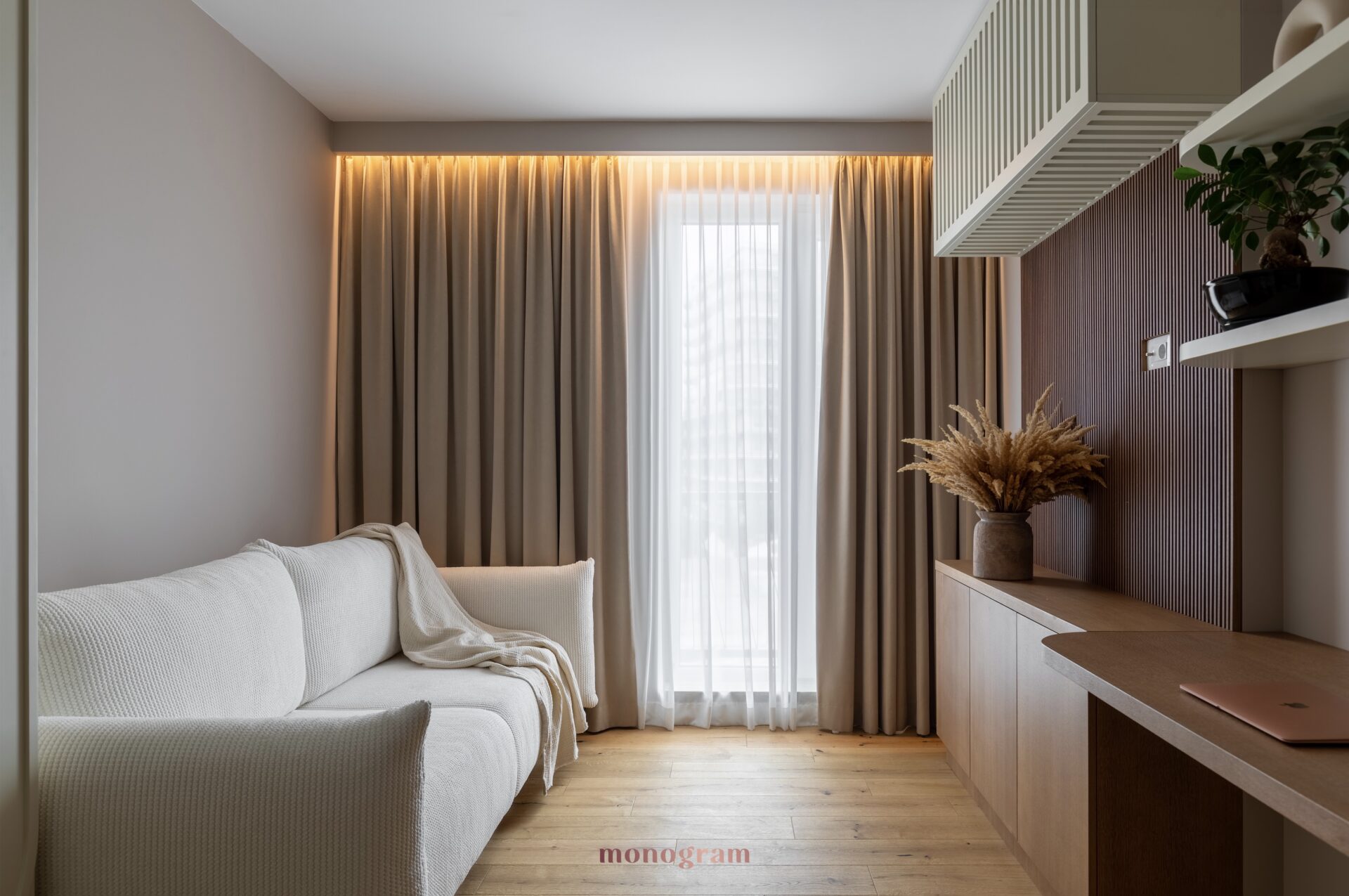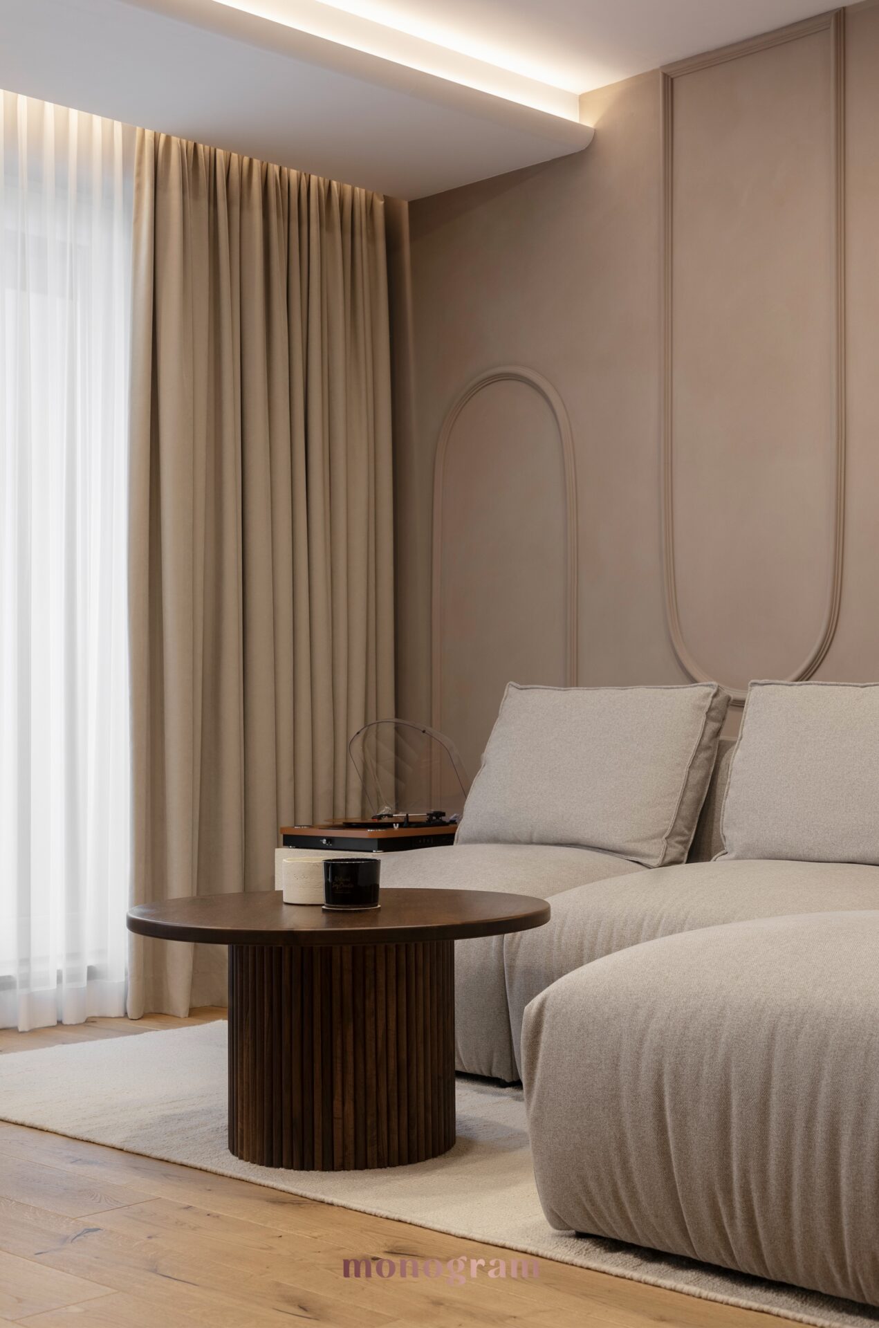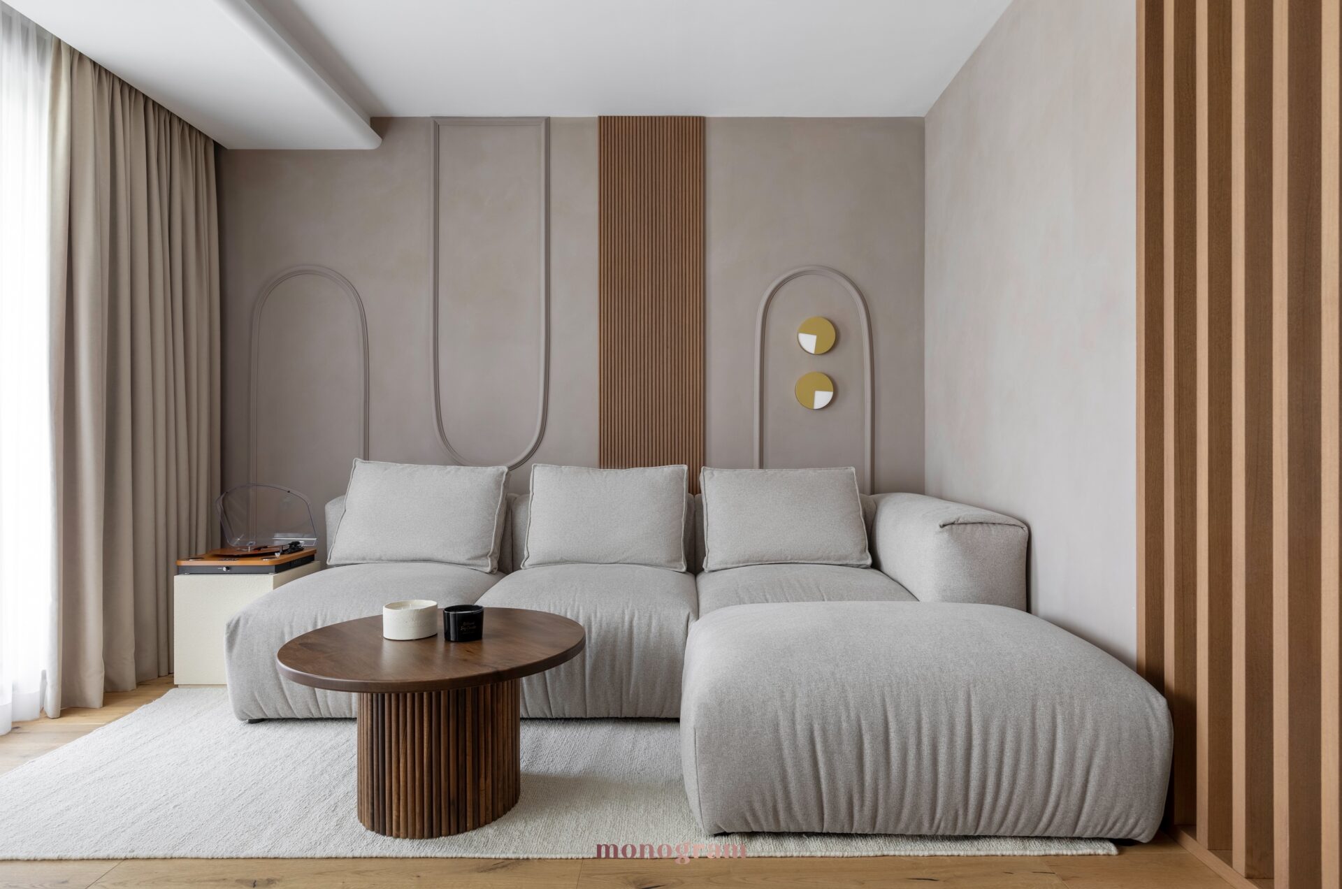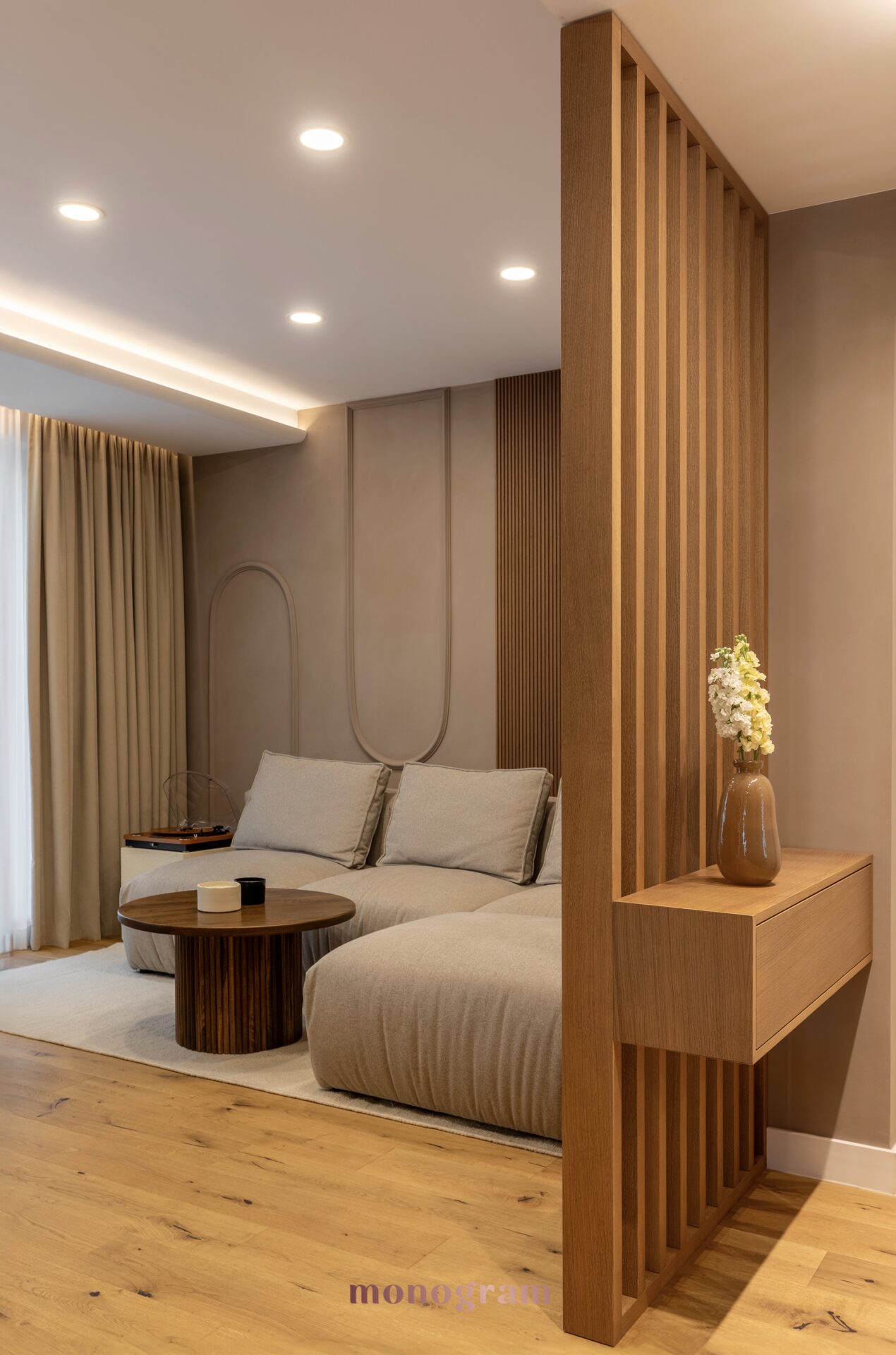• Mobilier: Canapeaua modulara din țesături neutre, completate de o masă de cafea din lemn masiv, întruchipează ethosul Wabi-Sabi.