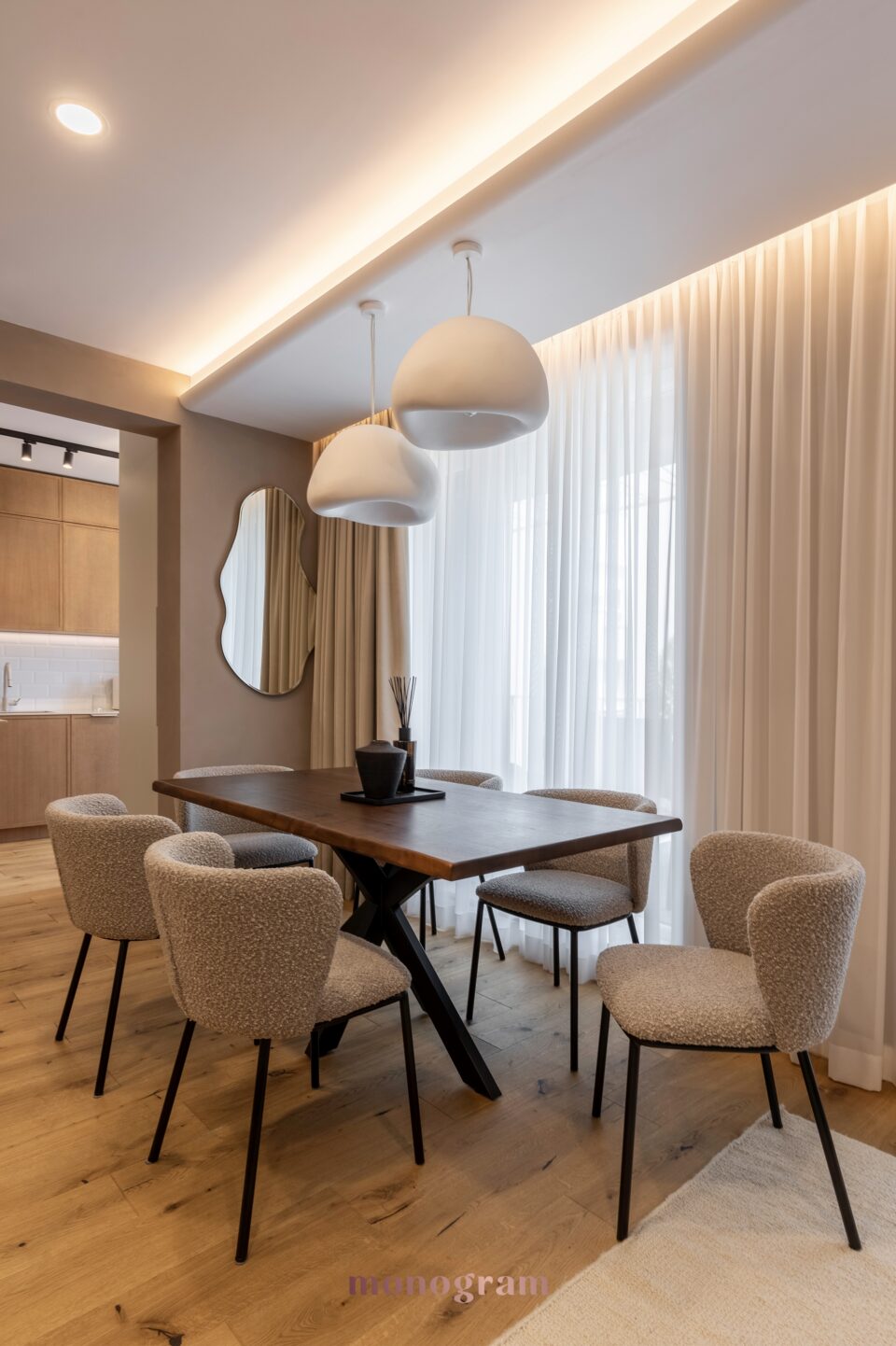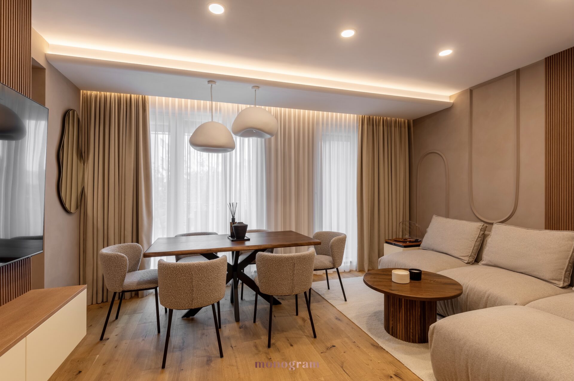 • Plan deschis: Amenajarea maximizează cei 71 mp prin spații multifuncționale, delimitate subtil prin tranziții de materiale și iluminat.