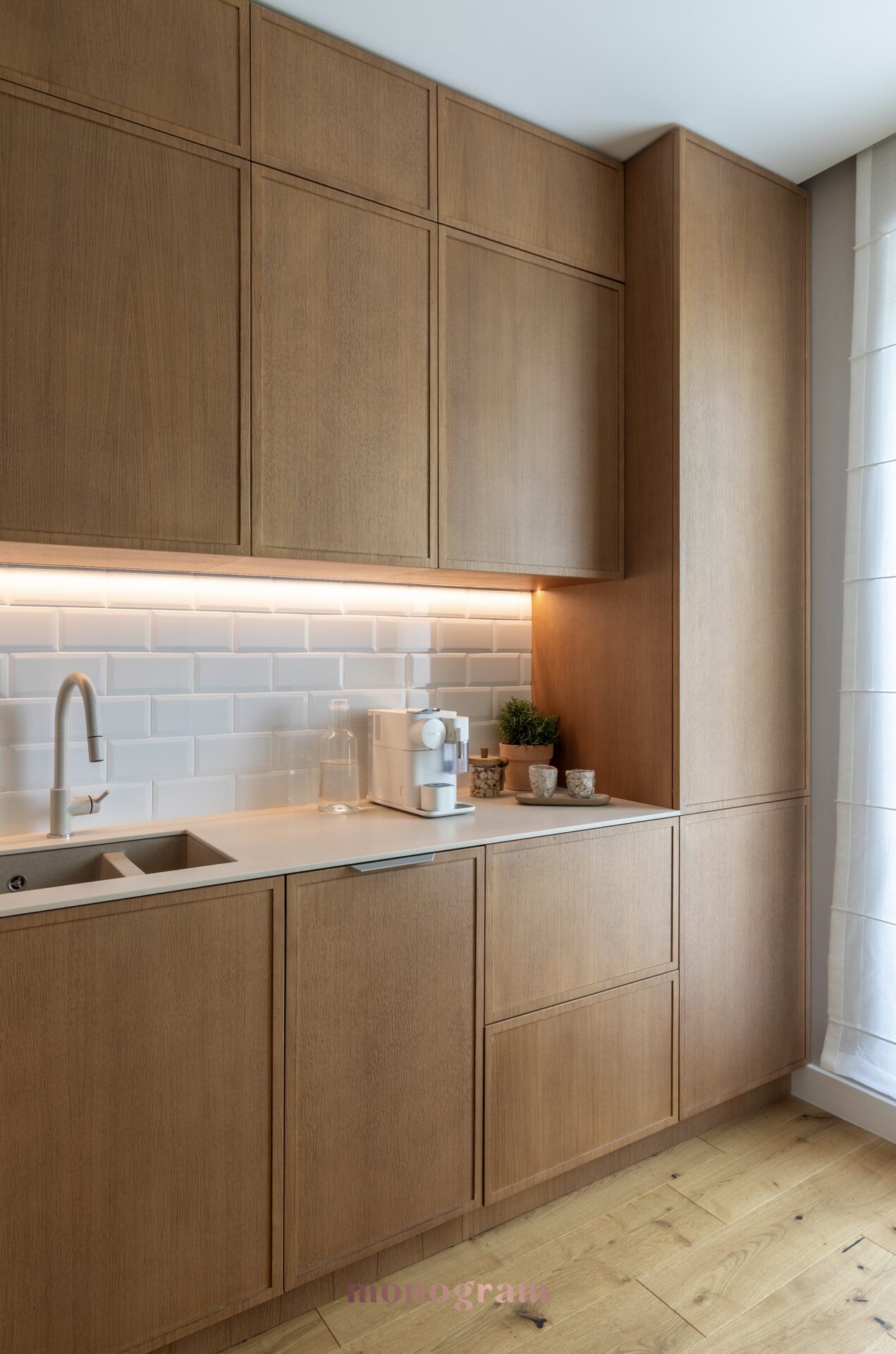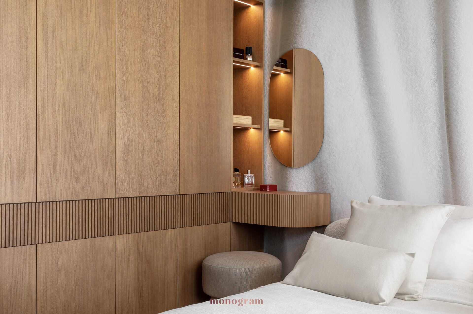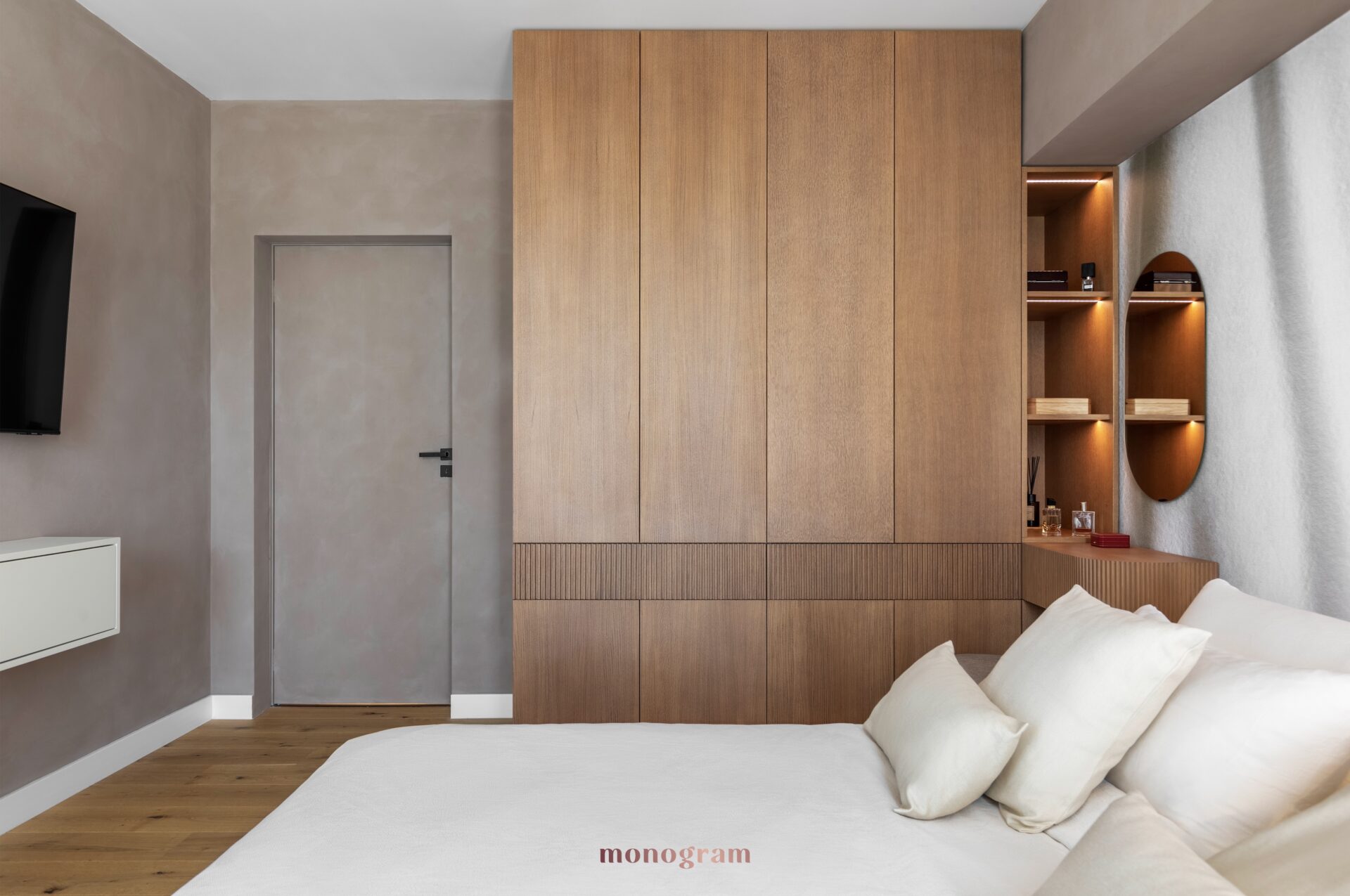 • Spații de depozitare: Dulapuri încorporate cu fațade din furnir de lemn asigură funcționalitate și se integrează armonios în design.