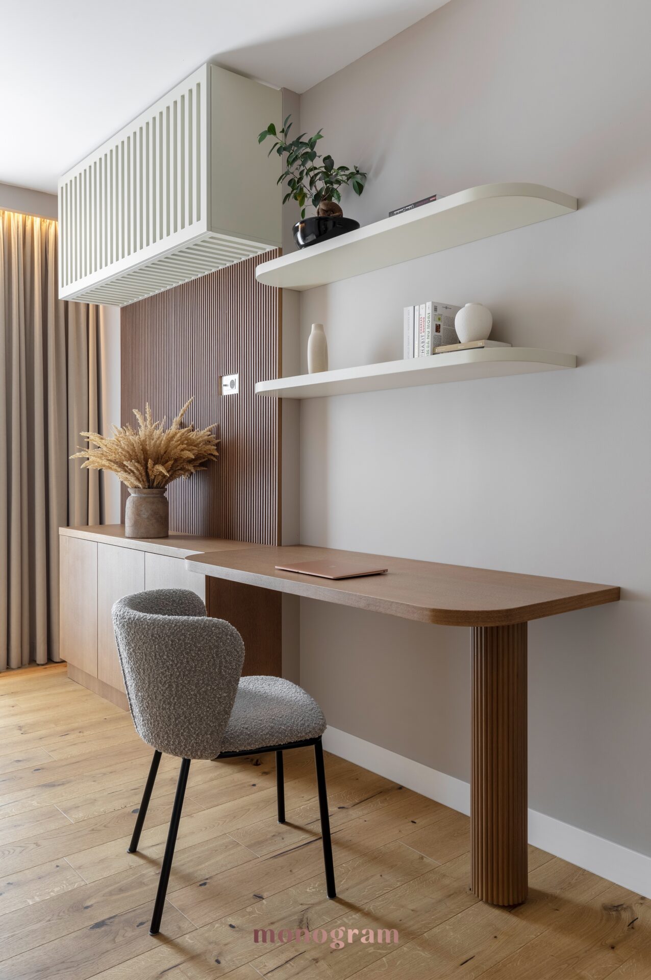 • Pardoseală: parchet din lemn, cu un finisaj natural și cald, care ancorează designul.