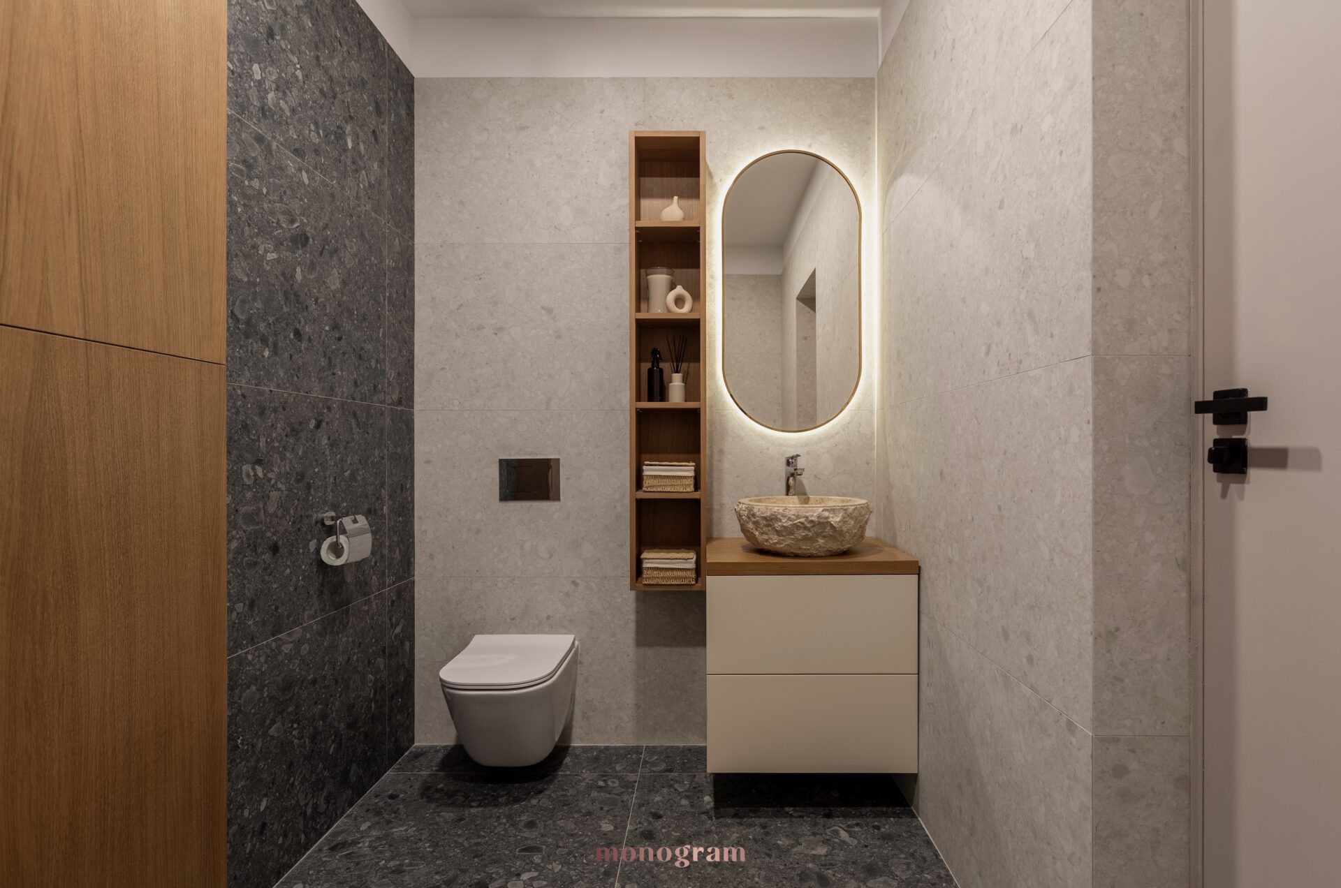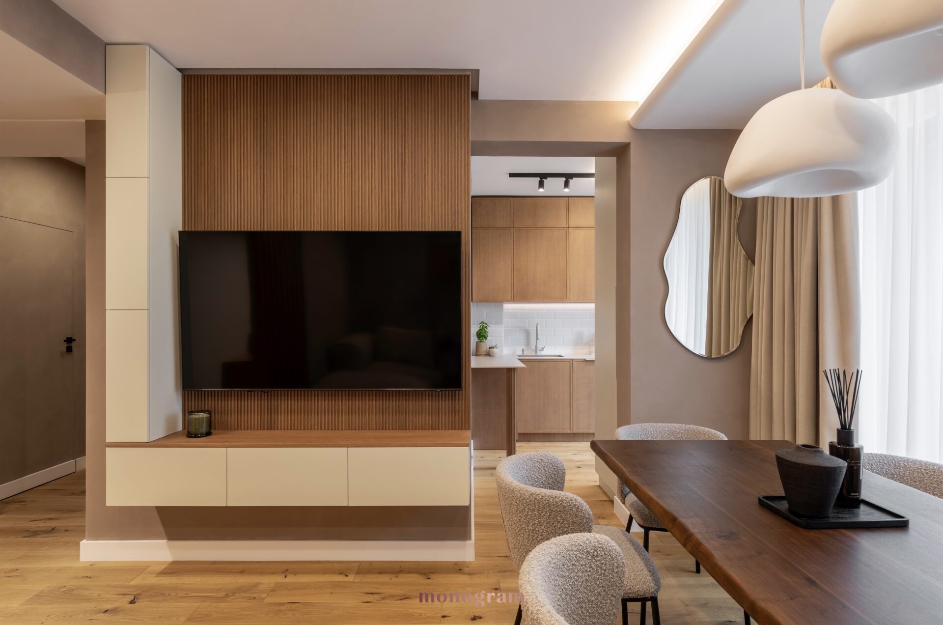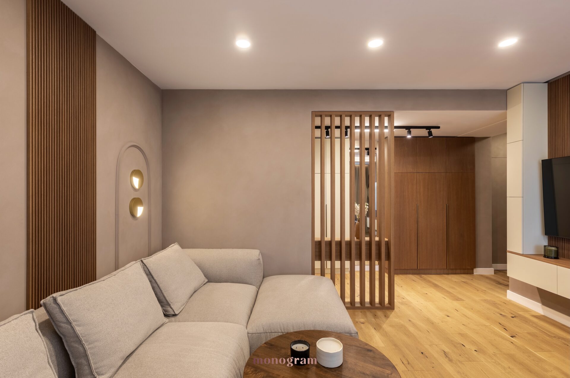 Atmosferă și atracție Acest interior de 71 mp este mai mult decât un spațiu de locuit—este o experiență de liniște și conectare cu natura. Combinația de tonuri calde, materiale tactile și iluminat dinamic creează o atmosferă care invită la relaxare și mindfulness. Îmbinând perfect filosofia Wabi-Sabi cu funcționalitatea modernă, acest design pune în valoare frumusețea simplității și puterea detaliilor bine gândite.