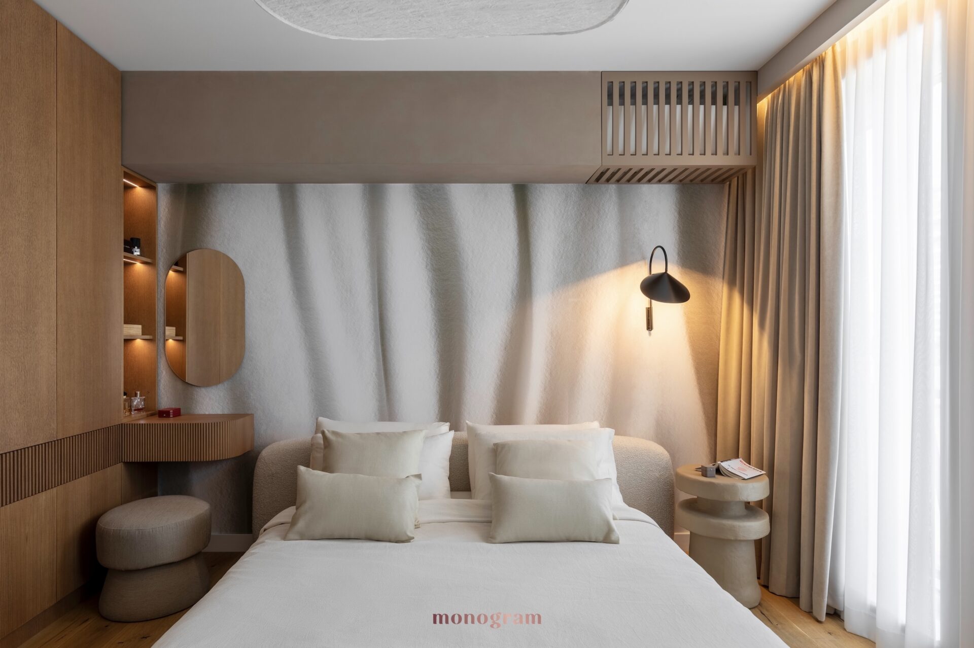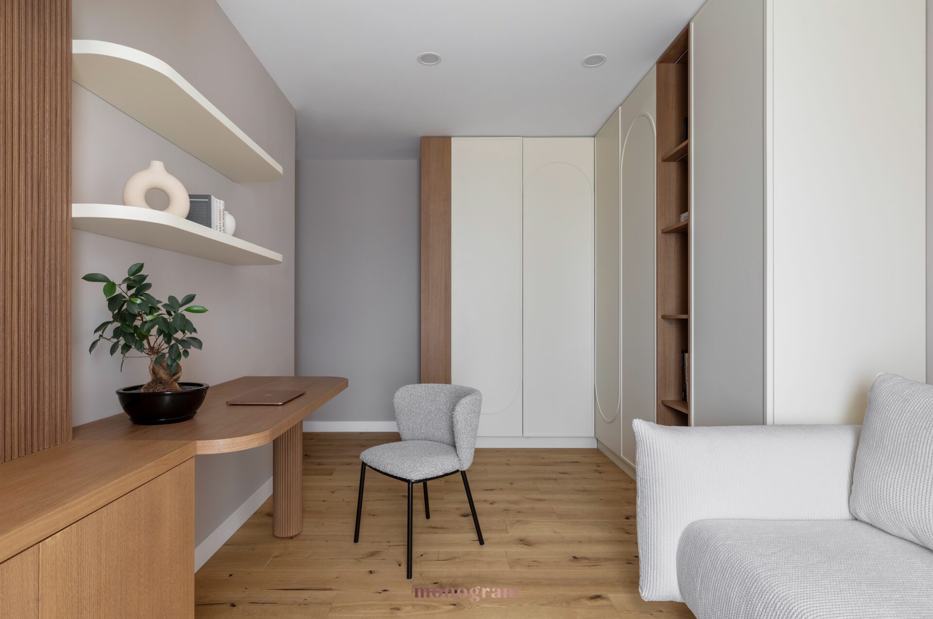 Bazat pe principiile Wabi-Sabi, designul propus celebrează autenticitatea materialelor naturale și frumusețea imperfecțiunilor organice. Paleta caldă, dominată de nuanțe de bej și crem, este completată de tonuri bogate de lemn natural, creând un mediu primitor și liniștitor. Această abordare minimalistă este îmbogățită de elemente tactile, texturi stratificate și finisaje pământii care evocă un sentiment de echilibru și atemporalitate. Scenariile de iluminat variază de la luminozitate energizantă în timpul zilei, până la o atmosferă intimă și relaxantă seara, adaptându-se perfect stilului de viață al clientului.