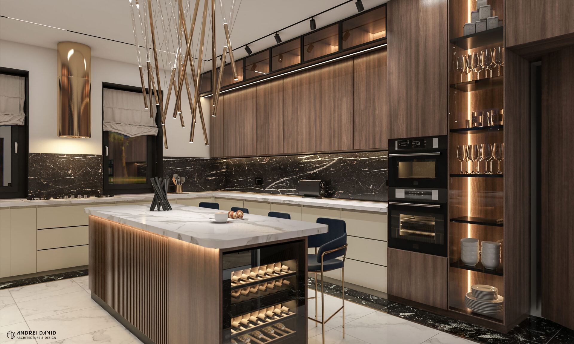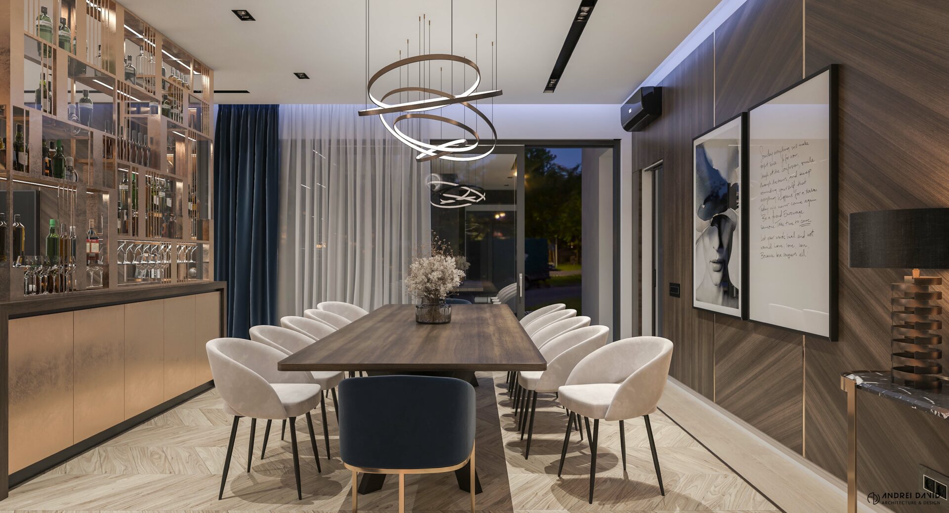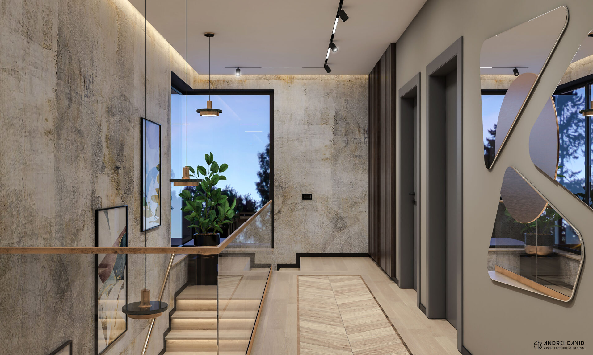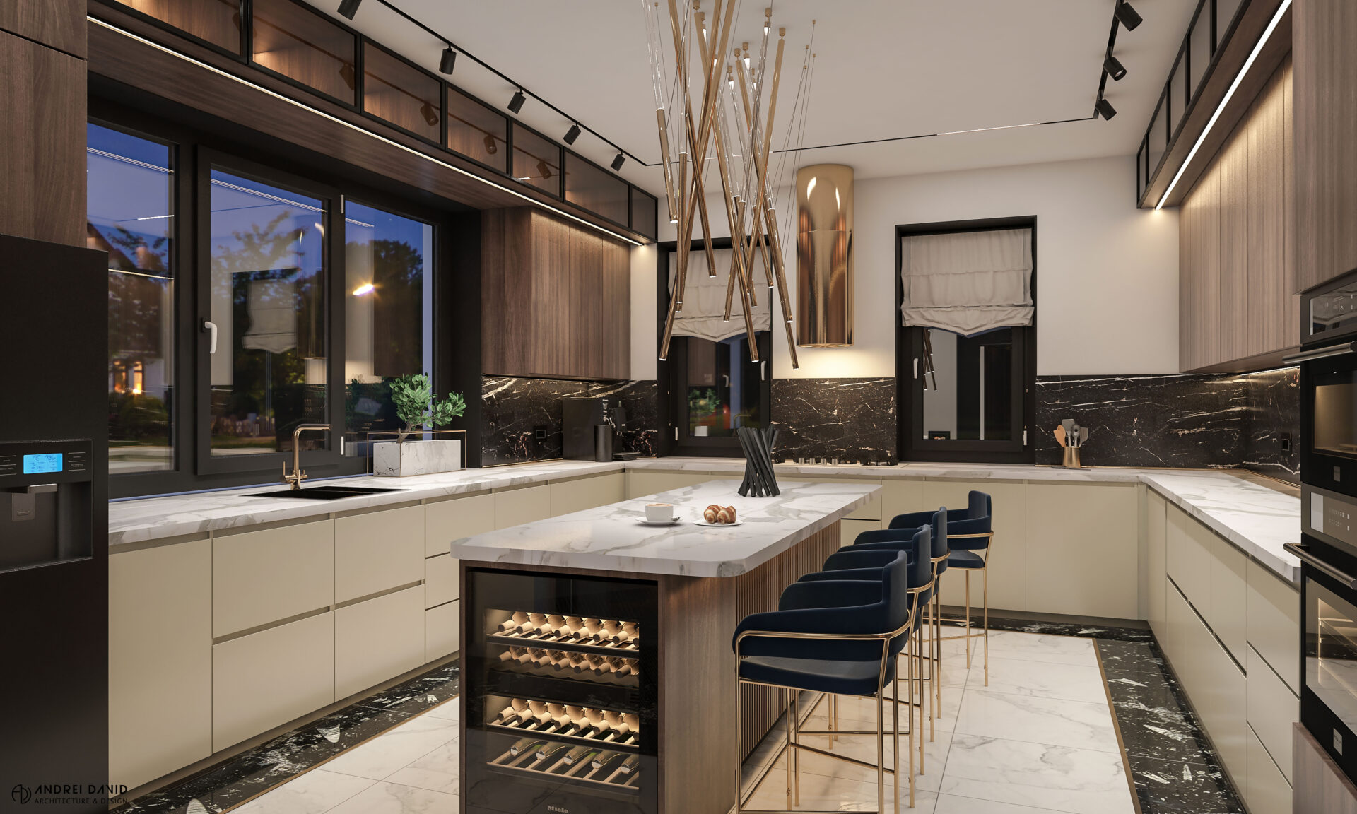 Spațiul interior al acestei locuințe a fost conceput pe baza cerinței esențiale a beneficiarilor : luxury dar nu rece, ci primitor. Inima casei, livingul generos de aproximativ 70 mp este cel care dă tonul amenajării. Marea provocare aici a fost de a separa zona de lounge de cea de dining, păstrând în același timp senzația de spațiu unitar. Pe lângă living, la parter amenajarea a inclus și : bucătărie cu terasă, birou, baie și hol intrare. Pentru etaj, zona de noapte e compusă din 4 dormitoare, dintre care unul matrimonial cu dressing și baie proprie, baie oaspeți și baie copii. Prin această amenajare am propus folosirea de materiale, finisaje și obiecte din gama premium, care împreună cu mobilierul și iluminatul arhitectural creează o ambianță elegantă și plină de rafinament.