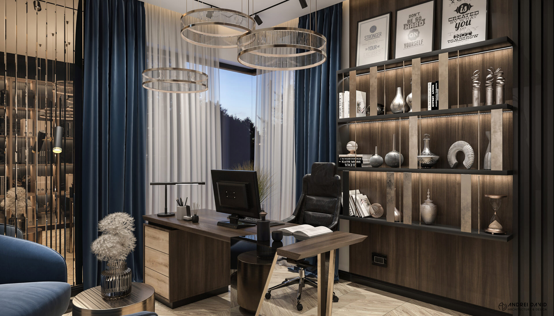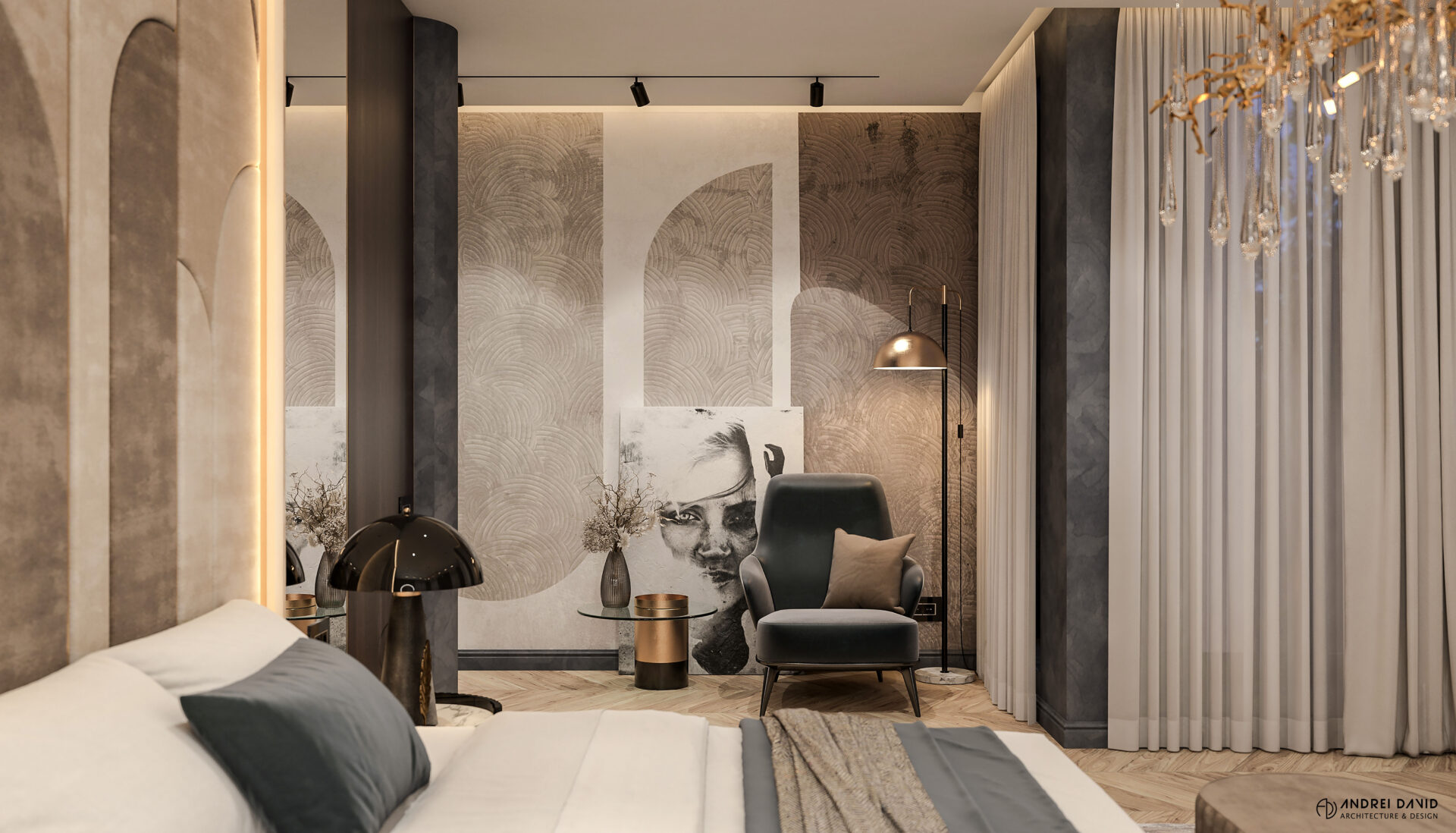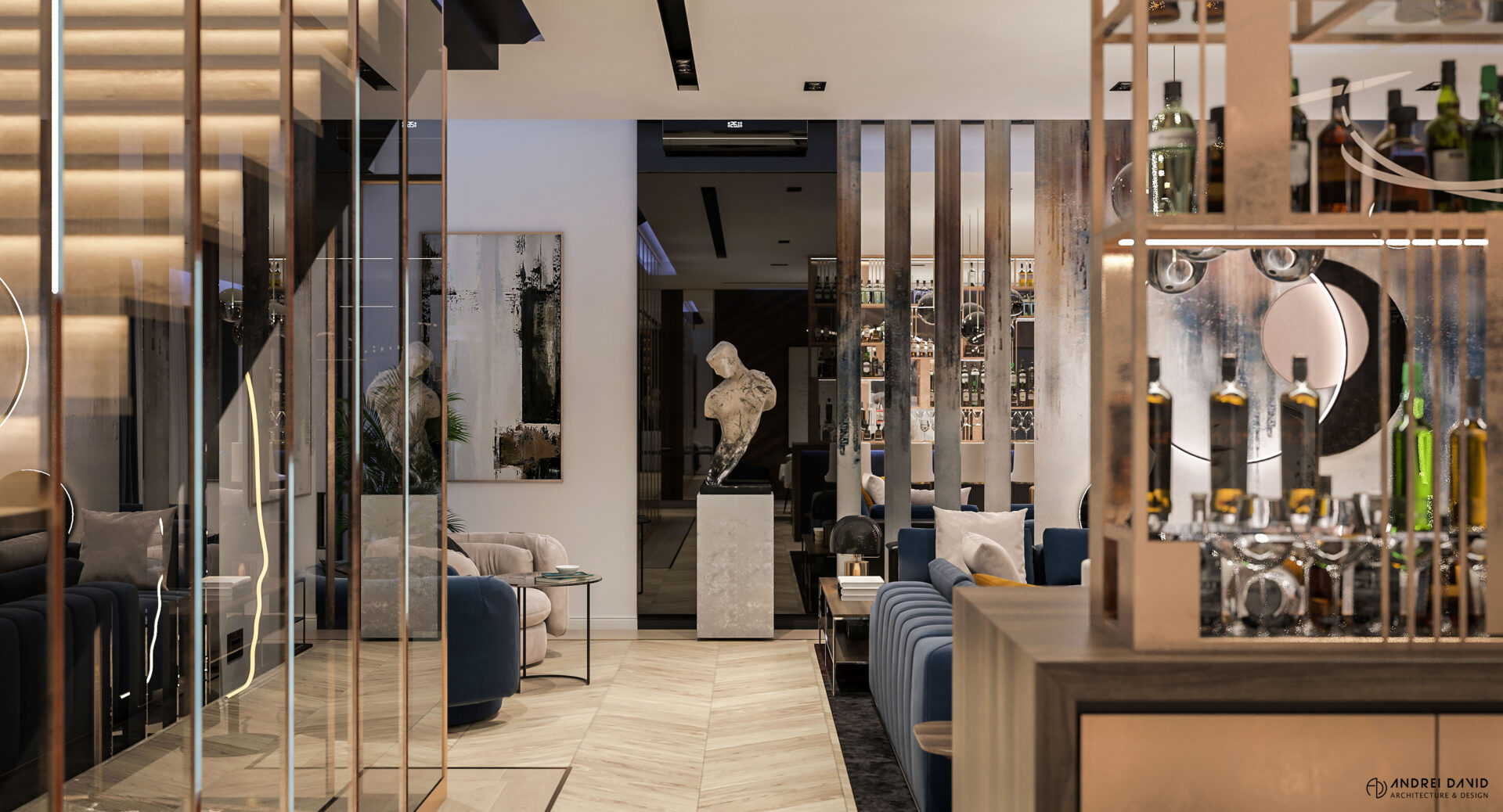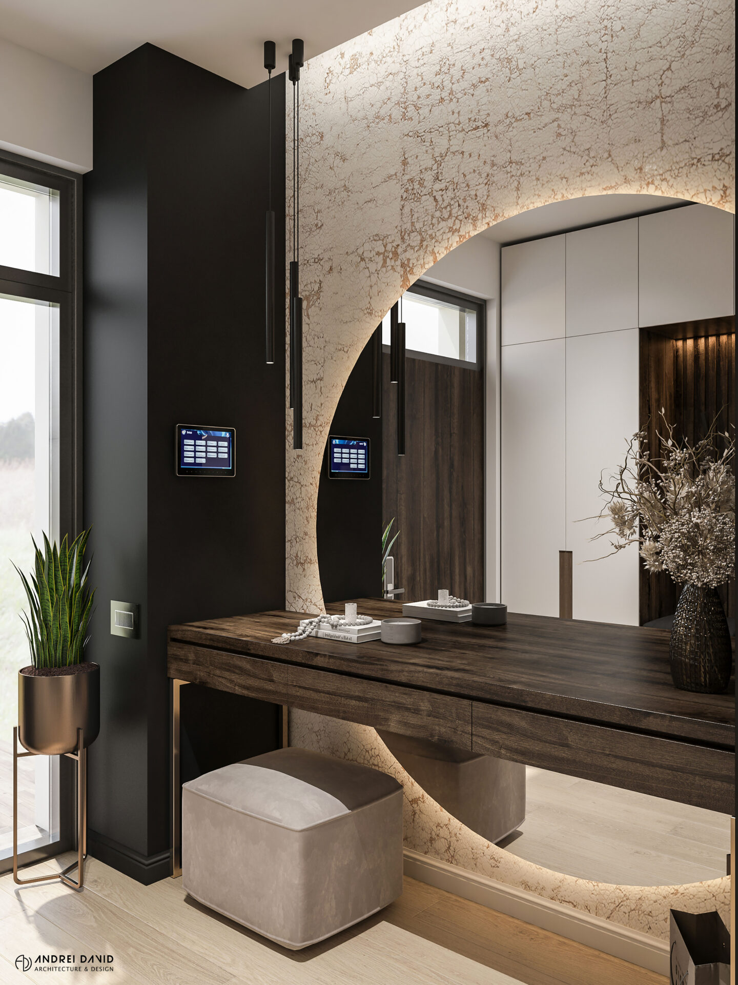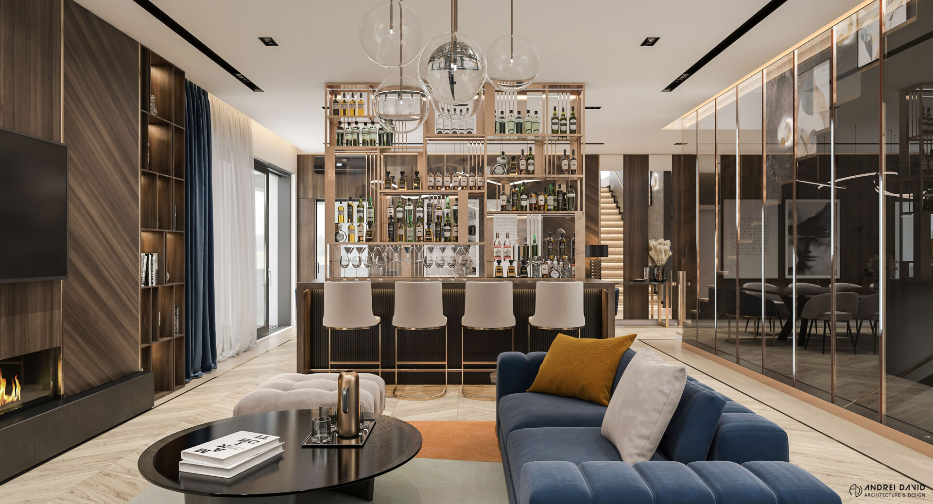 Spațiul interior al acestei locuințe a fost conceput pe baza cerinței esențiale a beneficiarilor : luxury dar nu rece, ci primitor. Inima casei, livingul generos de aproximativ 70 mp este cel care dă tonul amenajării. Marea provocare aici a fost de a separa zona de lounge de cea de dining, păstrând în același timp senzația de spațiu unitar. Pe lângă living, la parter amenajarea a inclus și : bucătărie cu terasă, birou, baie și hol intrare. Pentru etaj, zona de noapte e compusă din 4 dormitoare, dintre care unul matrimonial cu dressing și baie proprie, baie oaspeți și baie copii. Prin această amenajare am propus folosirea de materiale, finisaje și obiecte din gama premium, care împreună cu mobilierul și iluminatul arhitectural creează o ambianță elegantă și plină de rafinament.