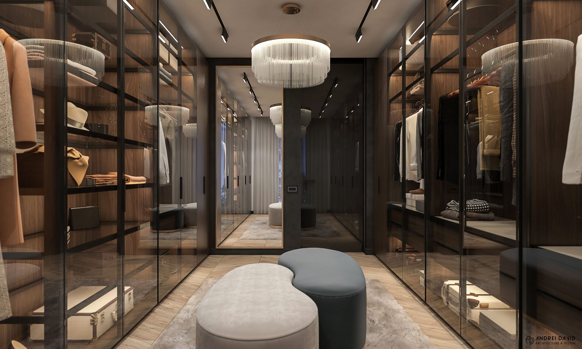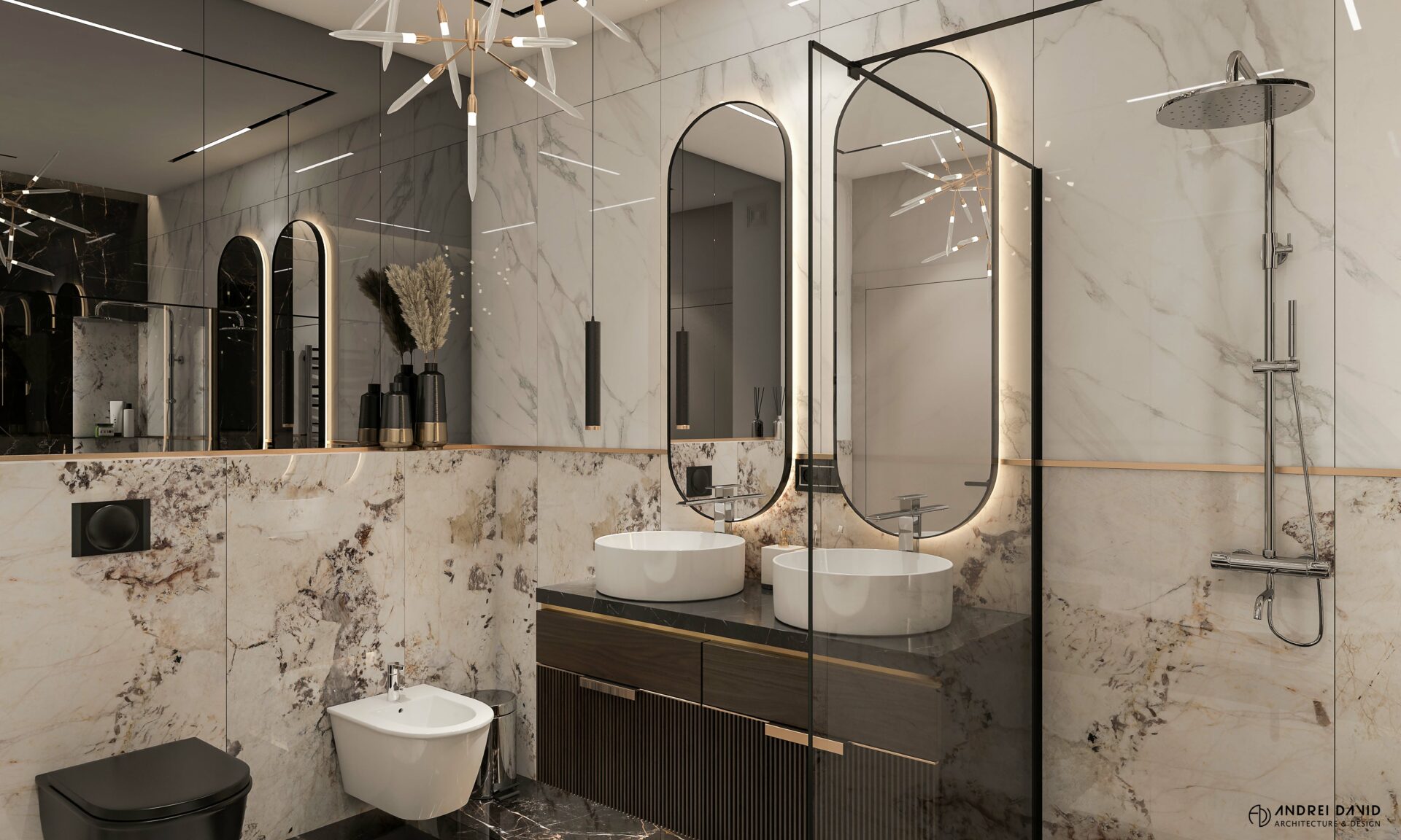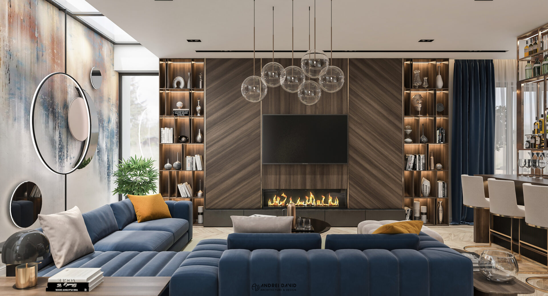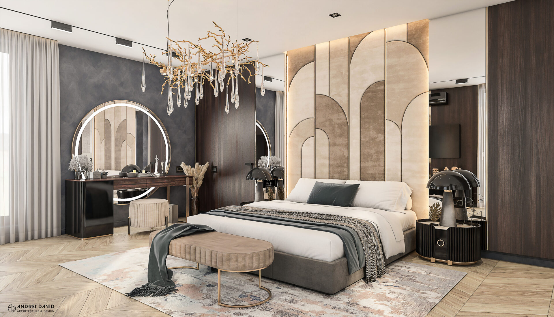 Spațiul interior al acestei locuințe a fost conceput pe baza cerinței esențiale a beneficiarilor : luxury dar nu rece, ci primitor. Inima casei, livingul generos de aproximativ 70 mp este cel care dă tonul amenajării. Marea provocare aici a fost de a separa zona de lounge de cea de dining, păstrând în același timp senzația de spațiu unitar. Pe lângă living, la parter amenajarea a inclus și : bucătărie cu terasă, birou, baie și hol intrare. Pentru etaj, zona de noapte e compusă din 4 dormitoare, dintre care unul matrimonial cu dressing și baie proprie, baie oaspeți și baie copii. Prin această amenajare am propus folosirea de materiale, finisaje și obiecte din gama premium, care împreună cu mobilierul și iluminatul arhitectural creează o ambianță elegantă și plină de rafinament.